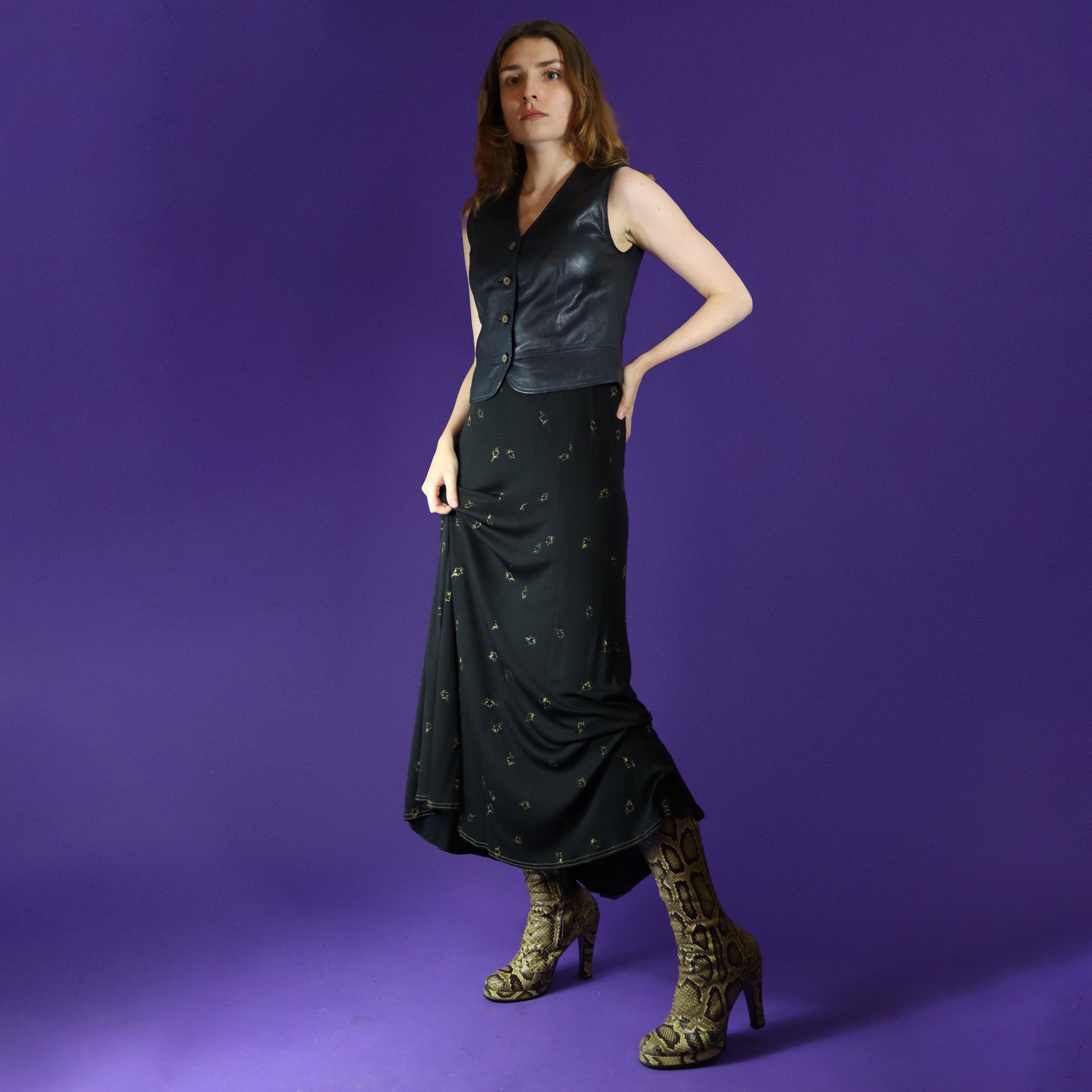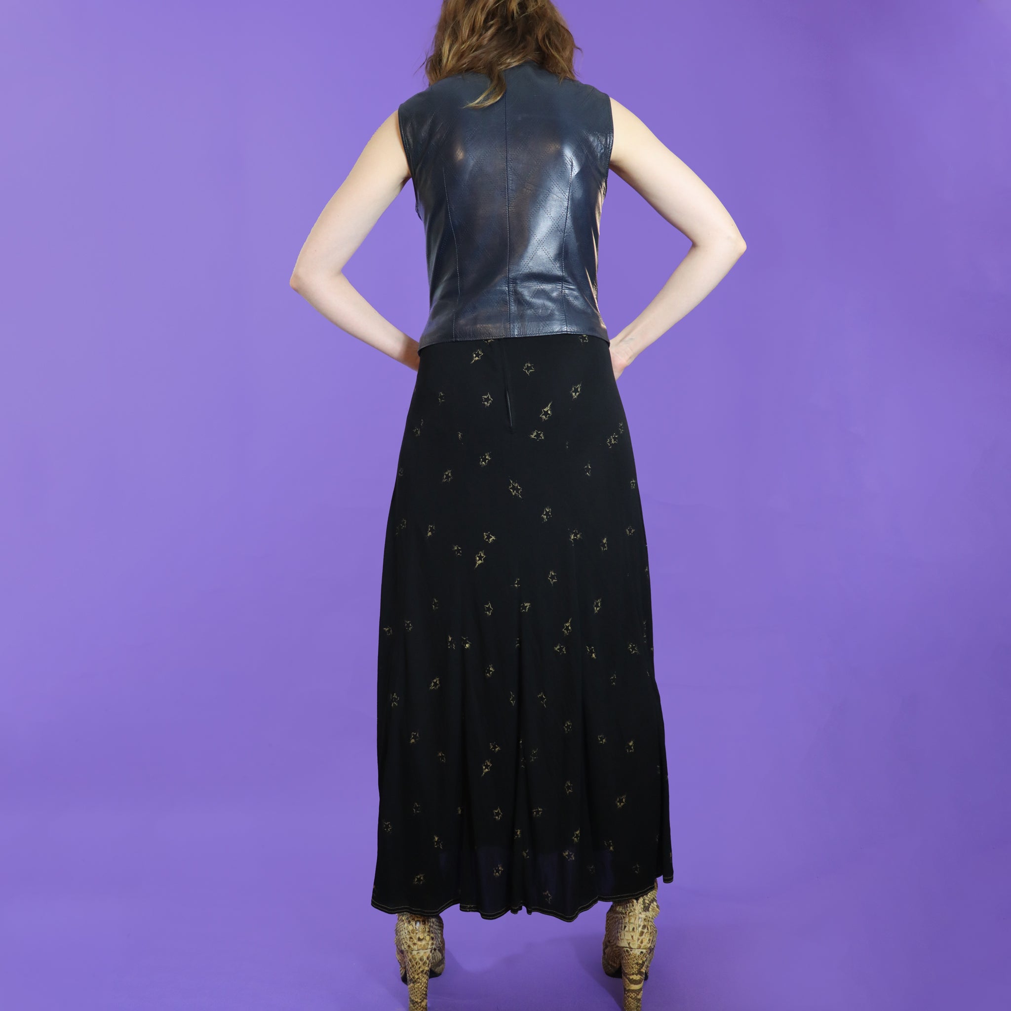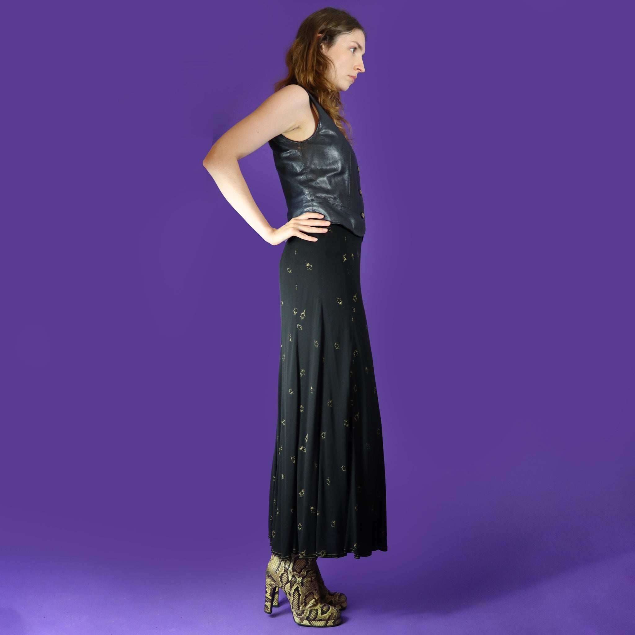 Vintage 1970s rayon crepe maxi skirt by iconic London designer Jean Muir. Muir was renowned for her innovative liquid rayon crepe which is soft, lightweight and hangs so beautifully on wear. Black with a fabulous shooting star design in golden yellow all over, with matching double stitch. Cut with a high waistband, clever pleating to create movement and a button & zipper closure. An incredibly flattering skirt in such a great print. A rare and collectible piece of fashion history.