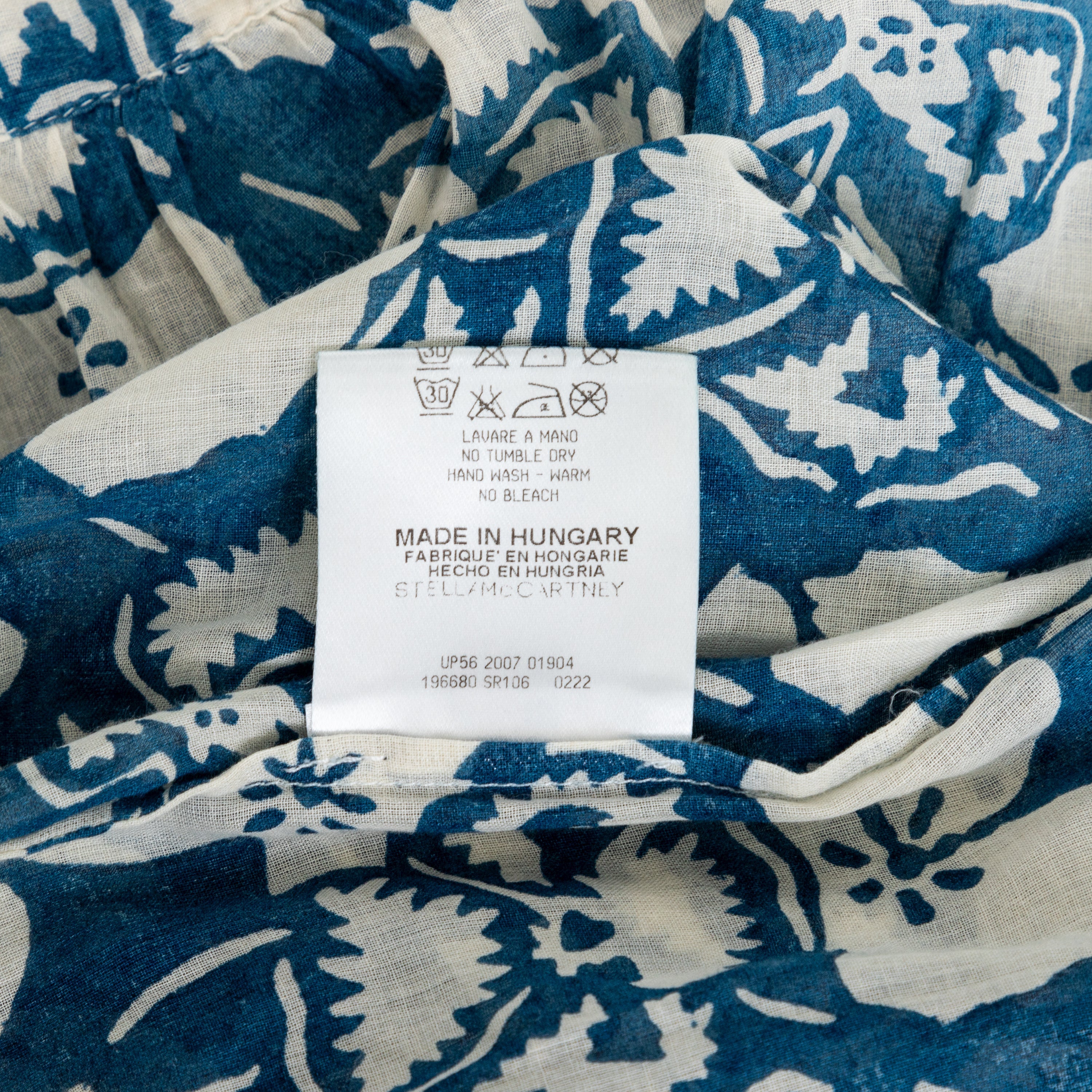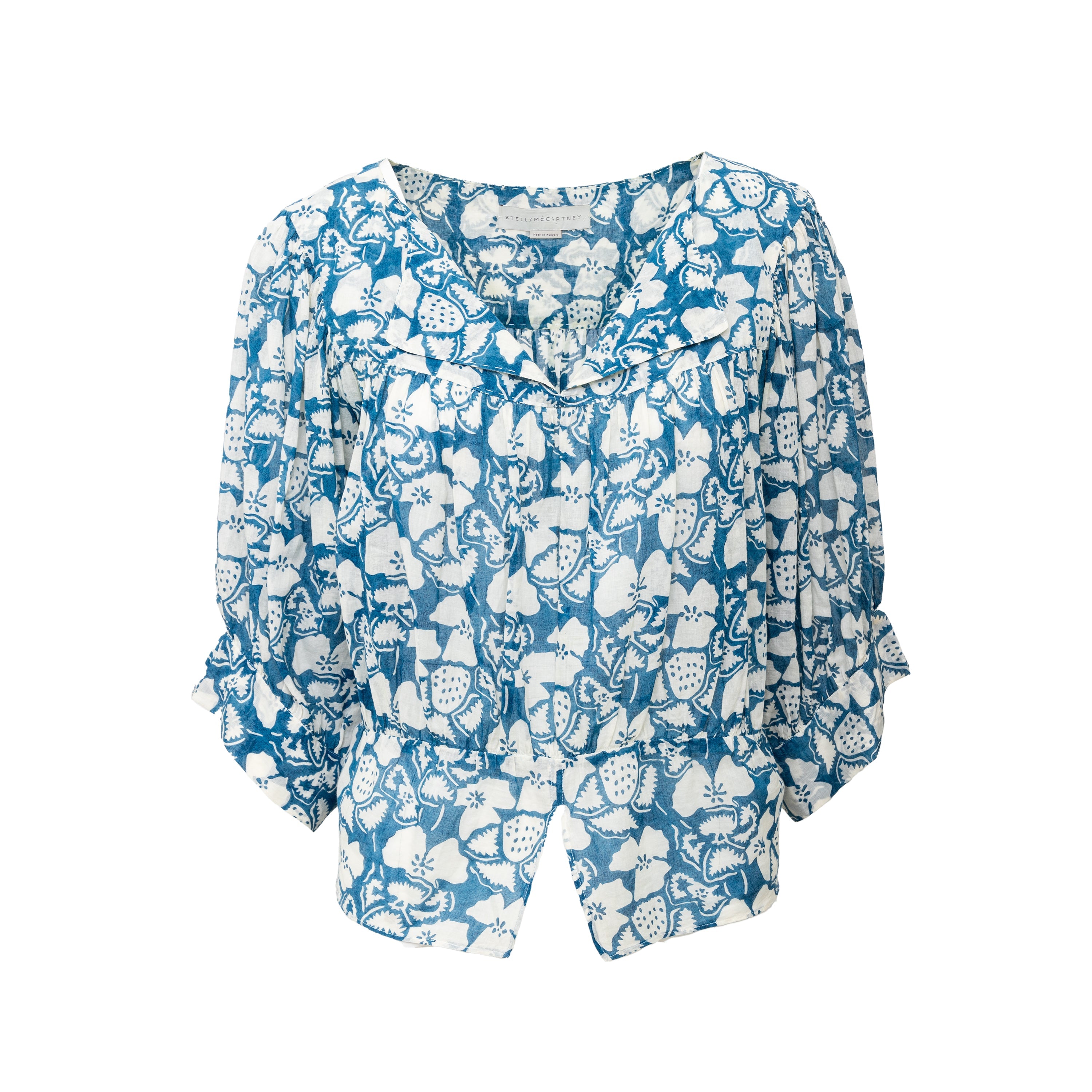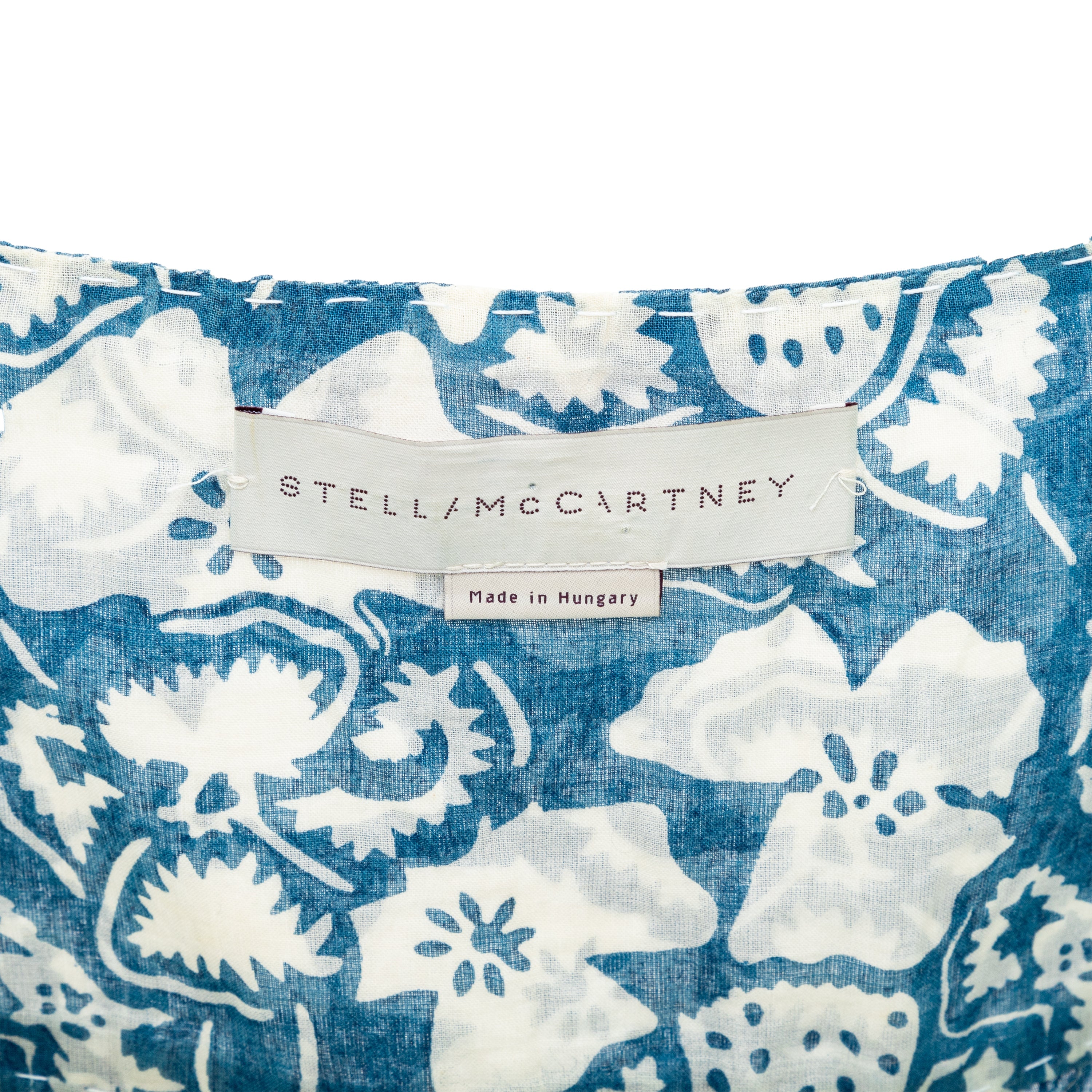 Elevate your summer style with the Stella McCartney Patterned Blouse. Made from soft, breathable cotton, this blue and white blouse features a boat neckline and short sleeves for a comfortable and chic look.