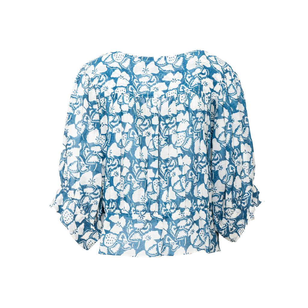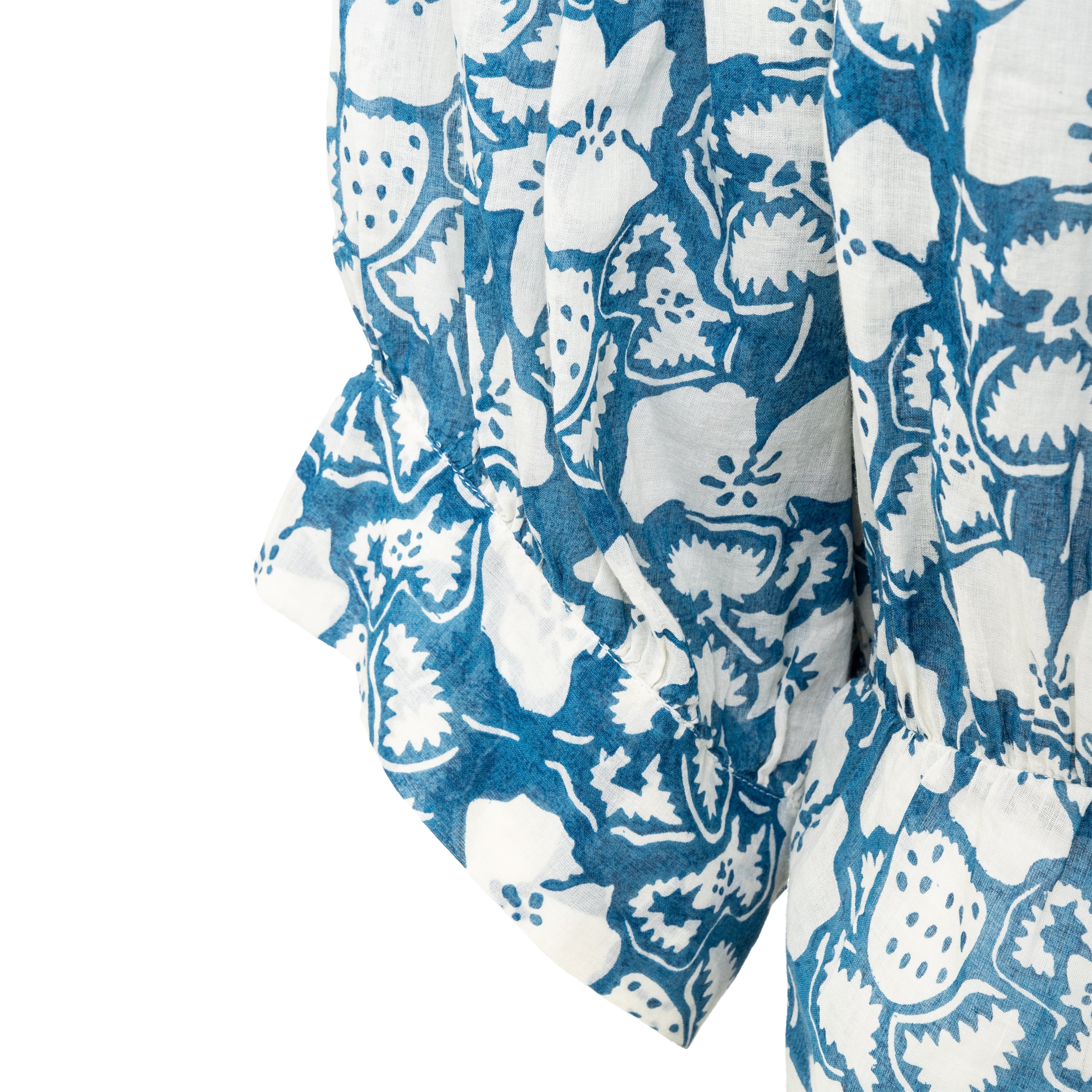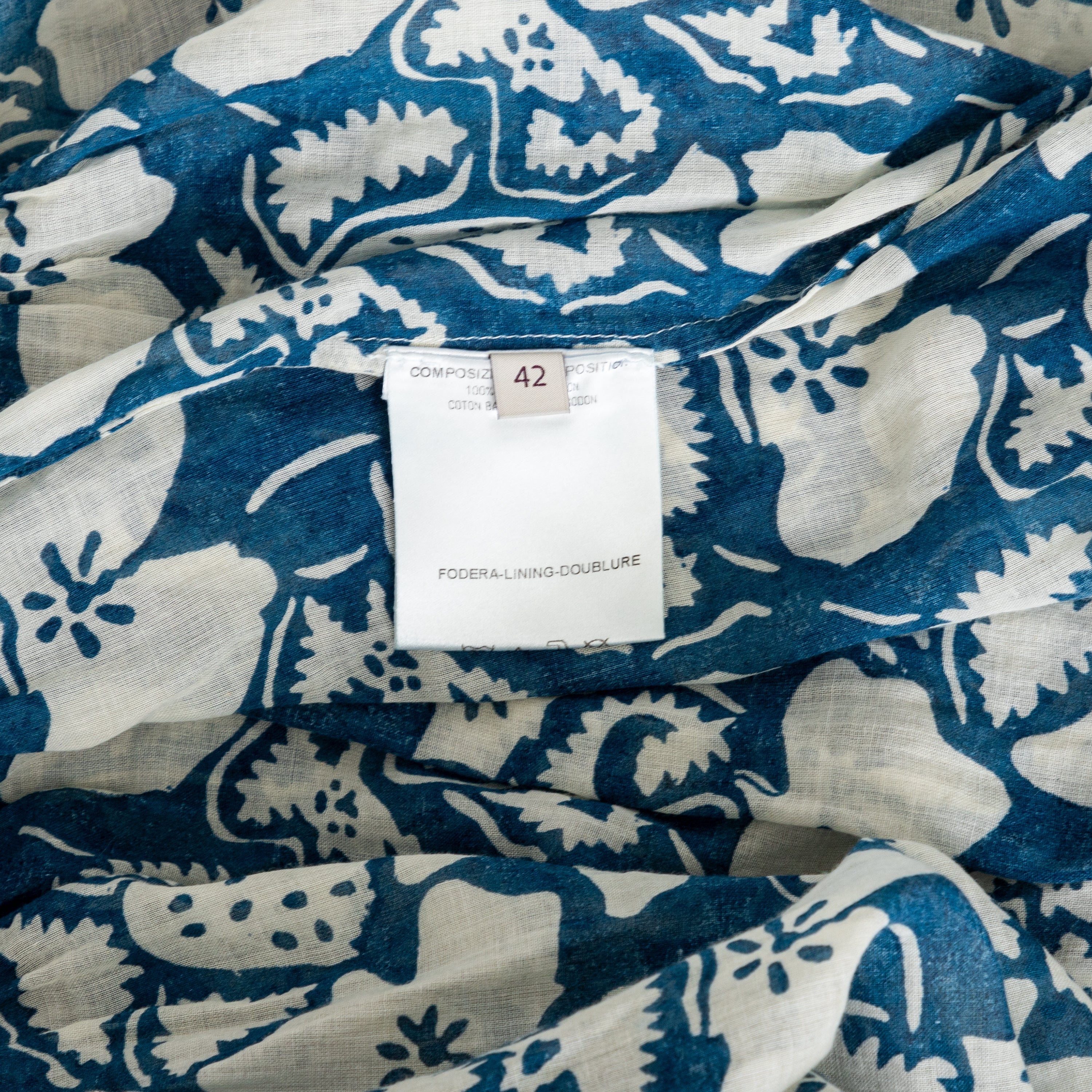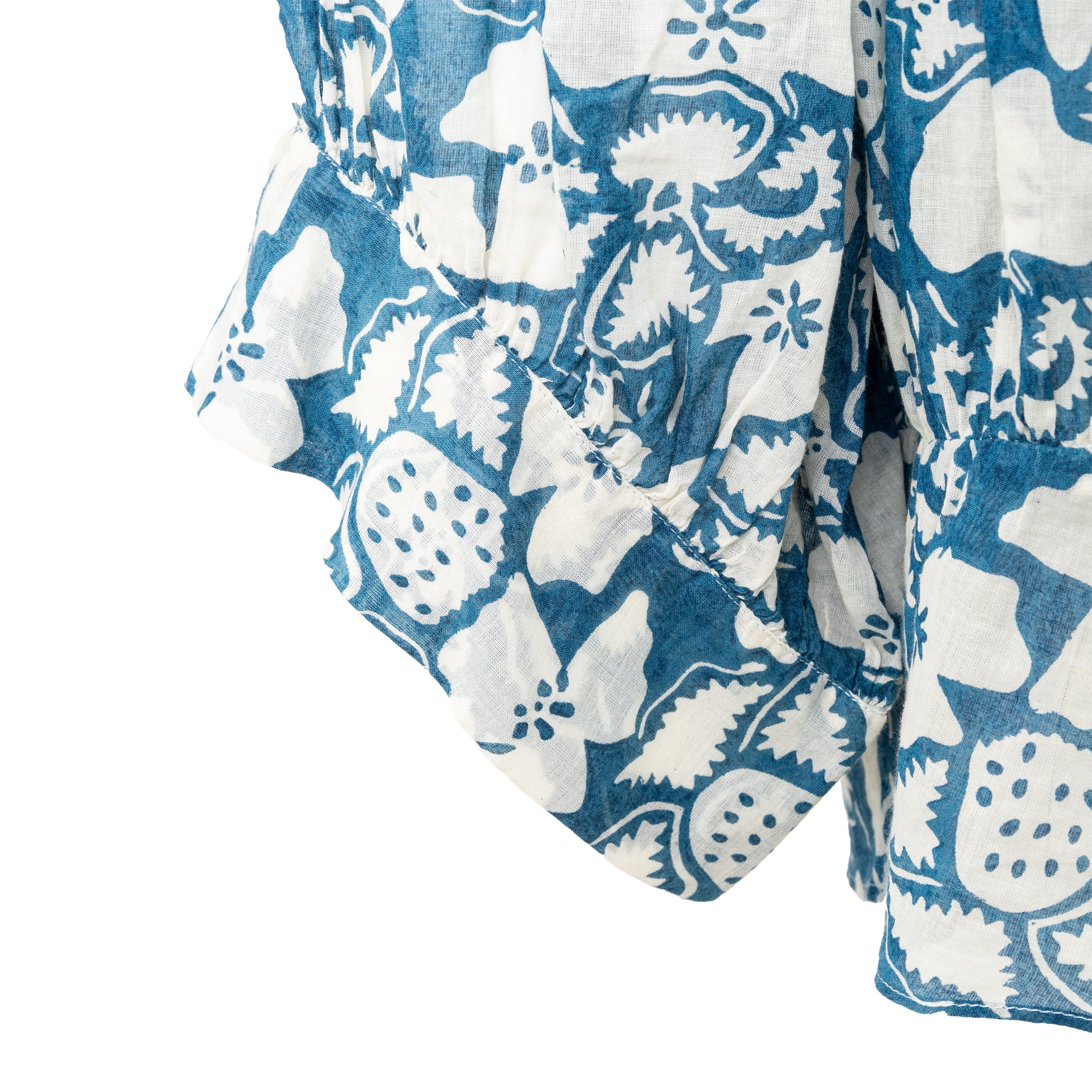 Elevate your summer style with the Stella McCartney Patterned Blouse. Made from soft, breathable cotton, this blue and white blouse features a boat neckline and short sleeves for a comfortable and chic look.