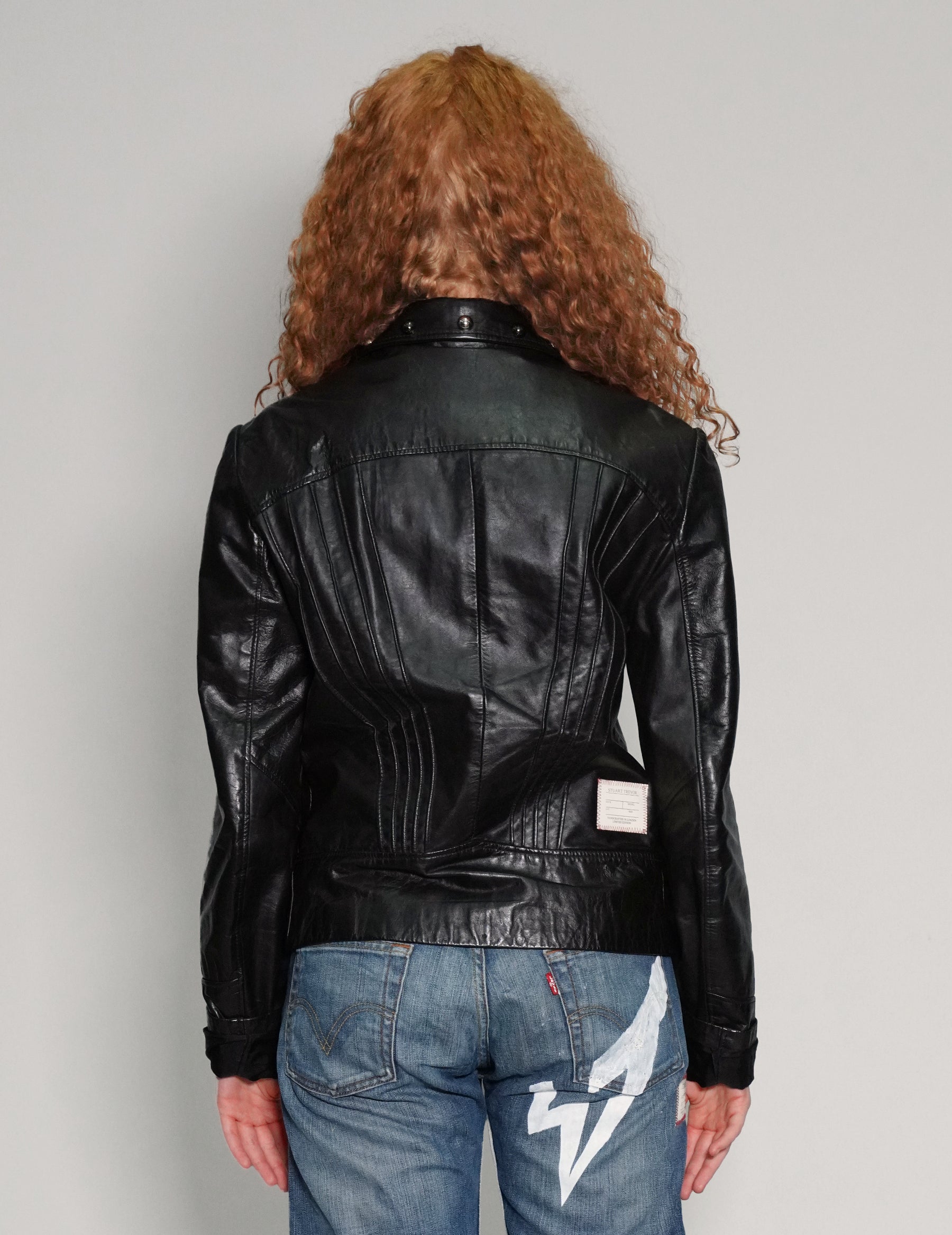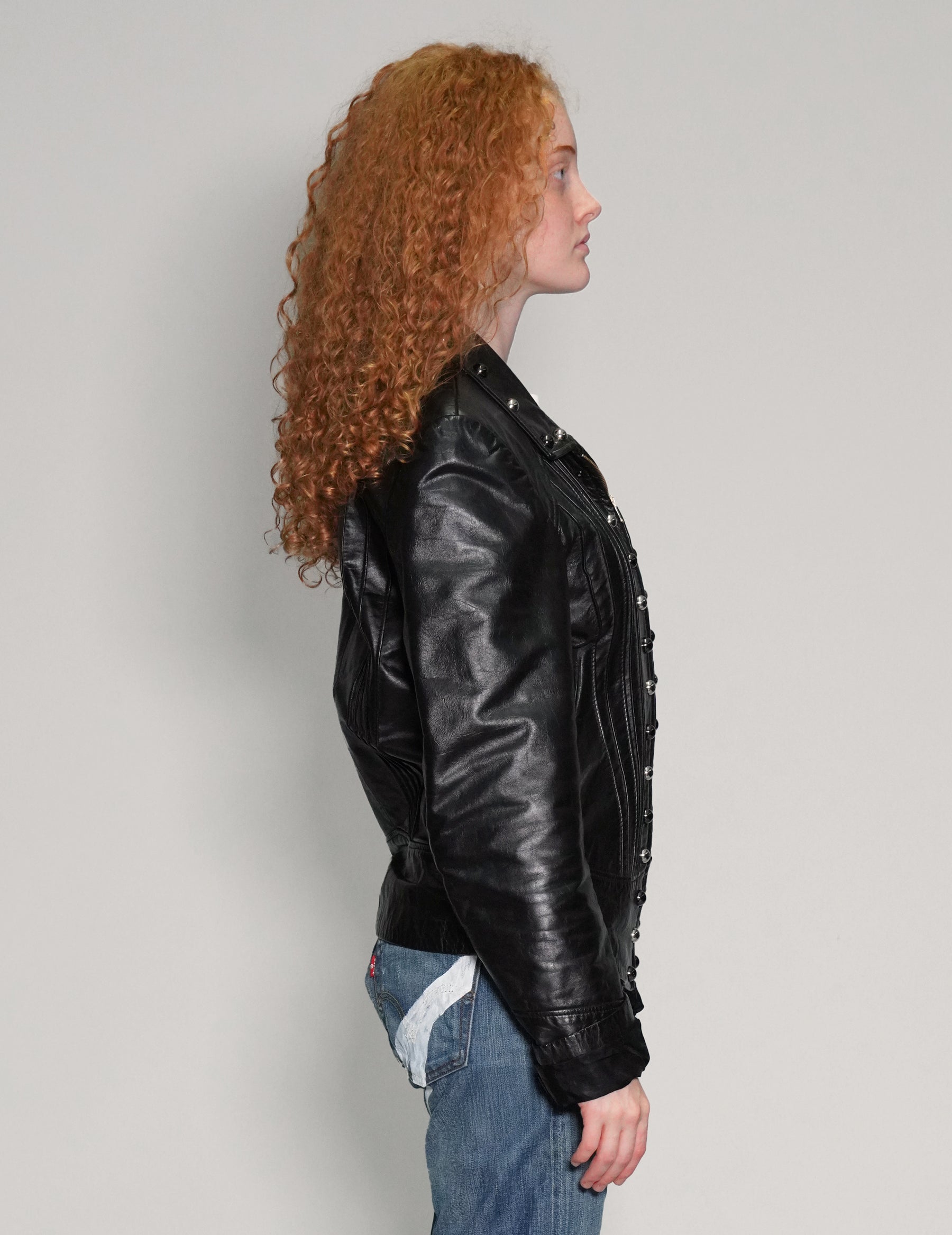 Vintage Marquis of London leather jacket with huge dome studs in alternating gunmetal and nickel finishes with beautiful pin tuck detailing on the front. 100% Leather. Zip fastening front, inside breast pocket and slit waist pockets. Ideal for adding some biker attitude to your autumnal fits.