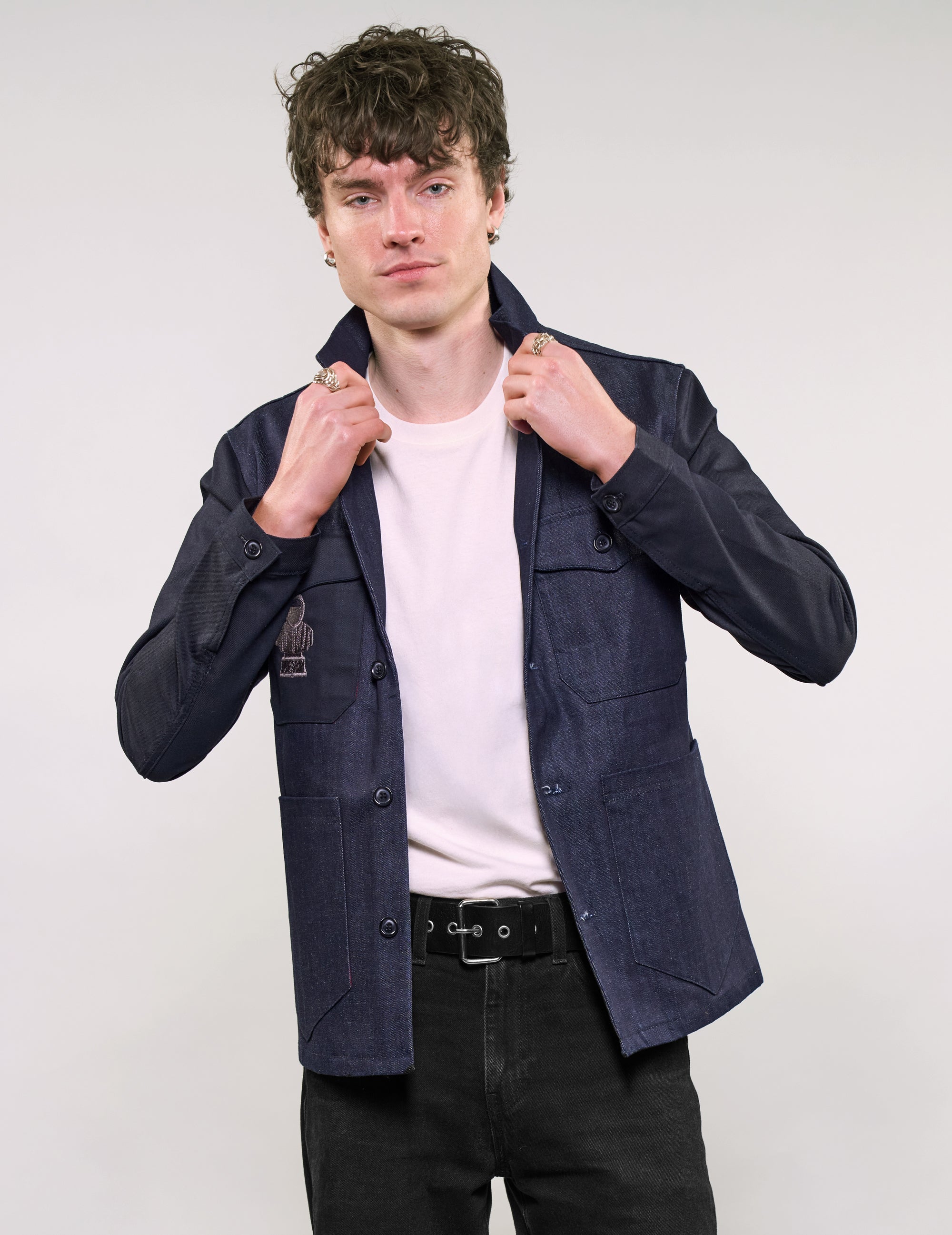 Repurposed Denim Chore Jacket. 100% Cotton, and Bust embroidery on the right breast. Features double breast button-fastened flap pockets, and double hip sack pockets. ST Walk the Line Logo on the back in silver.