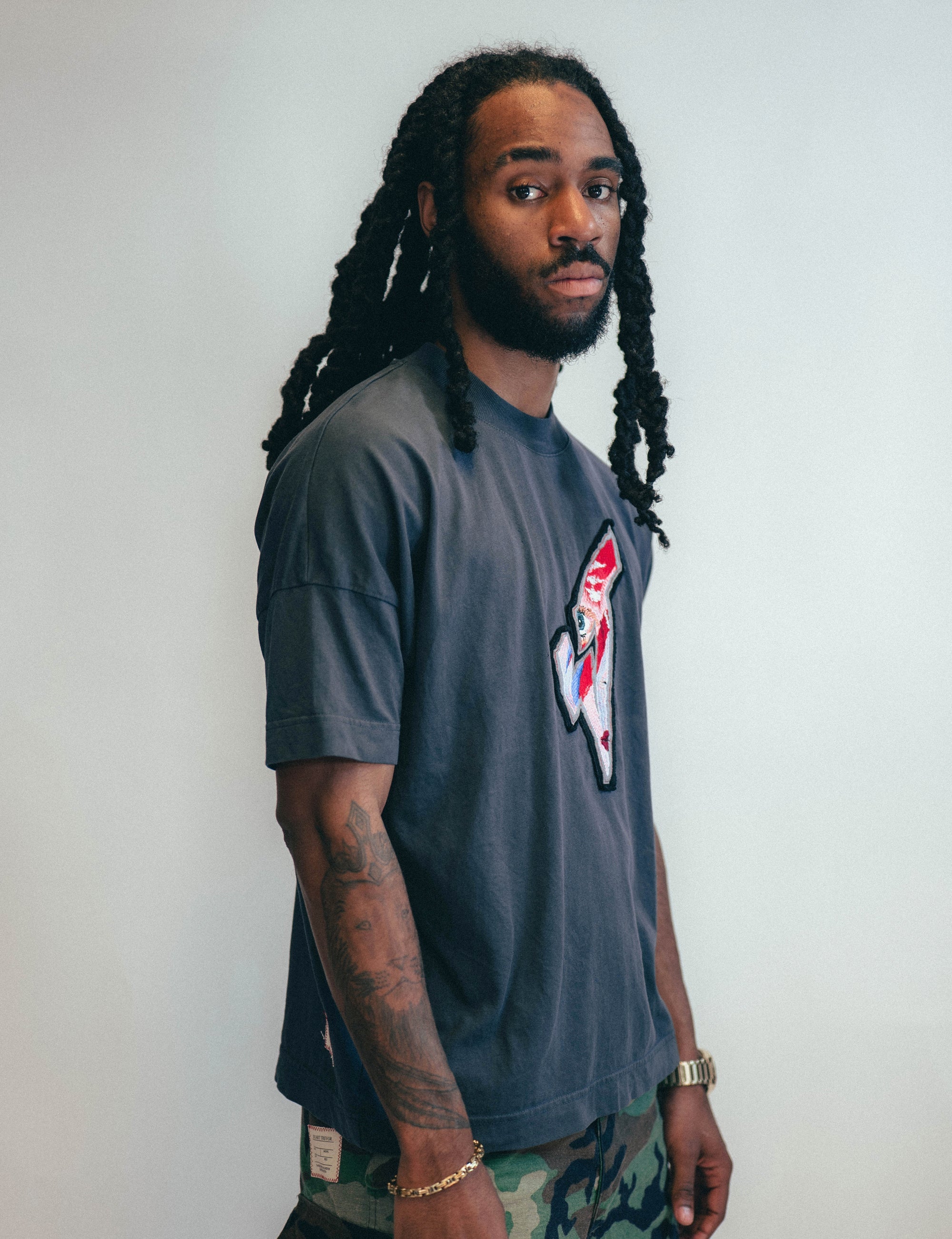 Mens Bluish Grey t-shirt crafted from soft, GOTS certified, 100% organic recycled cotton with relaxed fit with large embroidered ST patch, featuring the eye of Aladdin Sane from our favourite Rock n Roll icon.