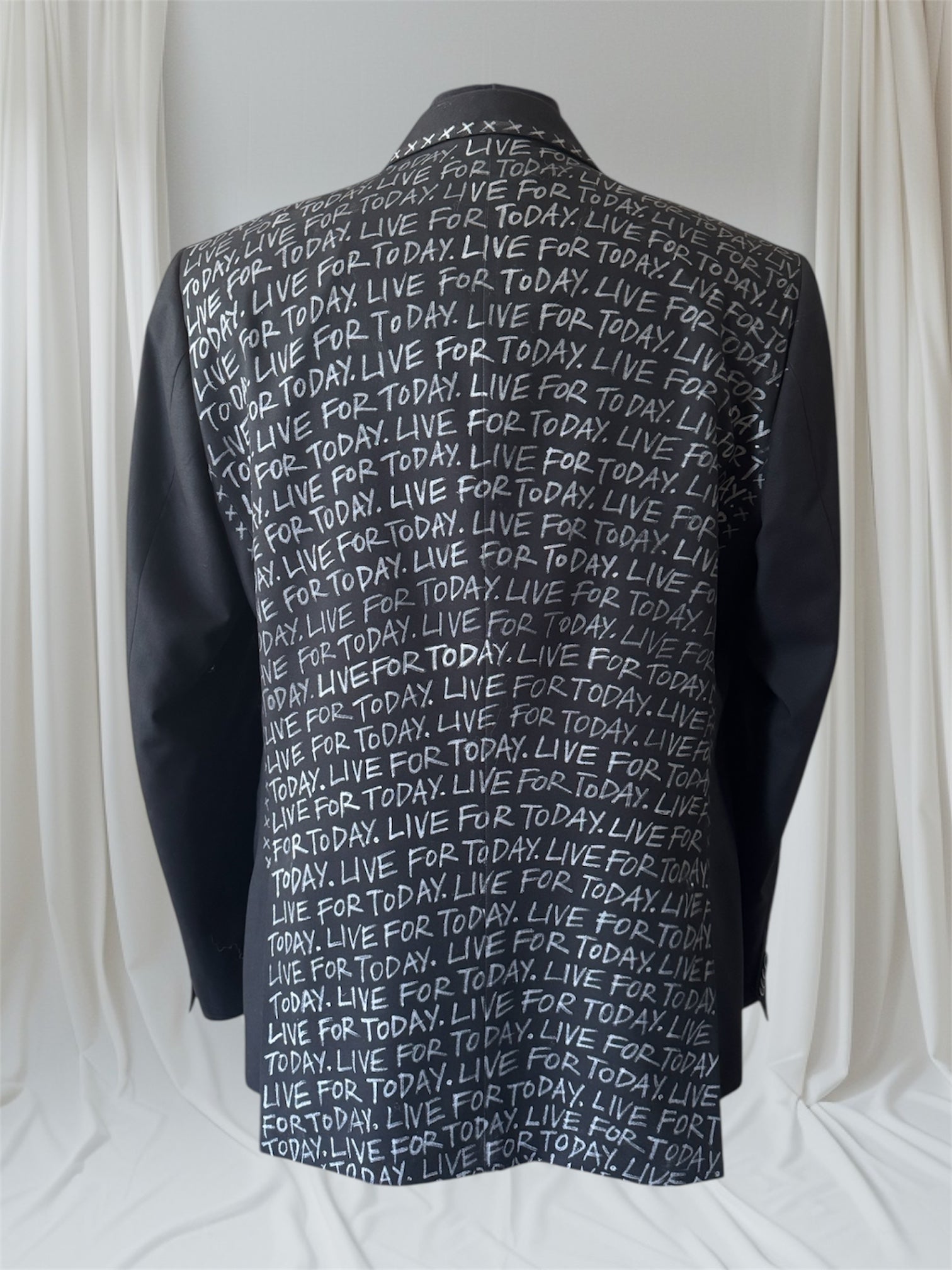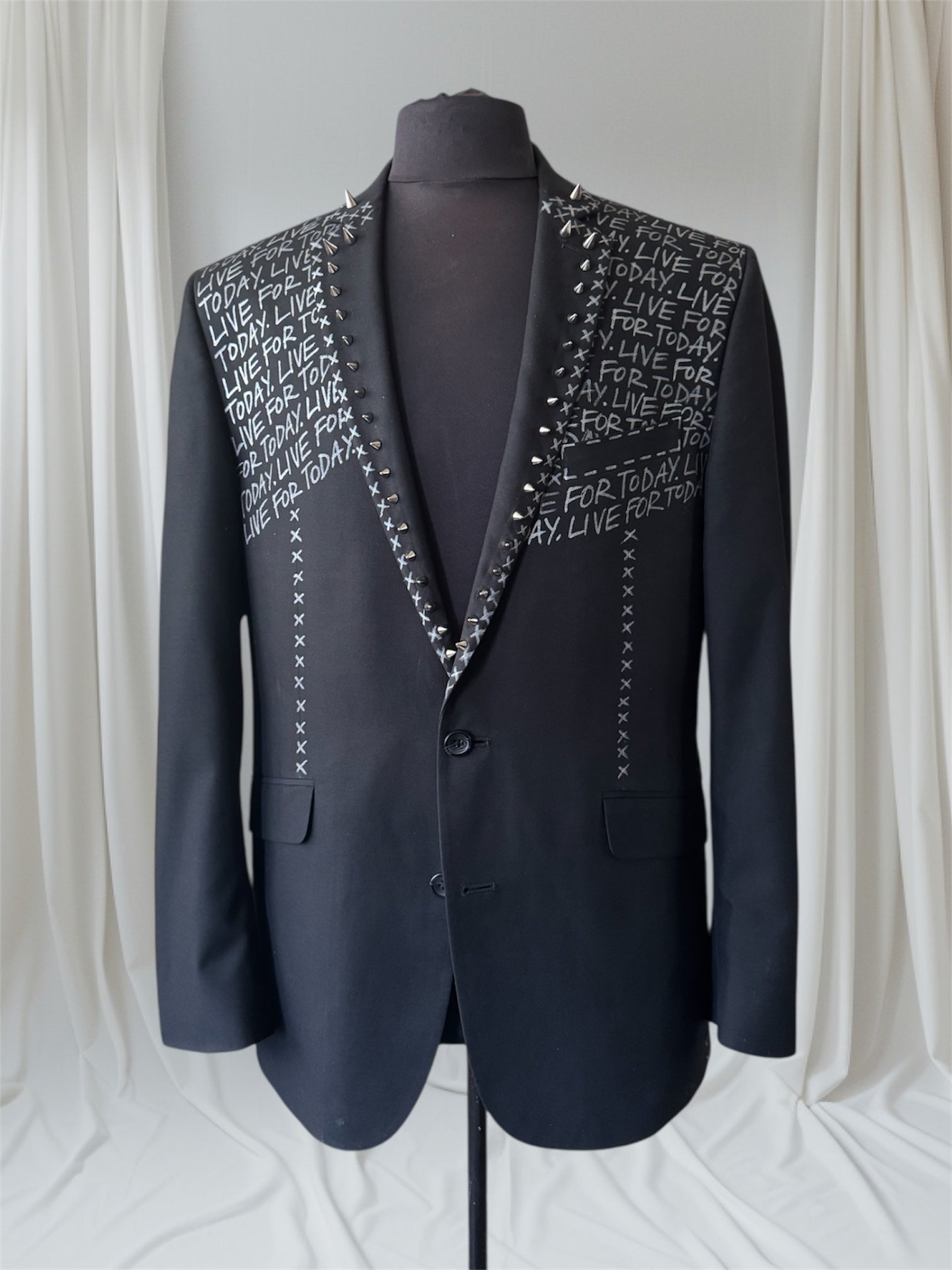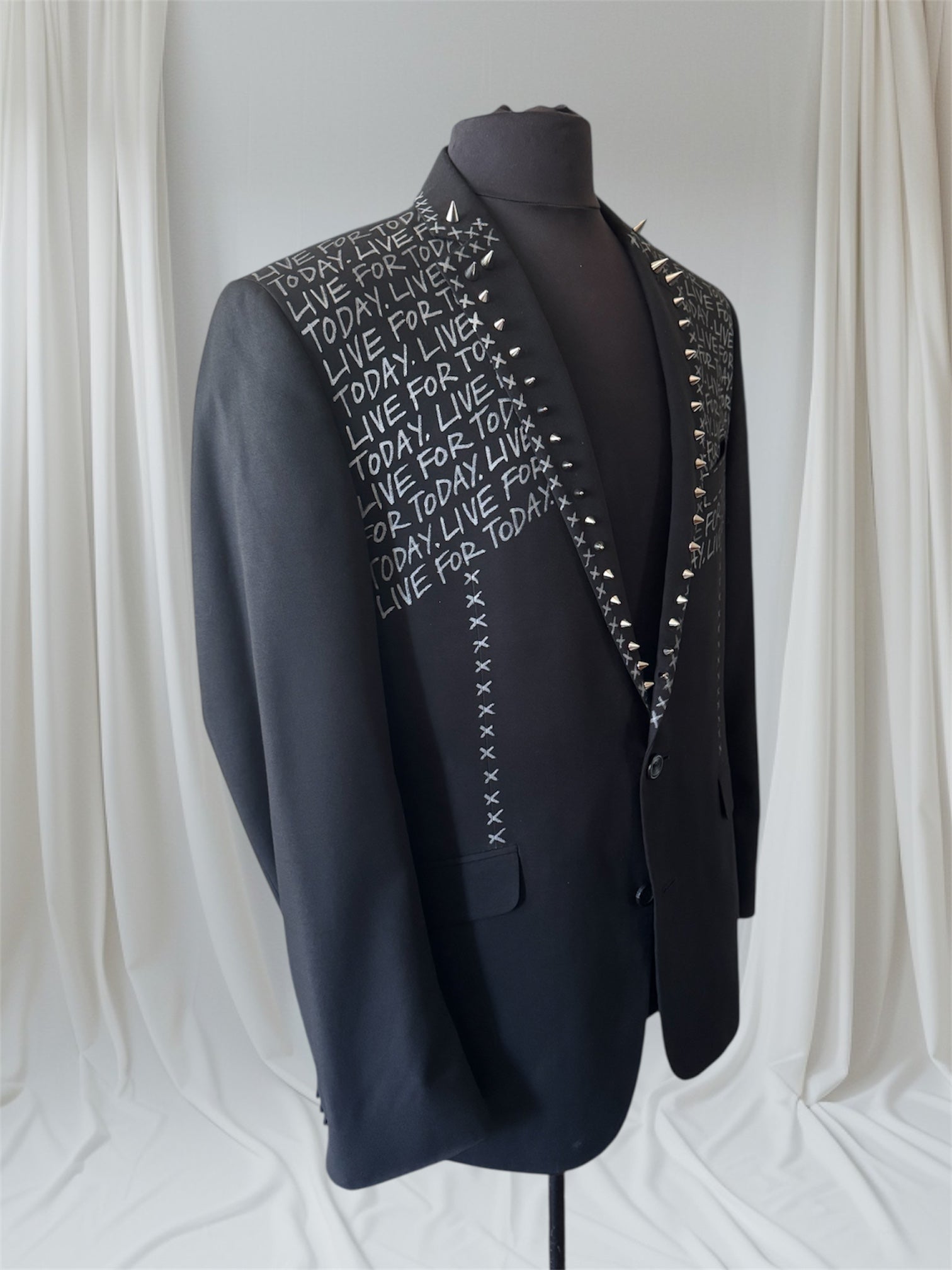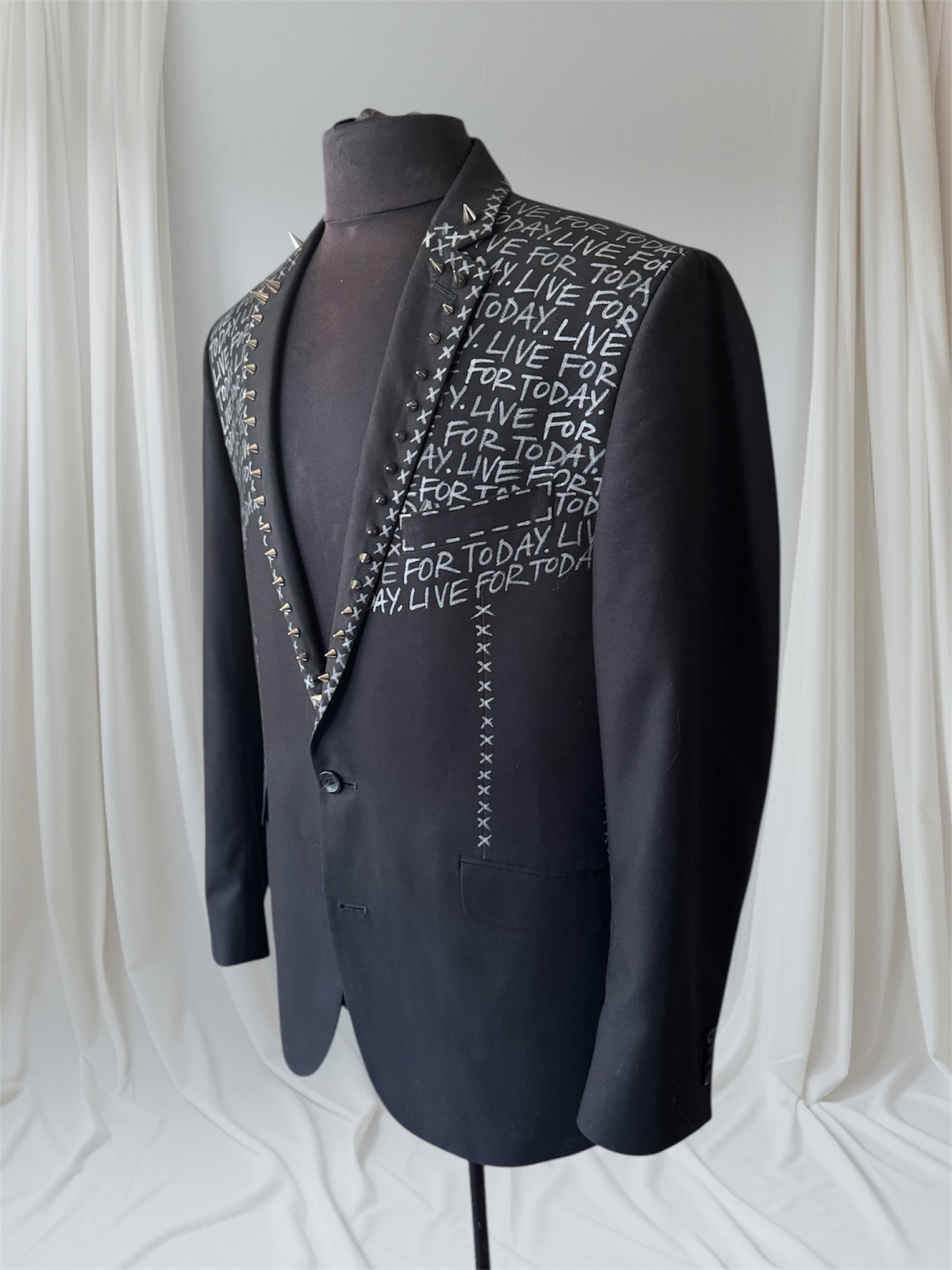 LIVE FOR TODAY, Mens Size 42R Suit Jacket Hand-painted men’s punk-inspired suit jacket with spiked lapels. A classic tailored silhouette transformed into a one-of-a-kind fashion statement. Each jacket is individually upcycled and customized by hand — a refusal of fast fashion and mass production. Details• Hand-painted statement• Spiked lapels• Classic tailored suit jacket silhouette• Upcycled / sustainable• Dry clean safe Created in a single size as part of our upcycled collection. Custom commissions are available through our Custom Suit Jacket program:https://punkmajesty.com/pages/custom-suit-jackets Returns are accepted if you notify us directly via email within 7 days of delivery to receive instructions. Items must be returned unworn in original condition, insured with tracking number provided. measurements 22 inch chest 20 1/2 inch waist 25 1/4 inch sleeve length 18 1/4 inch shoulders 30 inch back length