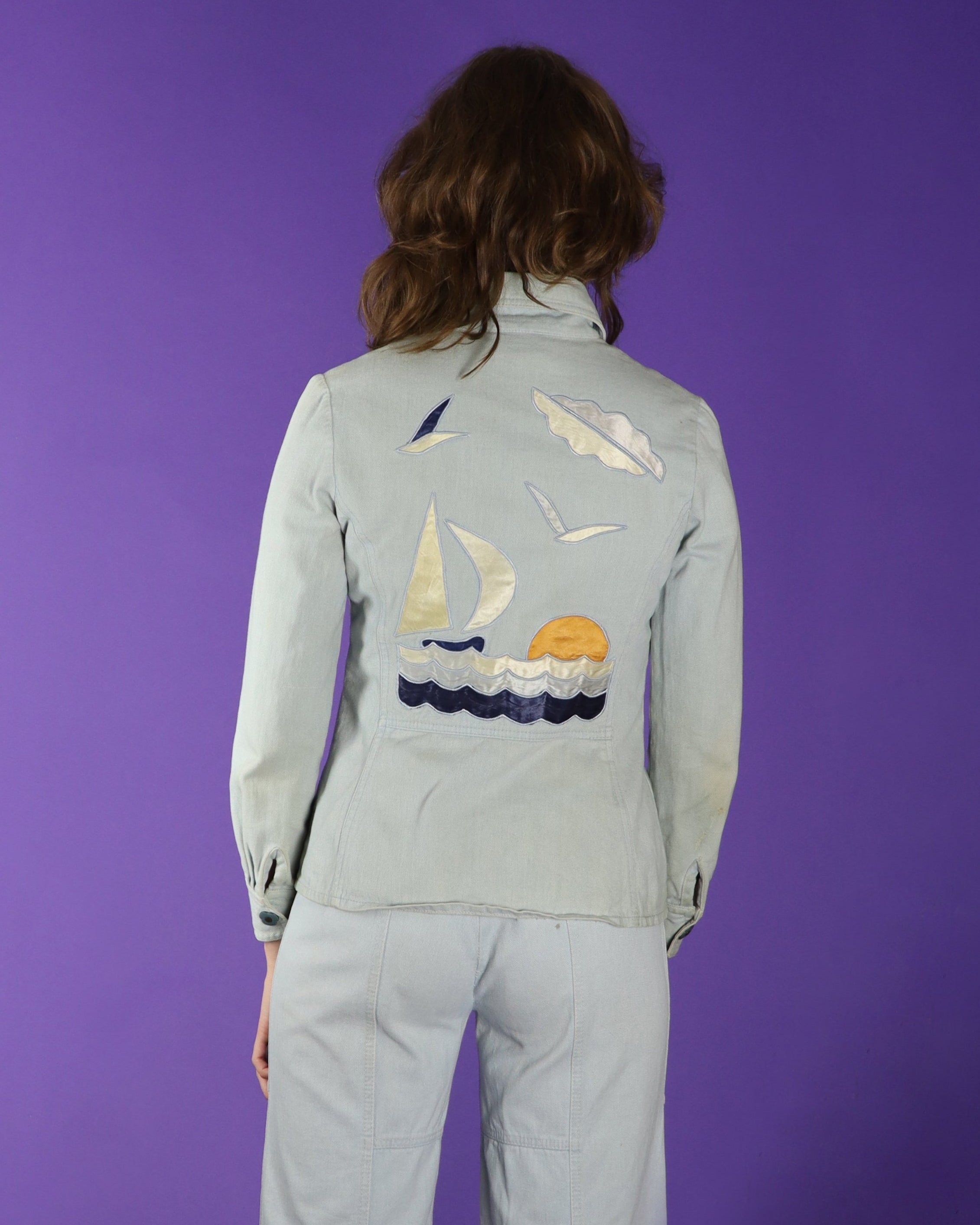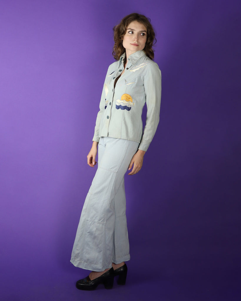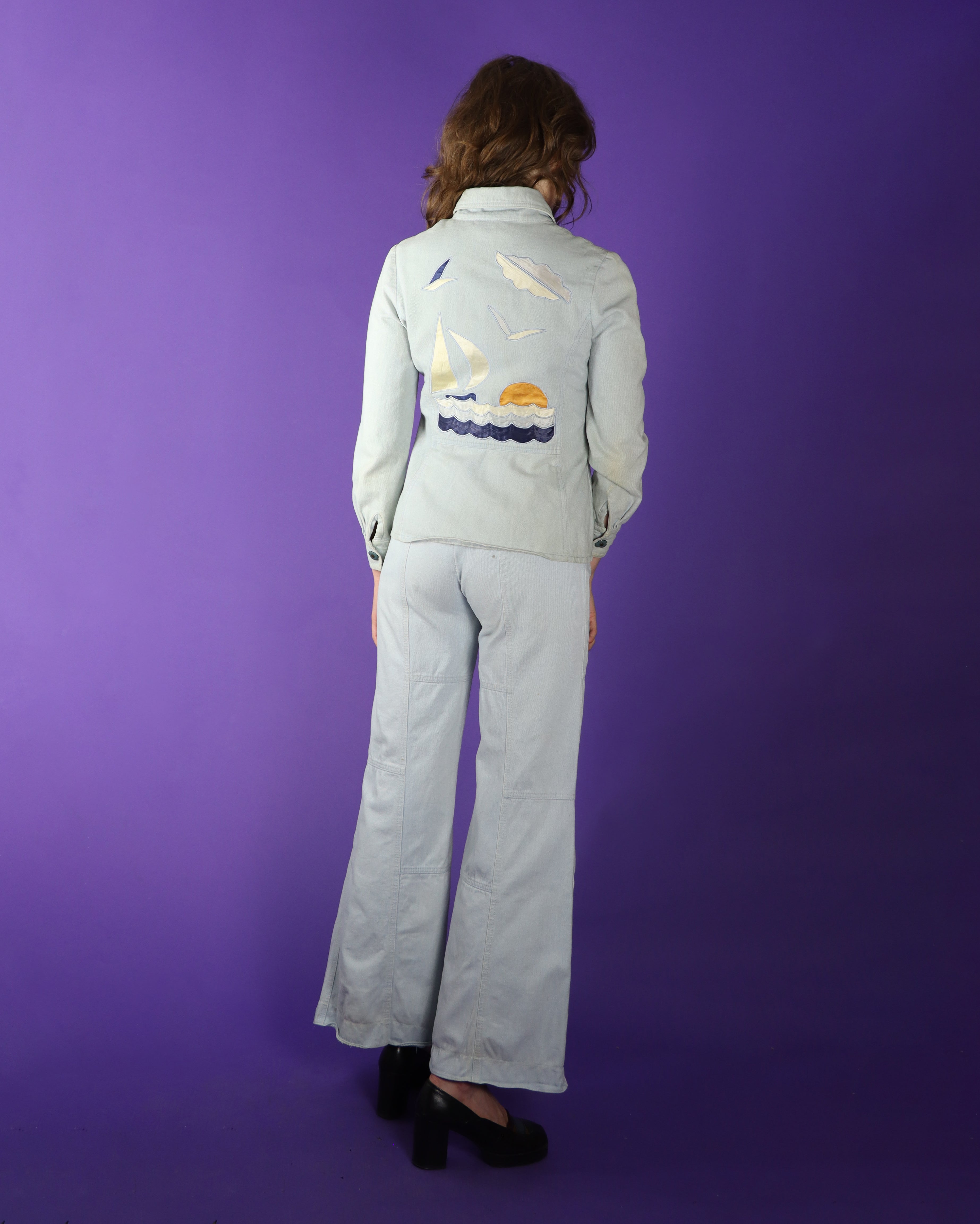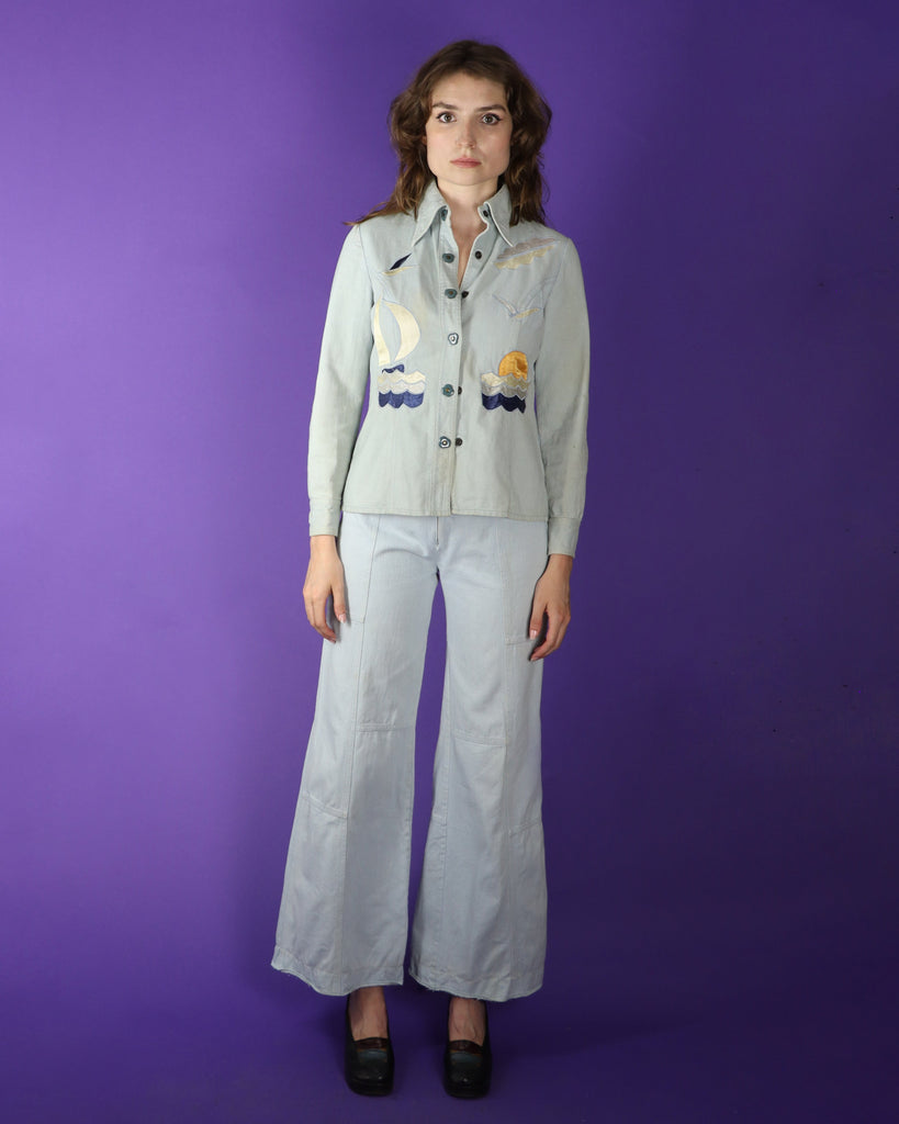 Rare vintage 1970s suit by iconic label Roncelli. Pale blue grey soft brushed denim with super sweet and whimsical nautical themed satin appliqué on the button up shirt style jacket, and matching patchwork bell bottom flares. I love the attention to detail, duck egg coloured enamel flower poppers, the unusual colourway, the sweet seaside motifs and the fabulous dagger collar. Roncelli pieces are always so beautifully cut and are incredibly flattering. Super rare to find a matching set in this design.