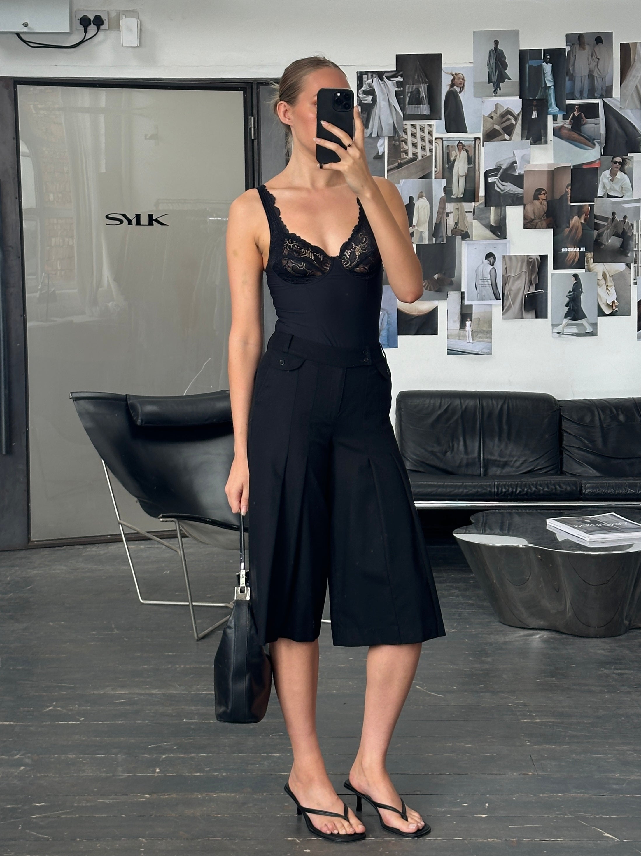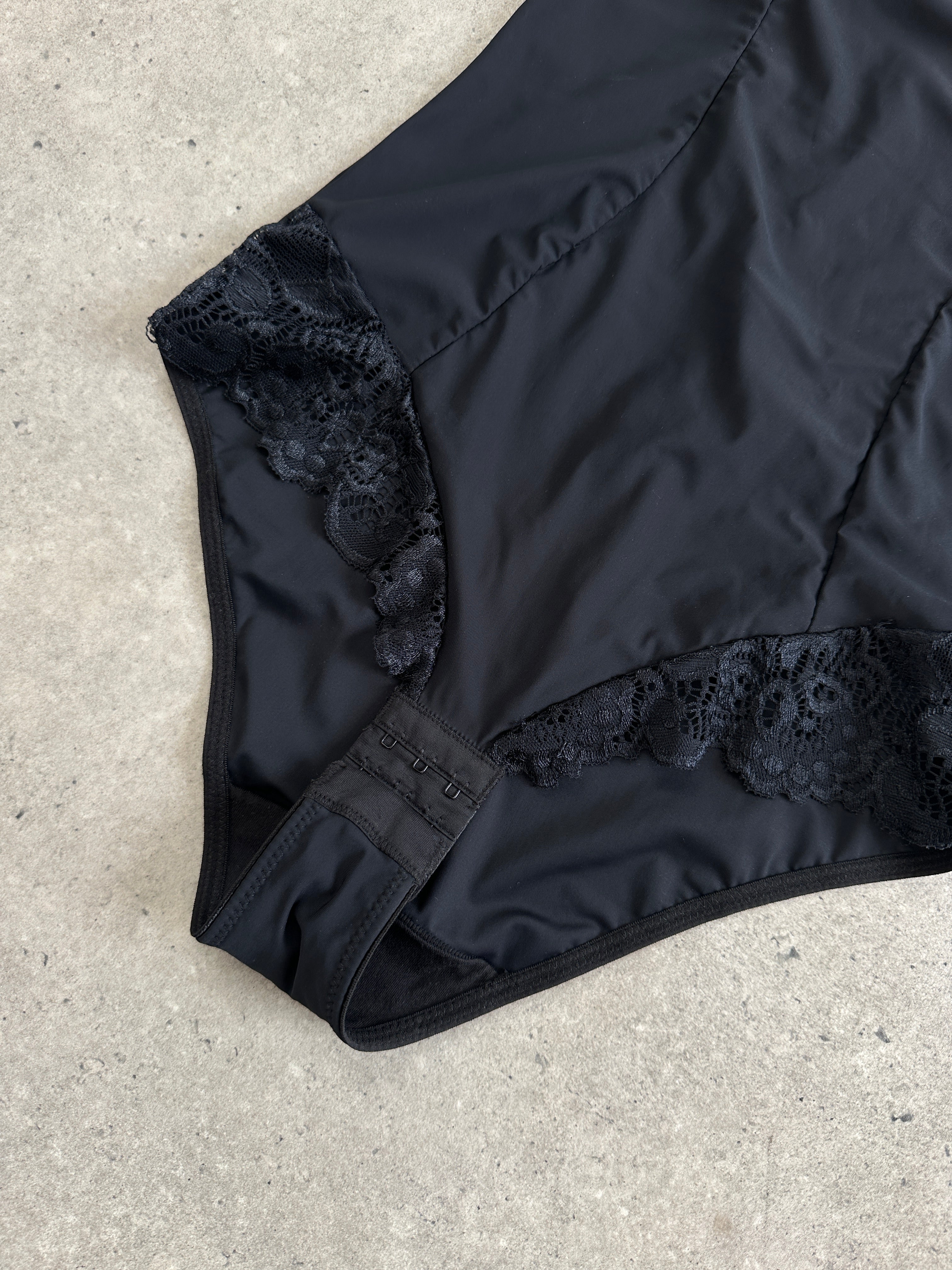 A vintage black lingerie bodysuit, crafted in stretch satin with lace trims and underwired cups. A Y2K staple, balancing elegance with structure.