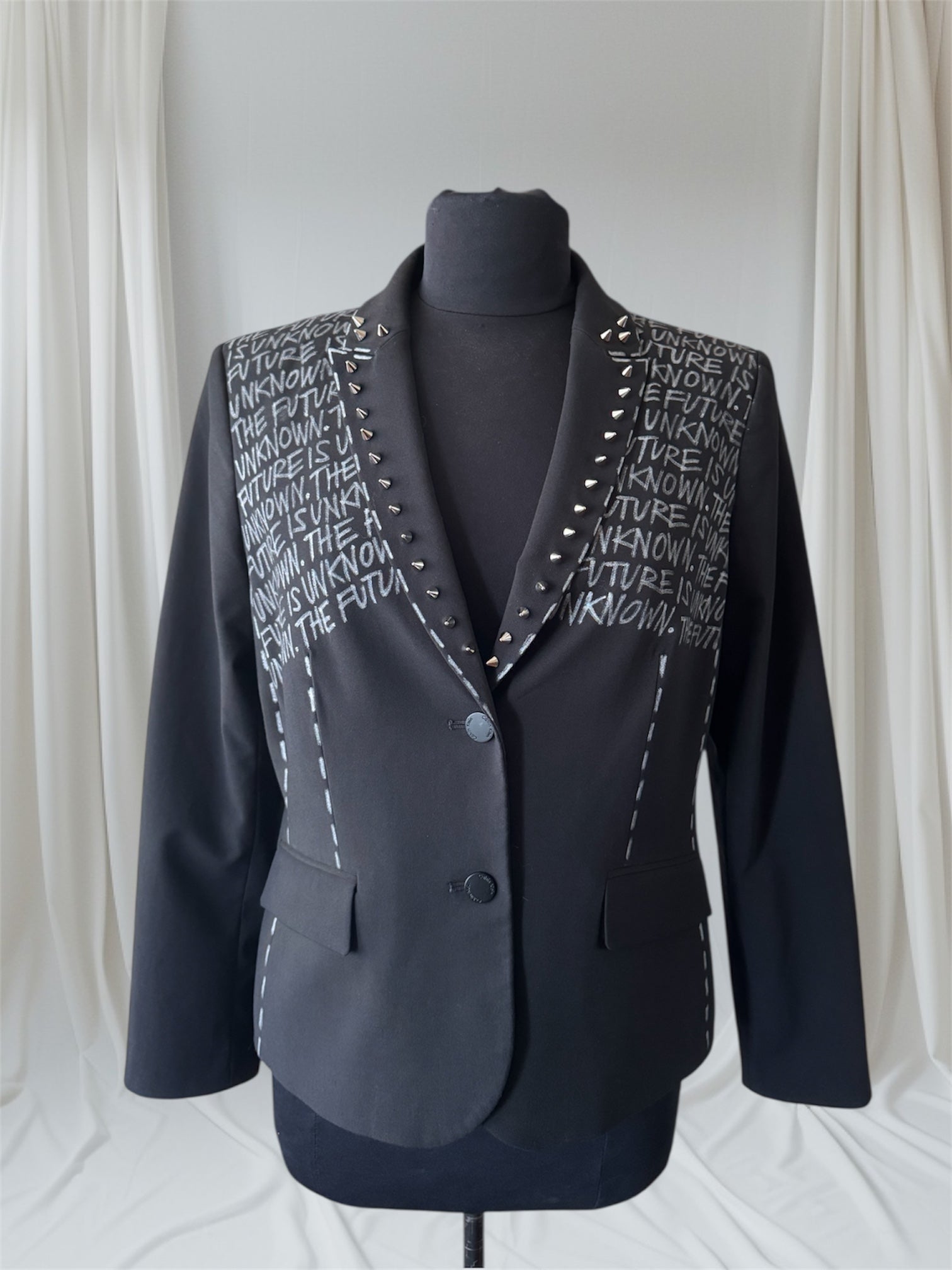 THE FUTURE IS UNKNOWN Size US 10 Womens Suit Jacket Hand-painted women’s punk-inspired suit jacket with spiked lapels. A classic tailored silhouette transformed into a one-of-a-kind fashion statement. Each jacket is individually upcycled and customized by hand — a refusal of fast fashion and mass production. Details• Hand-painted statement• Spiked lapels• Classic tailored suit jacket silhouette• Upcycled / sustainable• Dry clean safe Created in a single size as part of our upcycled collection. Custom commissions are available through our Custom Suit Jacket program:https://punkmajesty.com/pages/custom-suit-jackets Returns are accepted if you notify us directly via email within 7 days of delivery to receive instructions. Items must be returned unworn in original condition, insured with tracking number provided. measurements 20 inch chest 18 inch waist 24 inch sleeve length 16 inch shoulders 25 inch back length