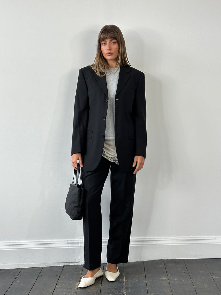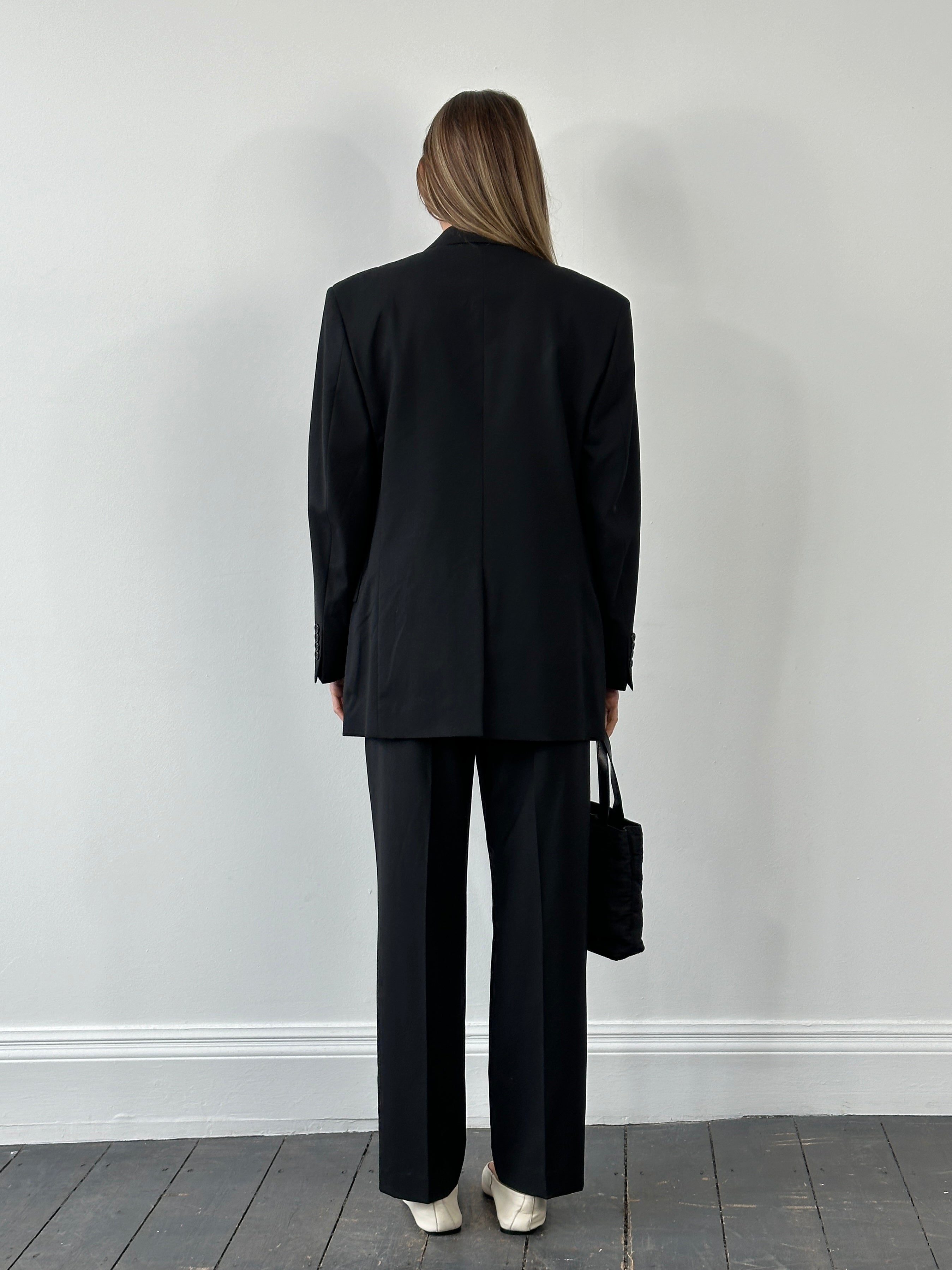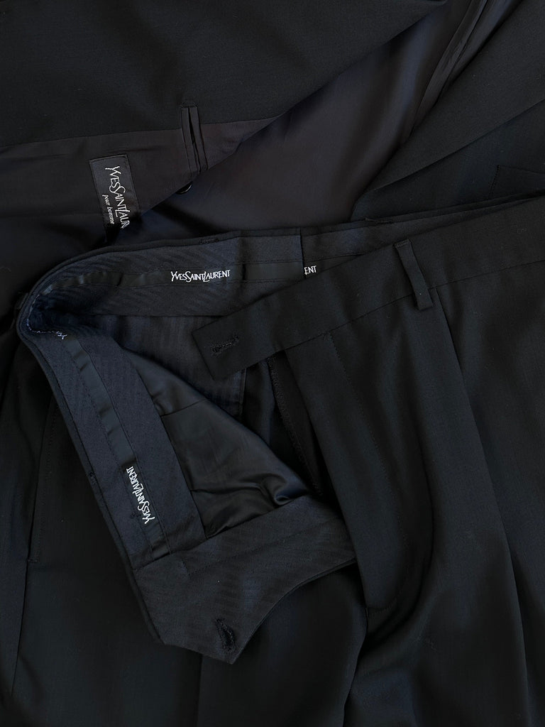 Classic Yves Saint Laurent black suit with clean minimalist tailoring and straight leg trousers. A refined YSL pour homme ready to wear piece from the 1990s.