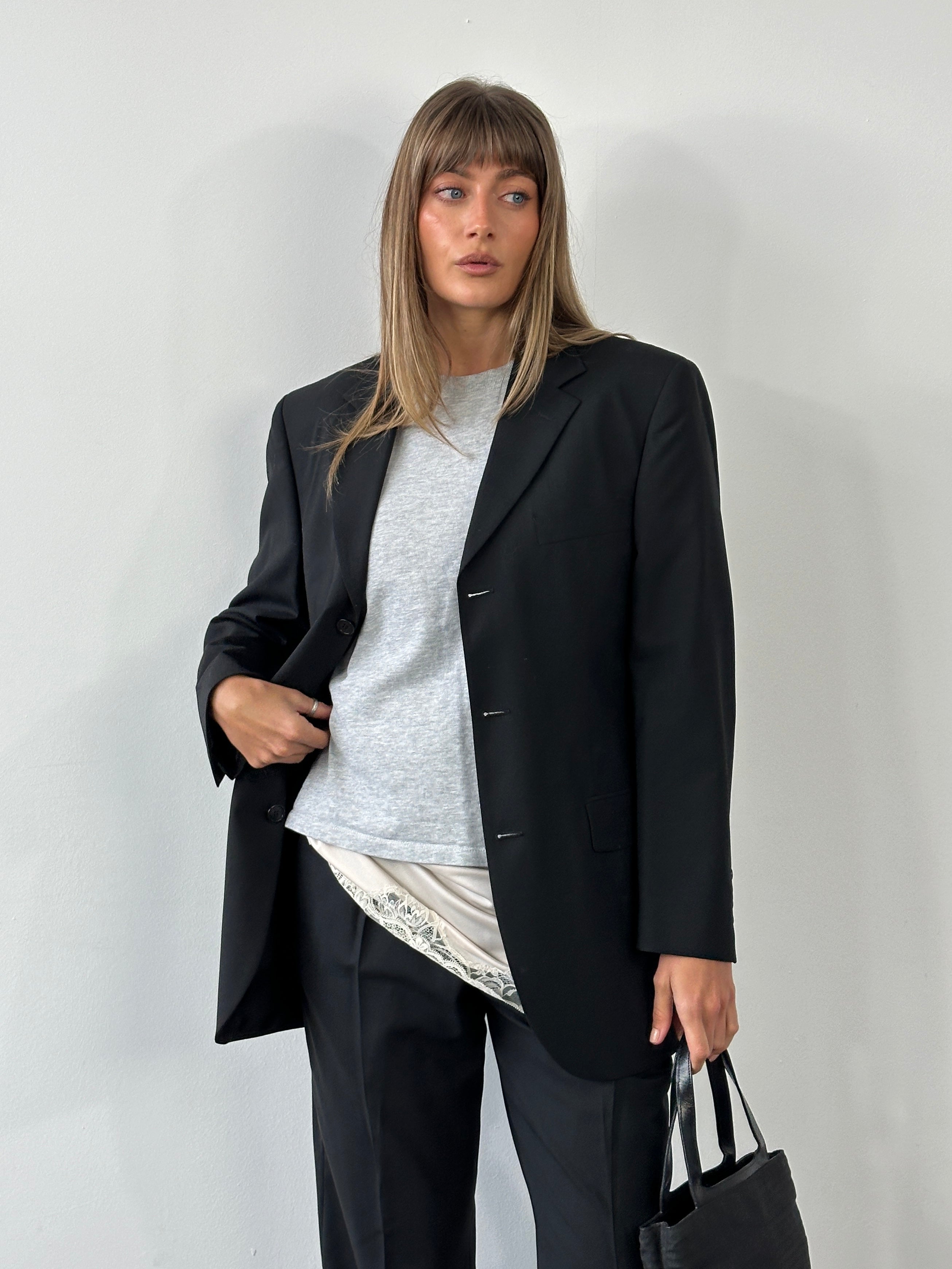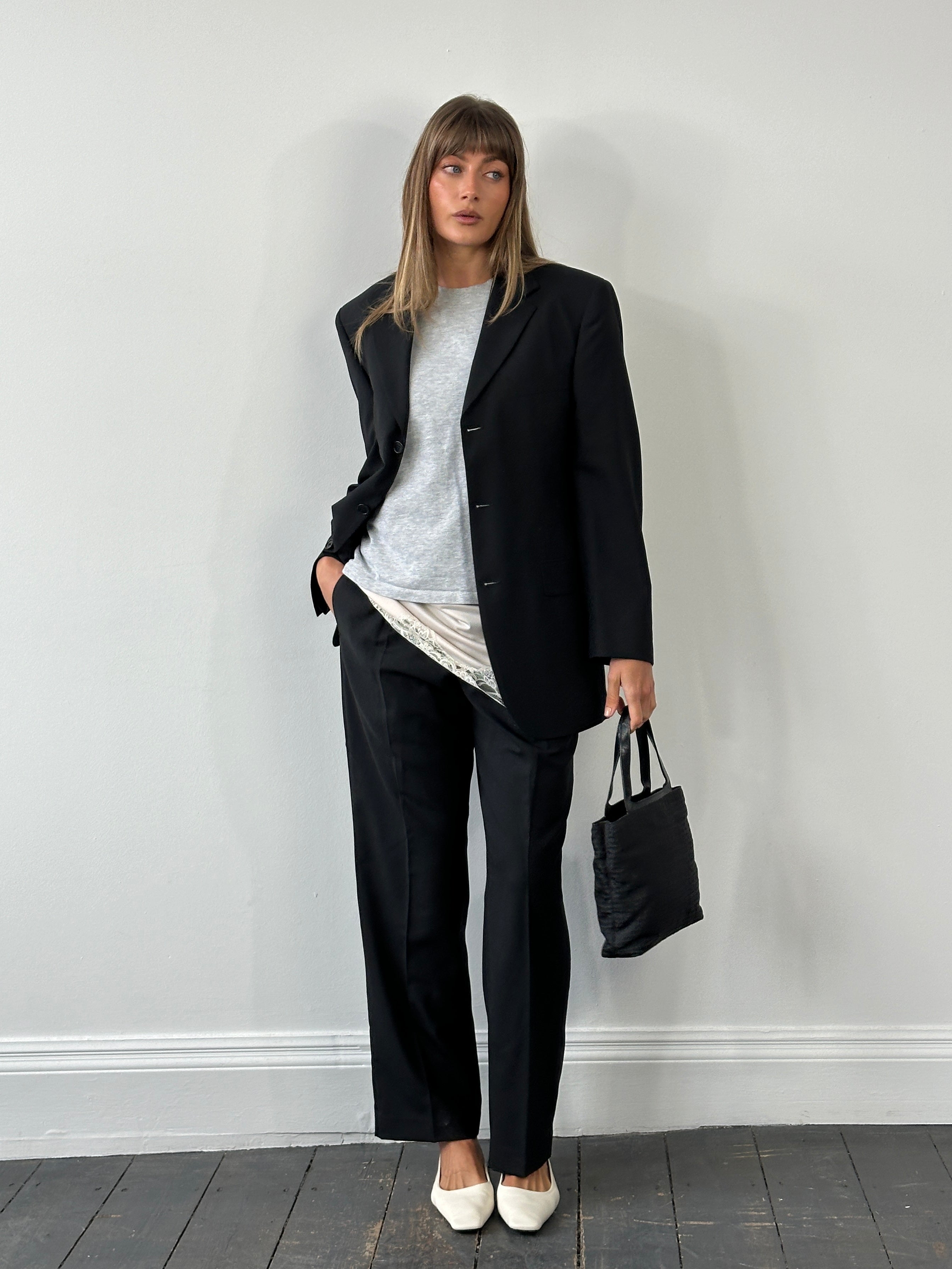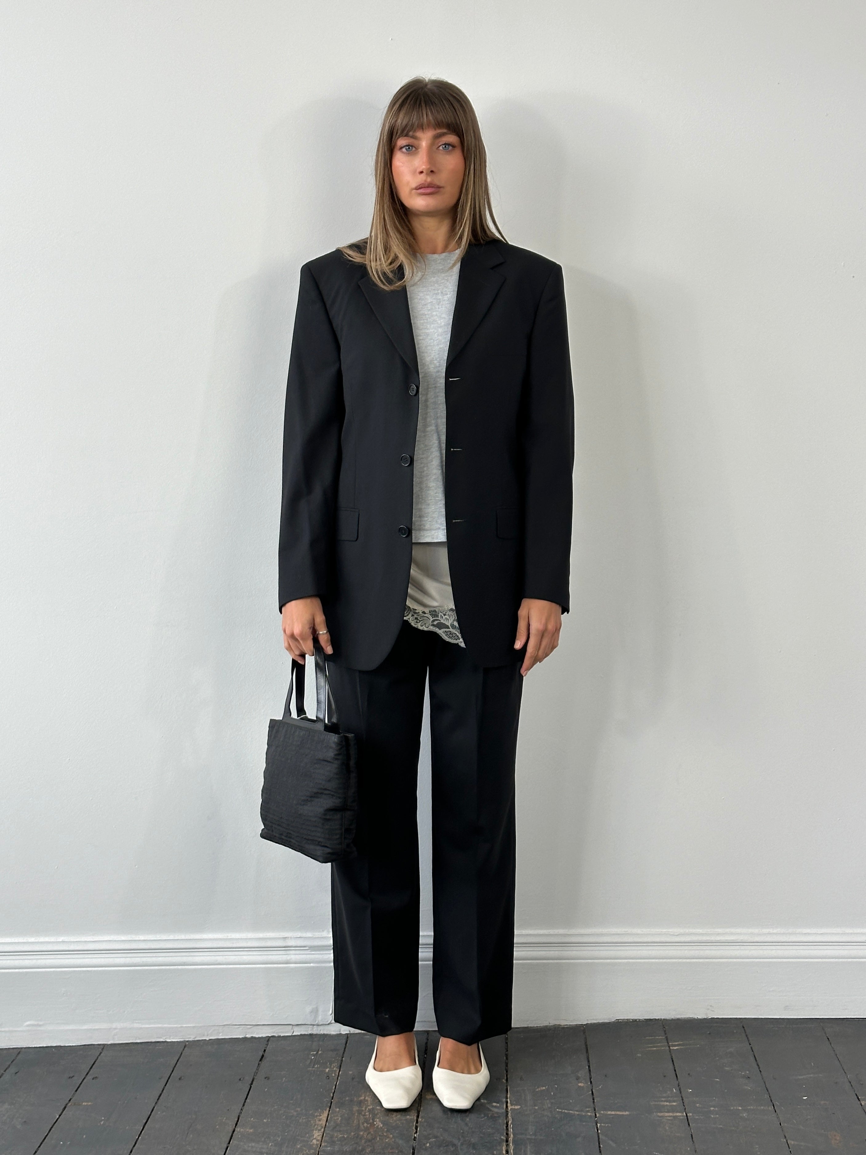 Classic Yves Saint Laurent black suit with clean minimalist tailoring and straight leg trousers. A refined YSL pour homme ready to wear piece from the 1990s.