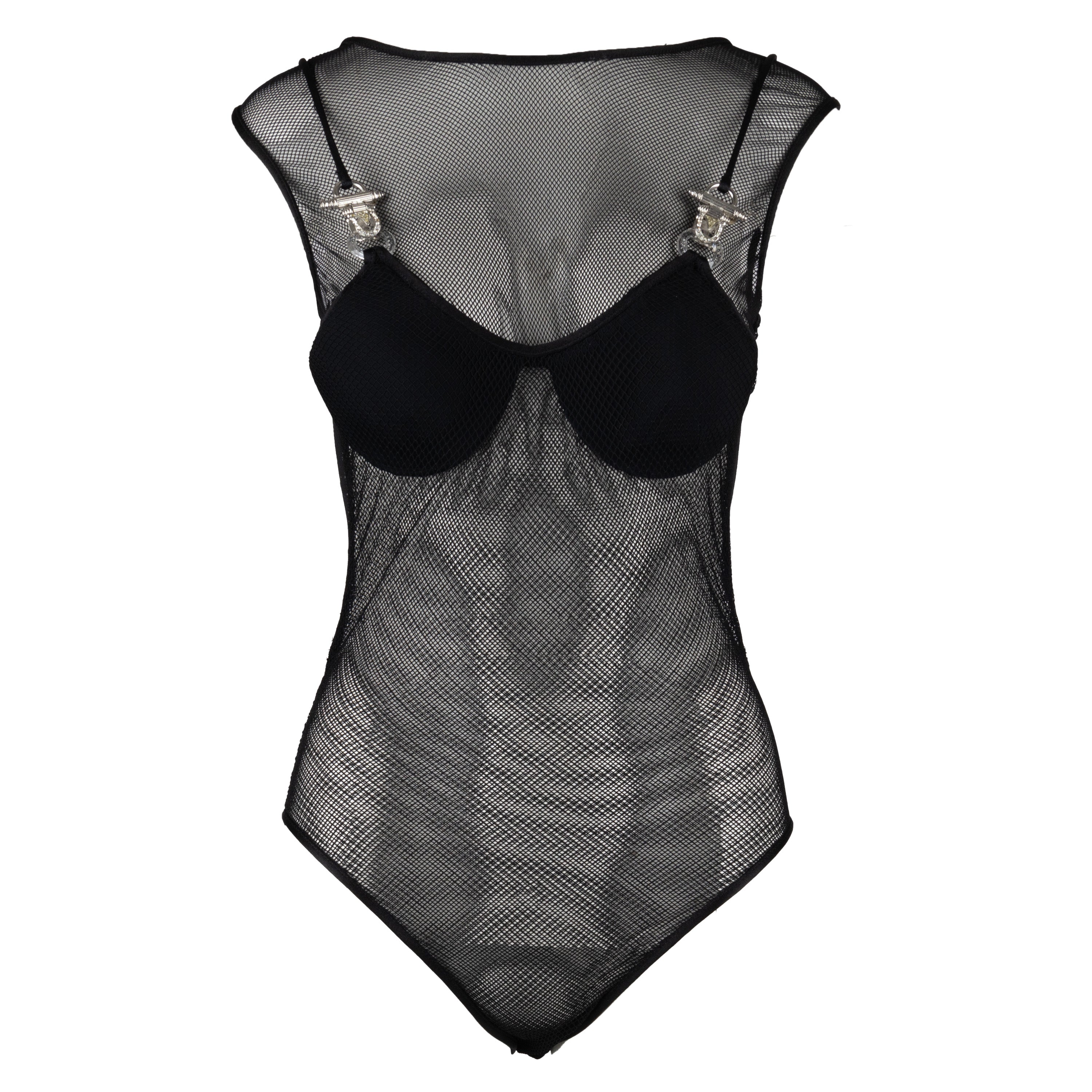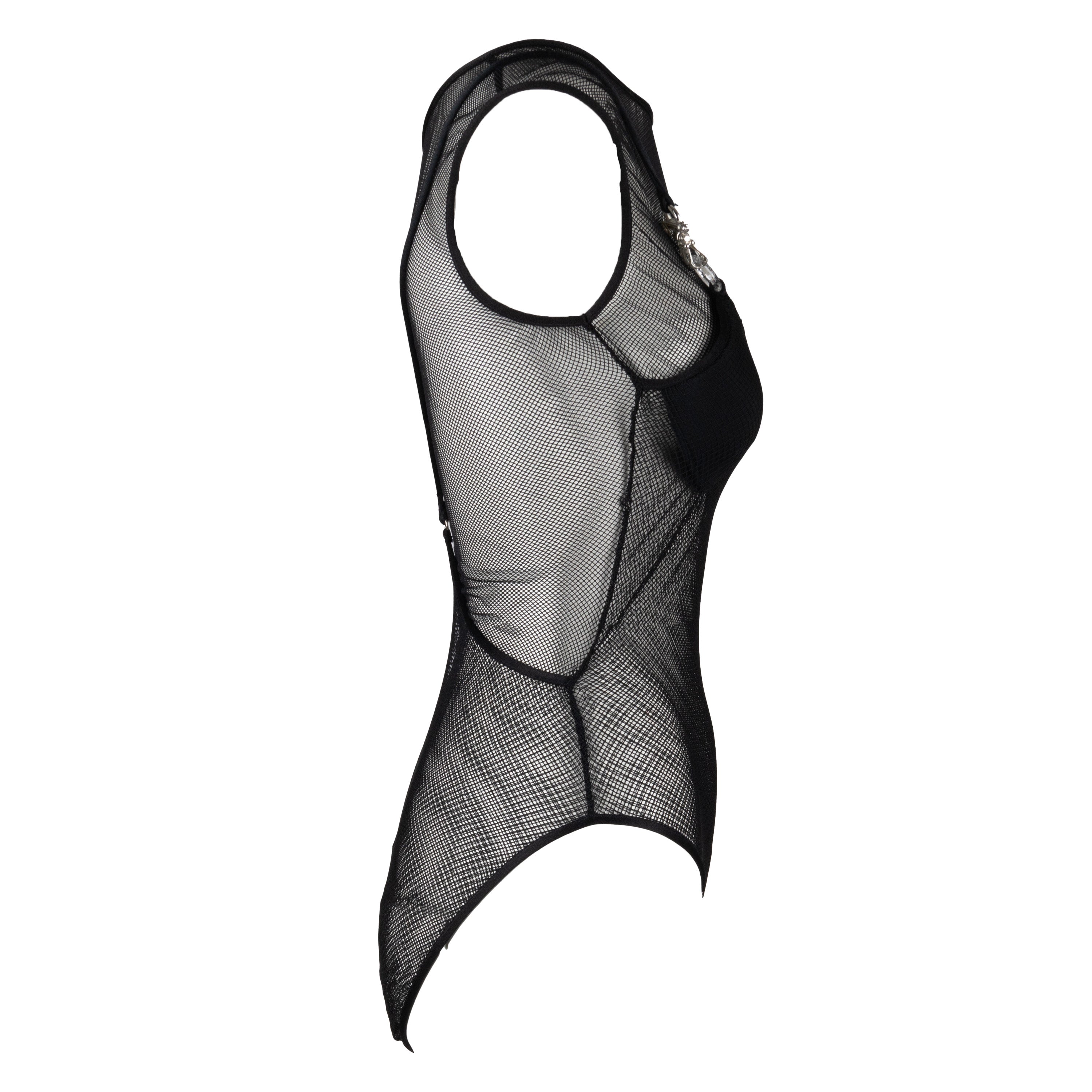 This Collection Privée Mesh Bodysuit is crafted with two layers of mesh for a alluring look. It features a bralette with metal details, stones and a transparent ring in the straps. The straps cross over the waist at the back, creating a stunning silhouette.