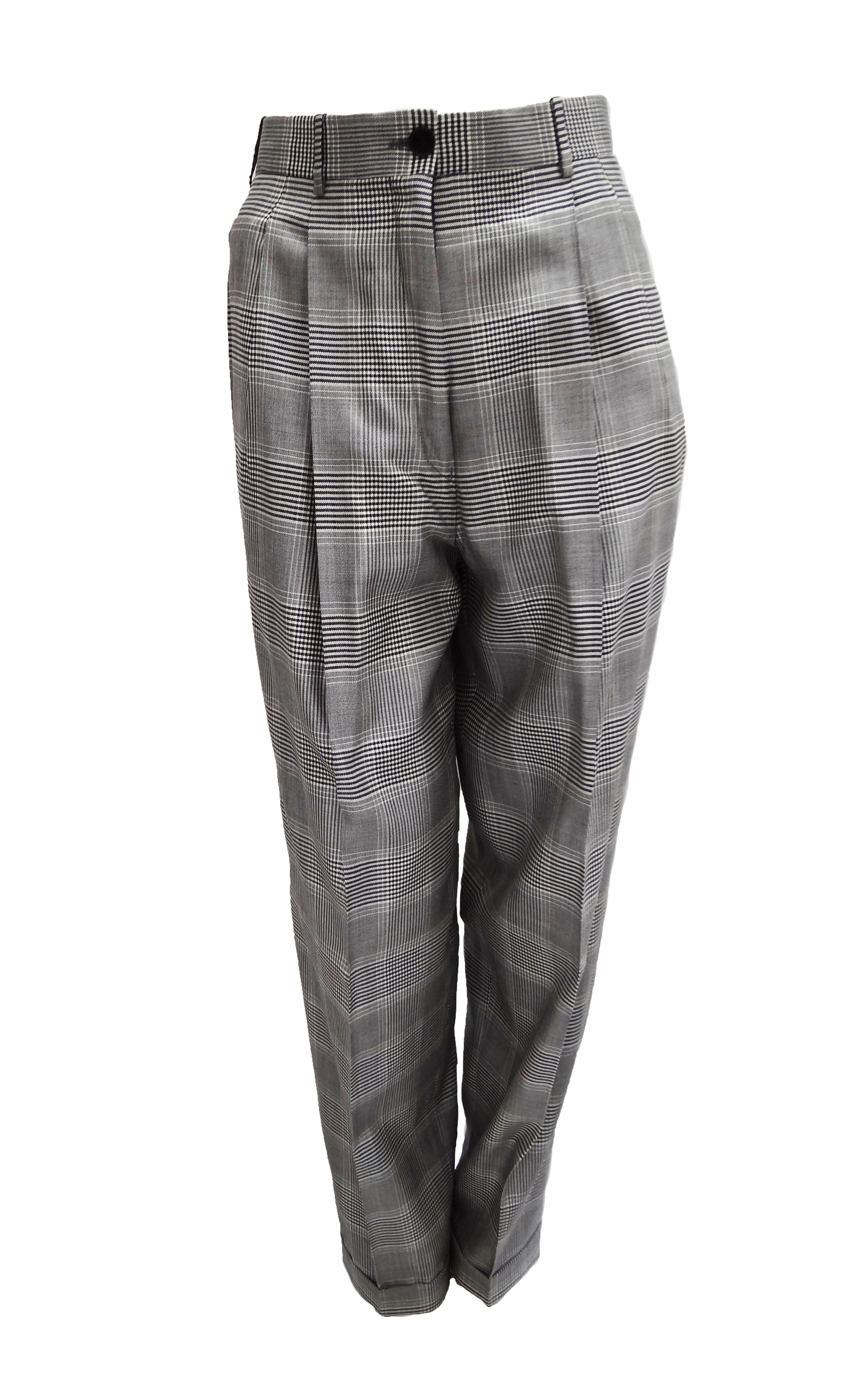 This classic mannish - yet feminine - two piece garment has high-waisted trousers, with pegged 2-pleated front, straight legged with a cuff. Side pockets and buttoned back pockets.
