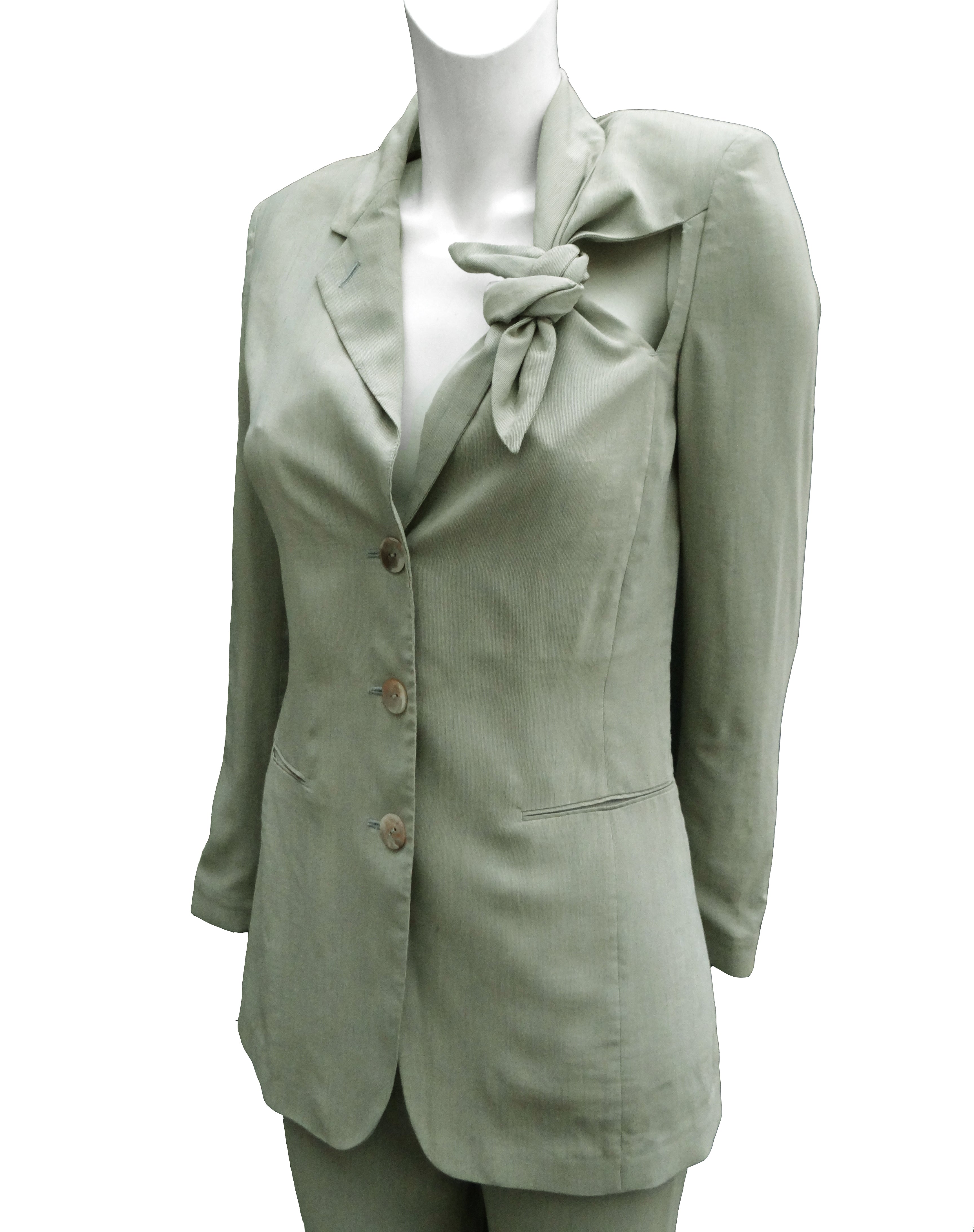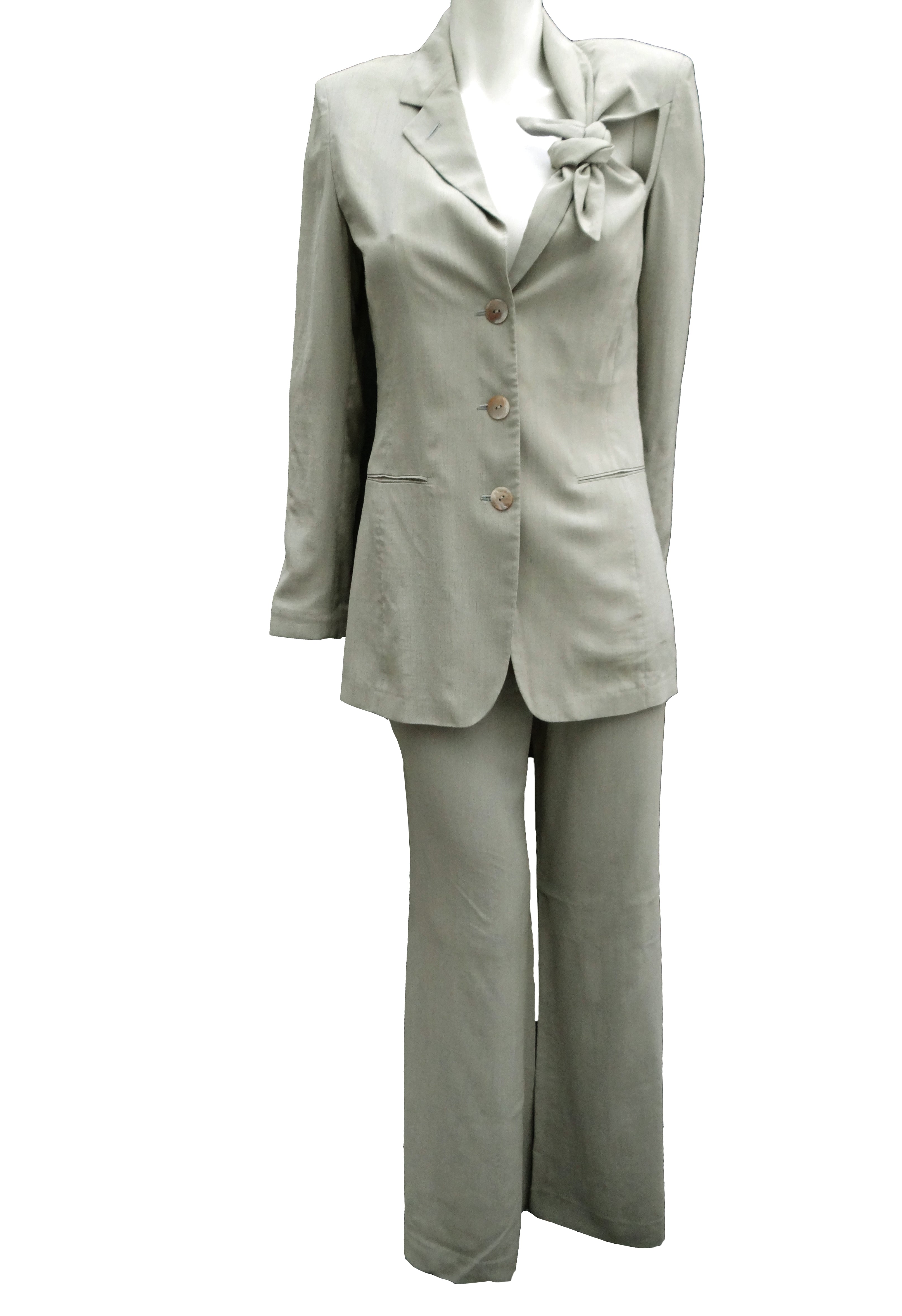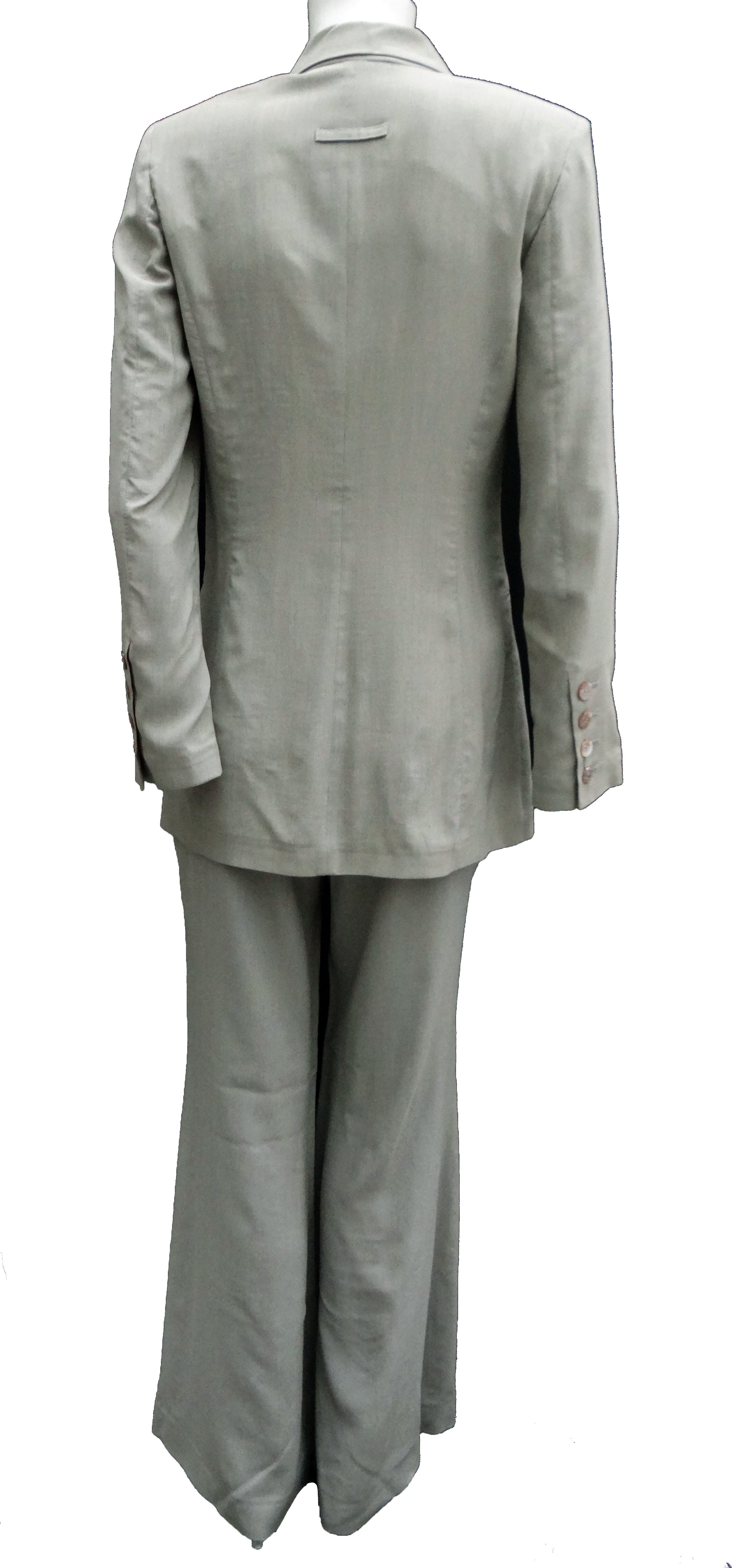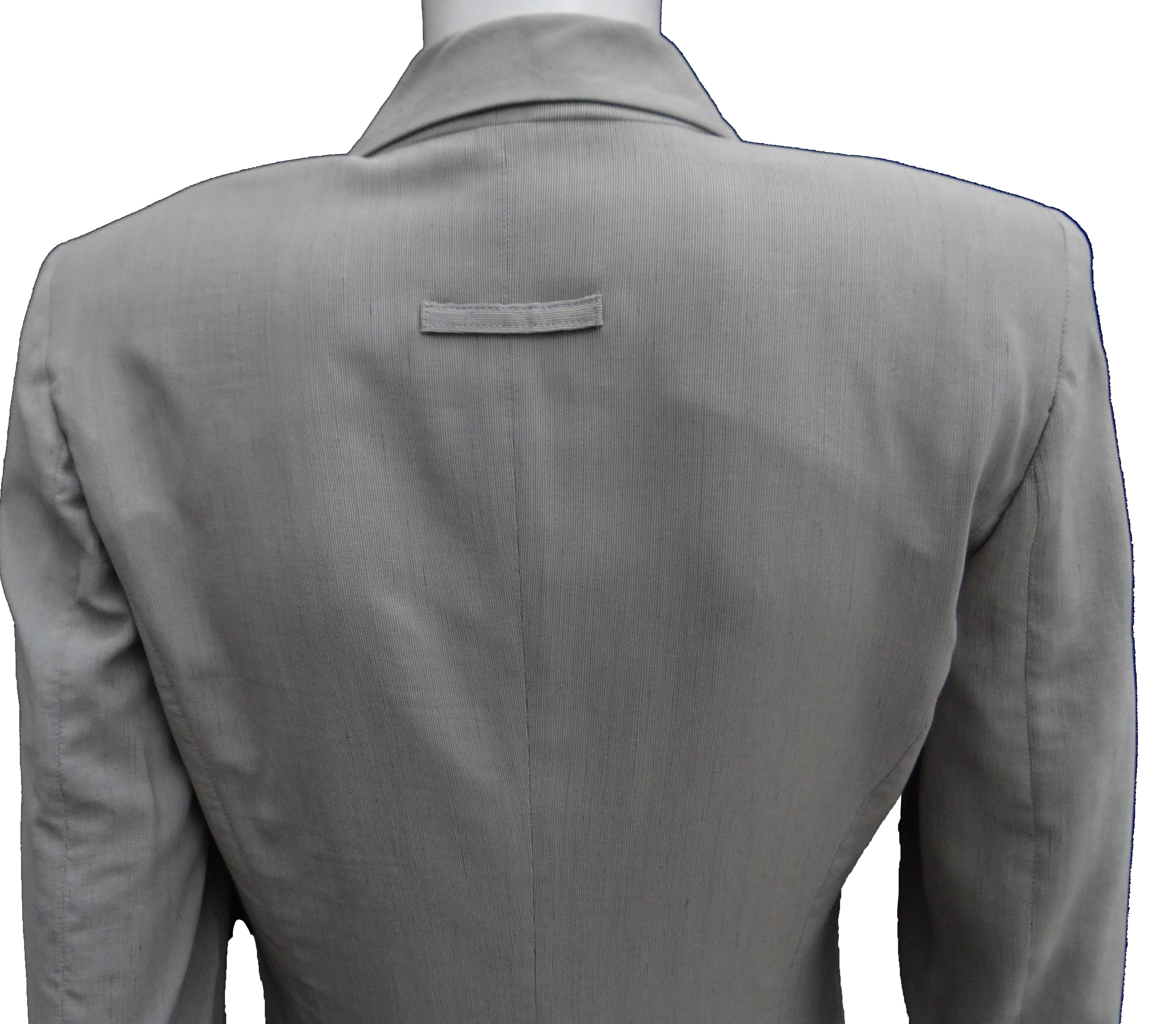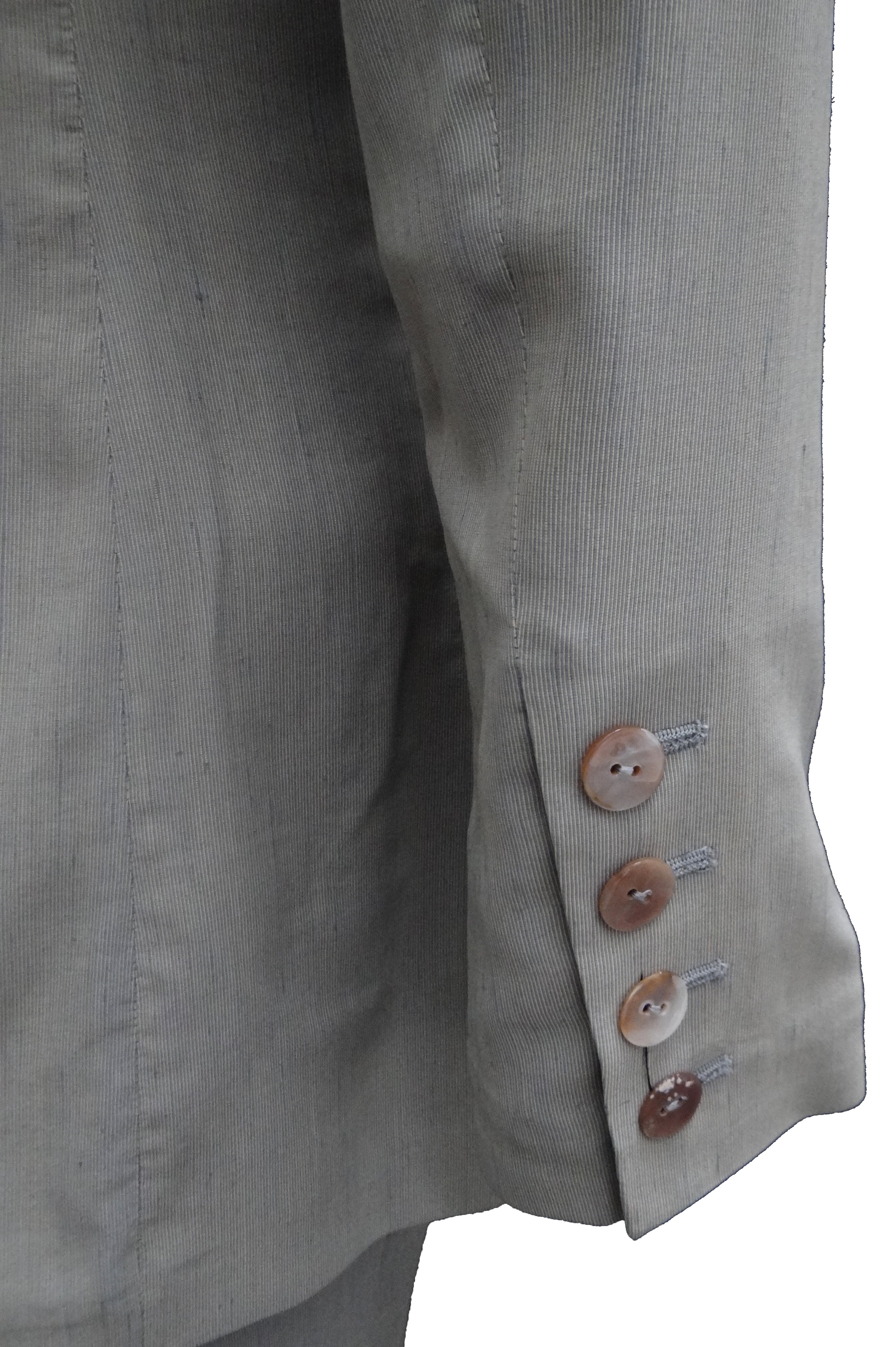 A superb vintage tailored trouser suit by Jean-Paul Gaultier Femme, thought to be late 1980s, in beautiful lightweight suiting fabric with delicate grey green stripe.  It is hard to do justice in the photos to just how good this suit looks in real life - the overhead photo of the jacket laid flat is the most accurate representation of this two tone grey/green fabric.