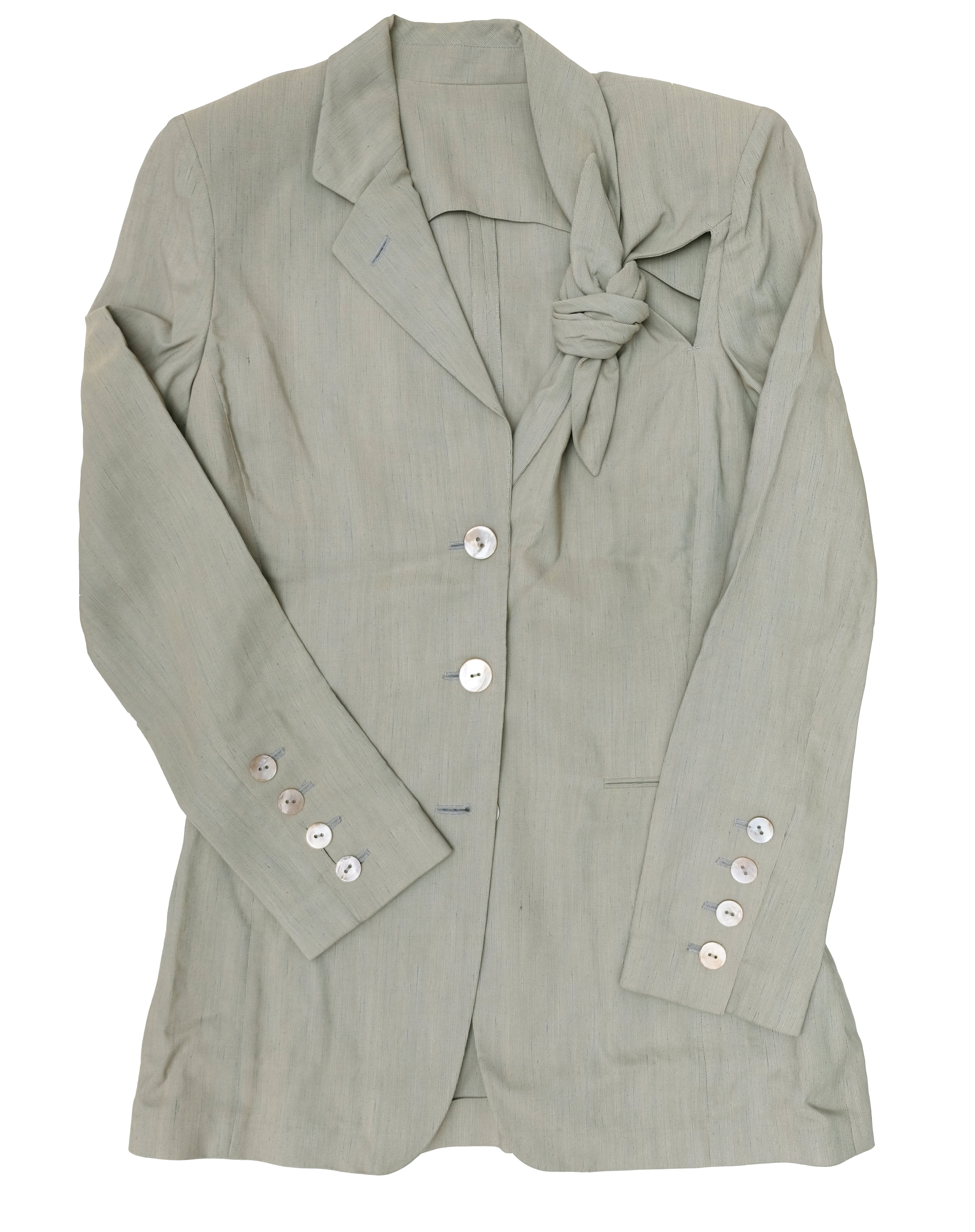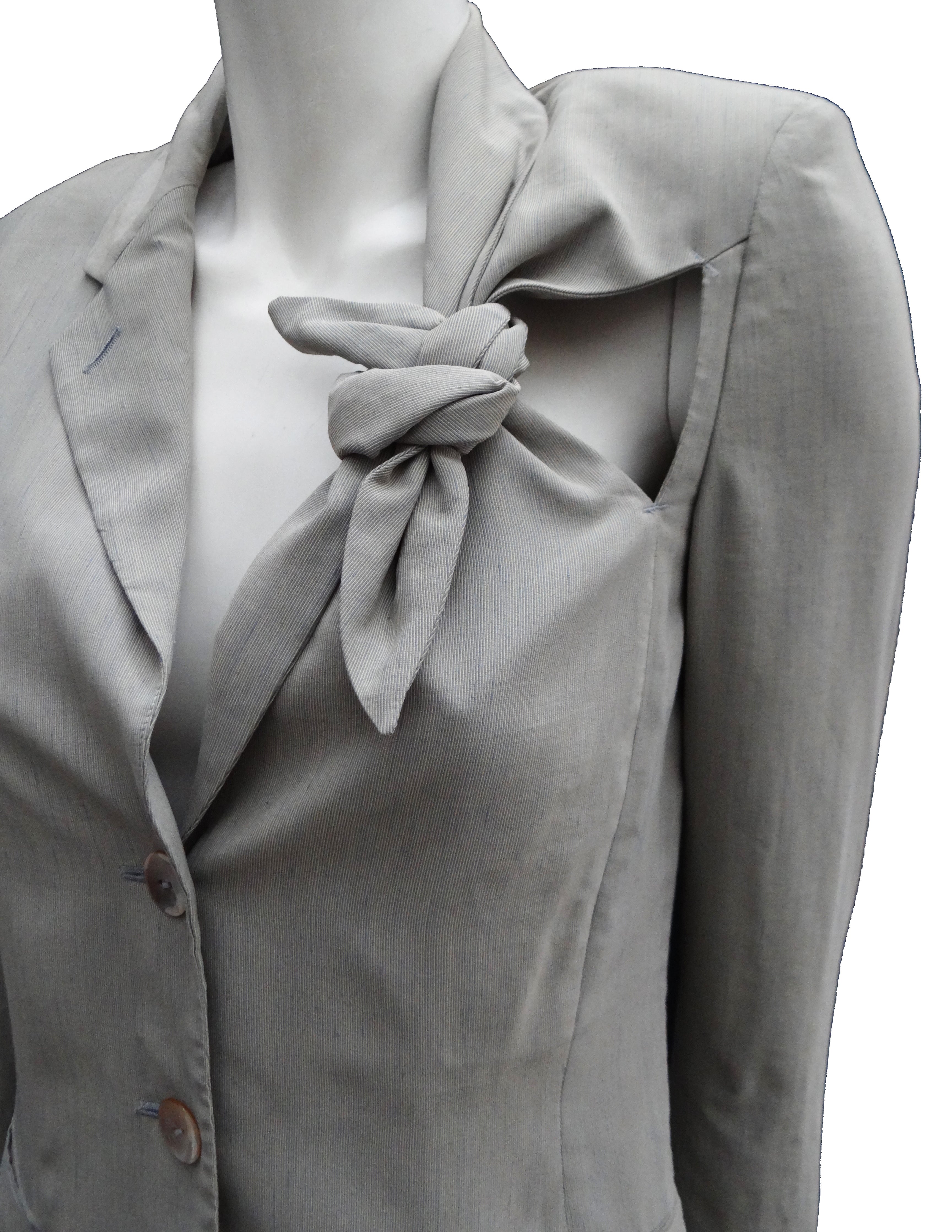 The jacket is longish with 3 mother of pearl buttons,  front slit pockets, and 4 button sleeves. The lapels are notched on one side with a cut out section with knot feature on the other. Unlined.