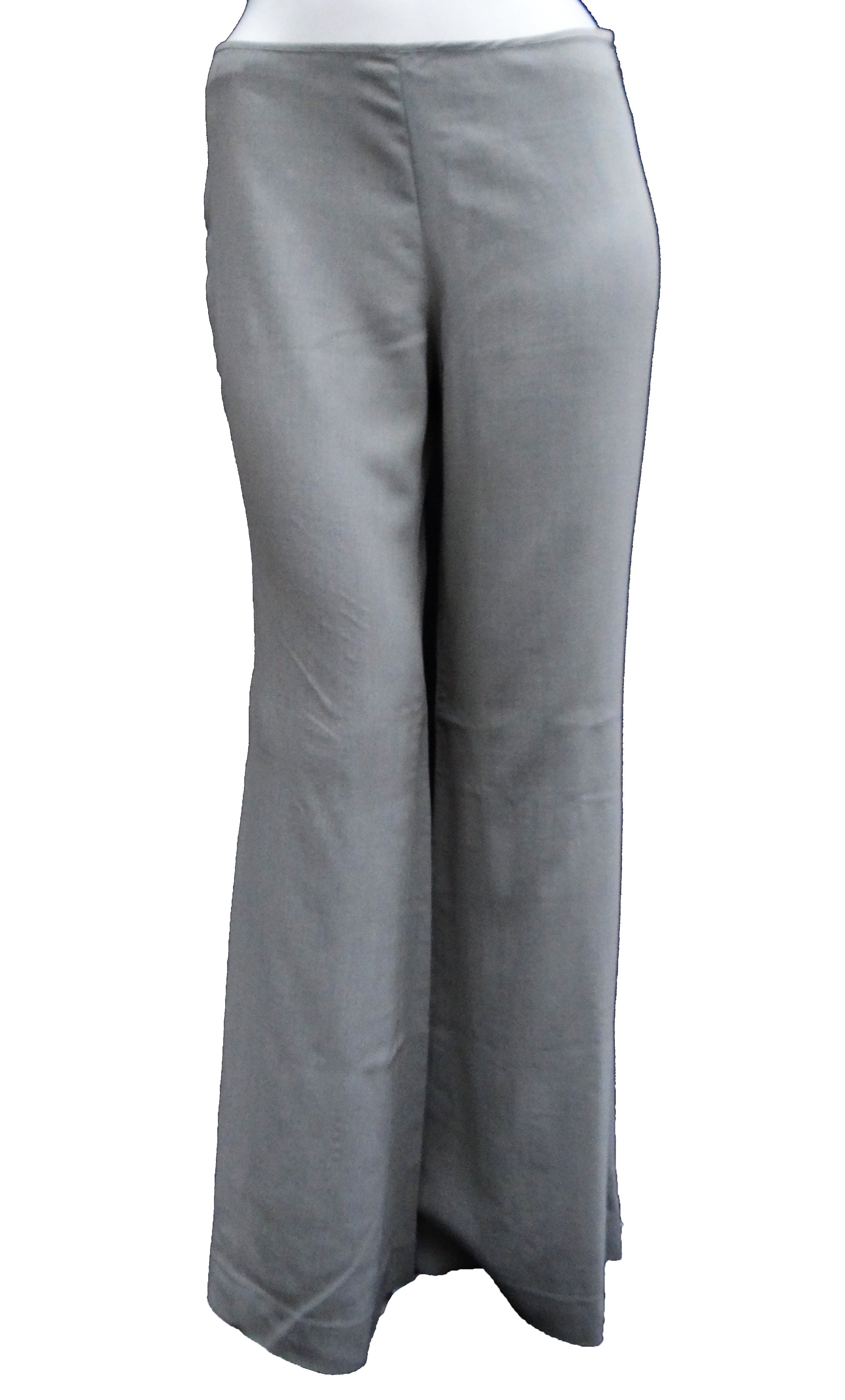 The trousers have no waistband and  a side zip.  They are loosely fitted to the knee,  flaring out to hem; could easily be adjusted for more contemporary look.