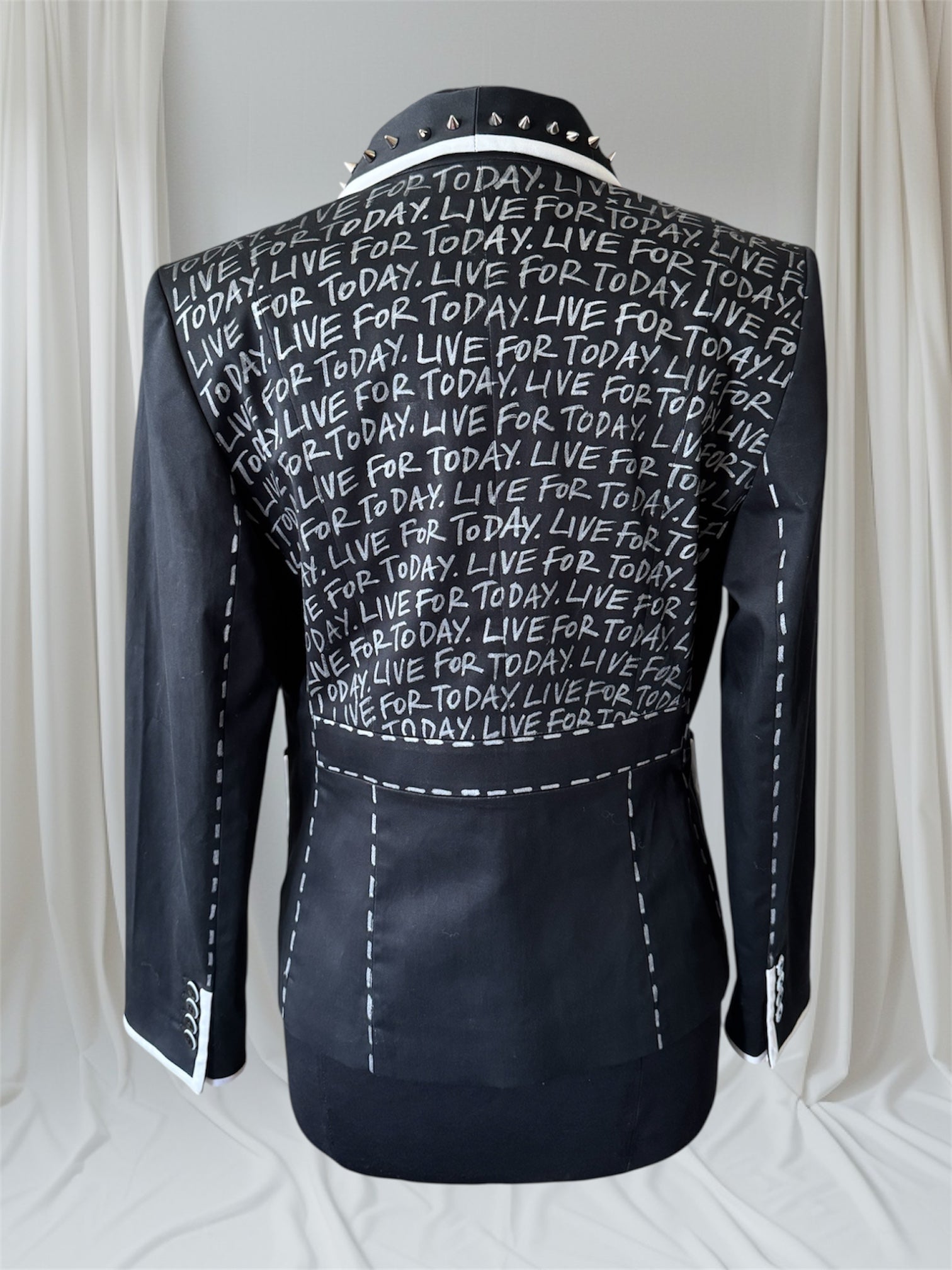 LIVE FOR TODAY Size M/ US 10 Women's Suit Jacket Hand-painted women’s punk-inspired suit jacket with spiked lapels. A classic tailored silhouette transformed into a one-of-a-kind fashion statement. Each jacket is individually upcycled and customized by hand — a refusal of fast fashion and mass production. Details• Hand-painted statement• Spiked lapels• Classic tailored suit jacket silhouette• Upcycled / sustainable• Dry clean safe Created in a single size as part of our upcycled collection. Custom commissions are available through our Custom Suit Jacket program:https://punkmajesty.com/pages/custom-suit-jackets Returns are accepted if you notify us directly via email within 7 days of delivery to receive instructions. Items must be returned unworn in original condition, insured with tracking number provided. Measurement18 1/2 inch chest 17 inch waist 23 1/2 inch sleeve length 16 inch shoulders 25 inch back length