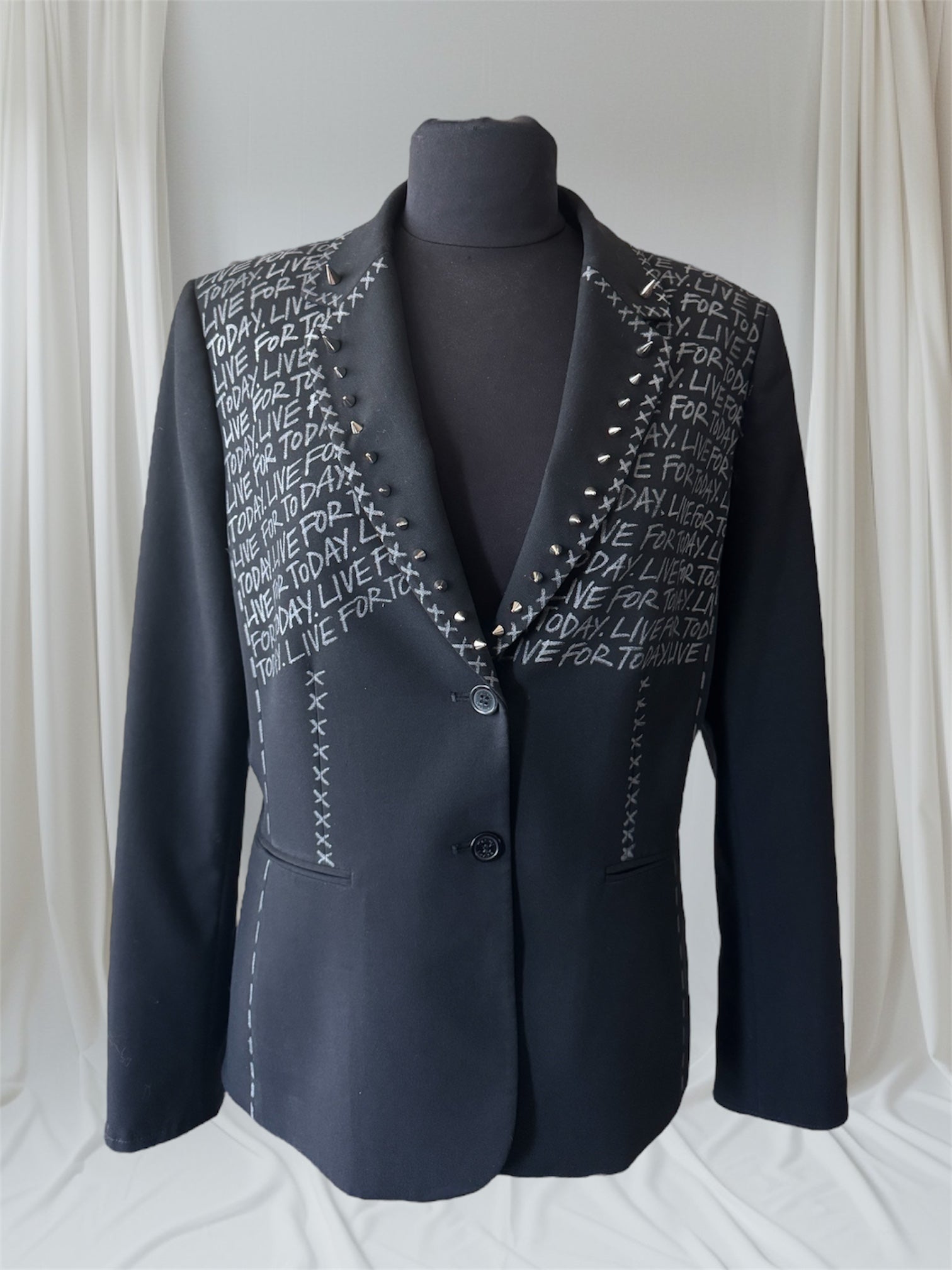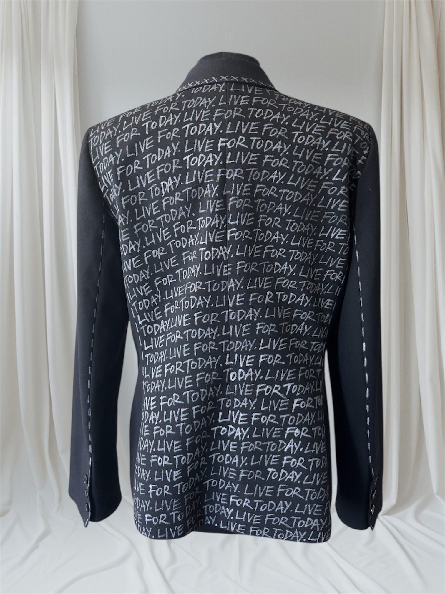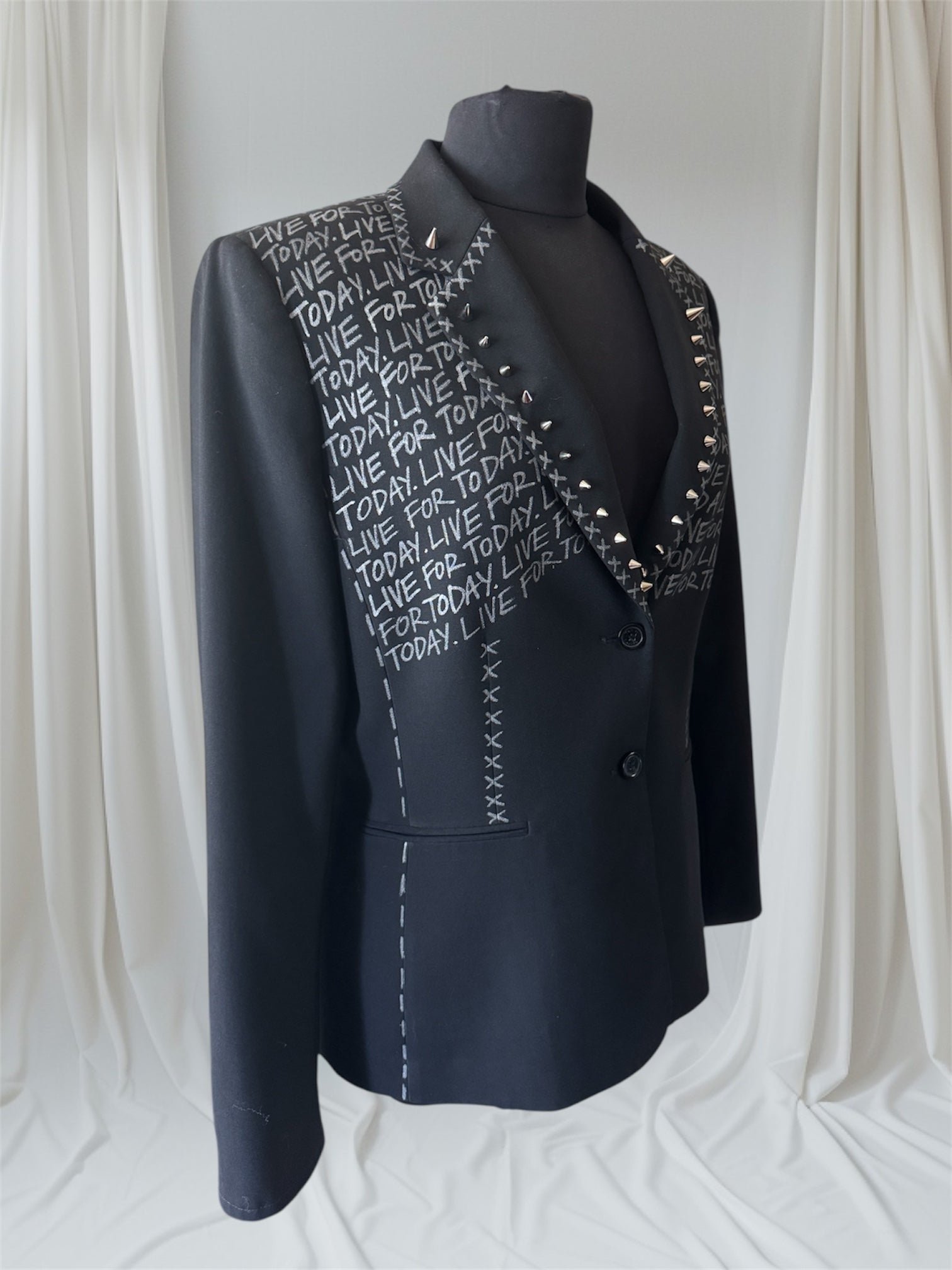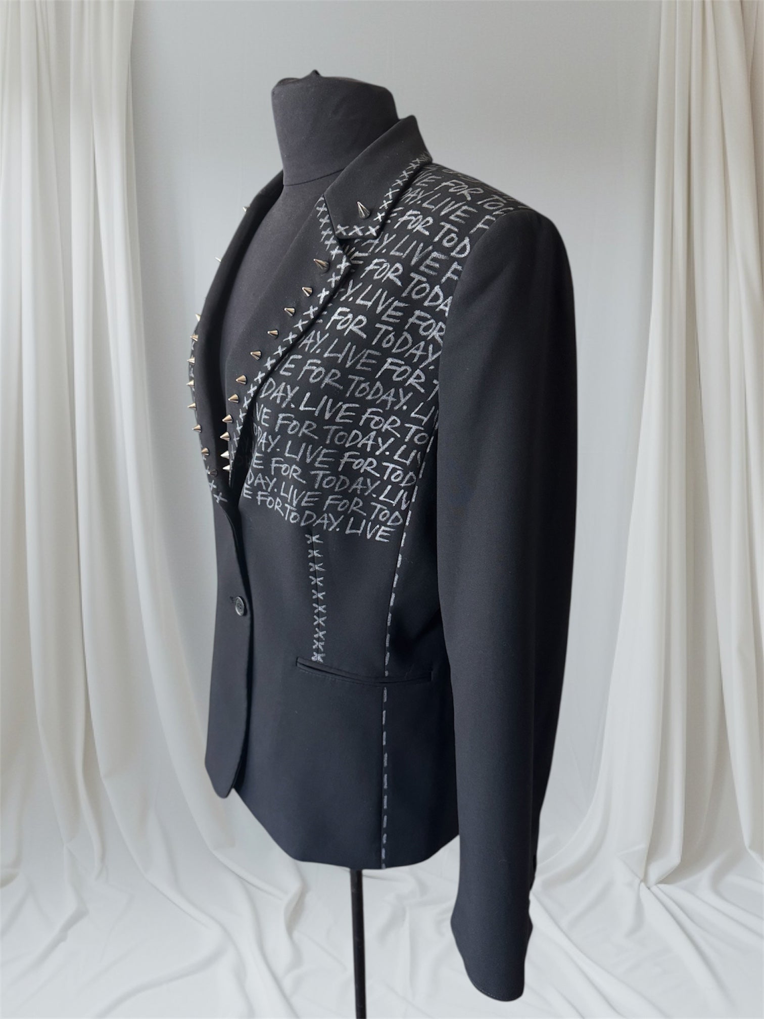 LIVE FOR TODAY Size 12 Womens Suit Jacket. Hand-painted women’s punk-inspired suit jacket with spiked lapels. A classic tailored silhouette transformed into a one-of-a-kind fashion statement. Each jacket is individually upcycled and customized by hand — a refusal of fast fashion and mass production. Details• Hand-painted statement• Spiked lapels• Classic tailored suit jacket silhouette• Upcycled / sustainable• Dry clean safe Created in a single size as part of our upcycled collection. Custom commissions are available through our Custom Suit Jacket program:https://punkmajesty.com/pages/custom-suit-jackets Returns are accepted if you notify us directly via email within 7 days of delivery to receive instructions. Items must be returned unworn in original condition, insured with tracking number provided.