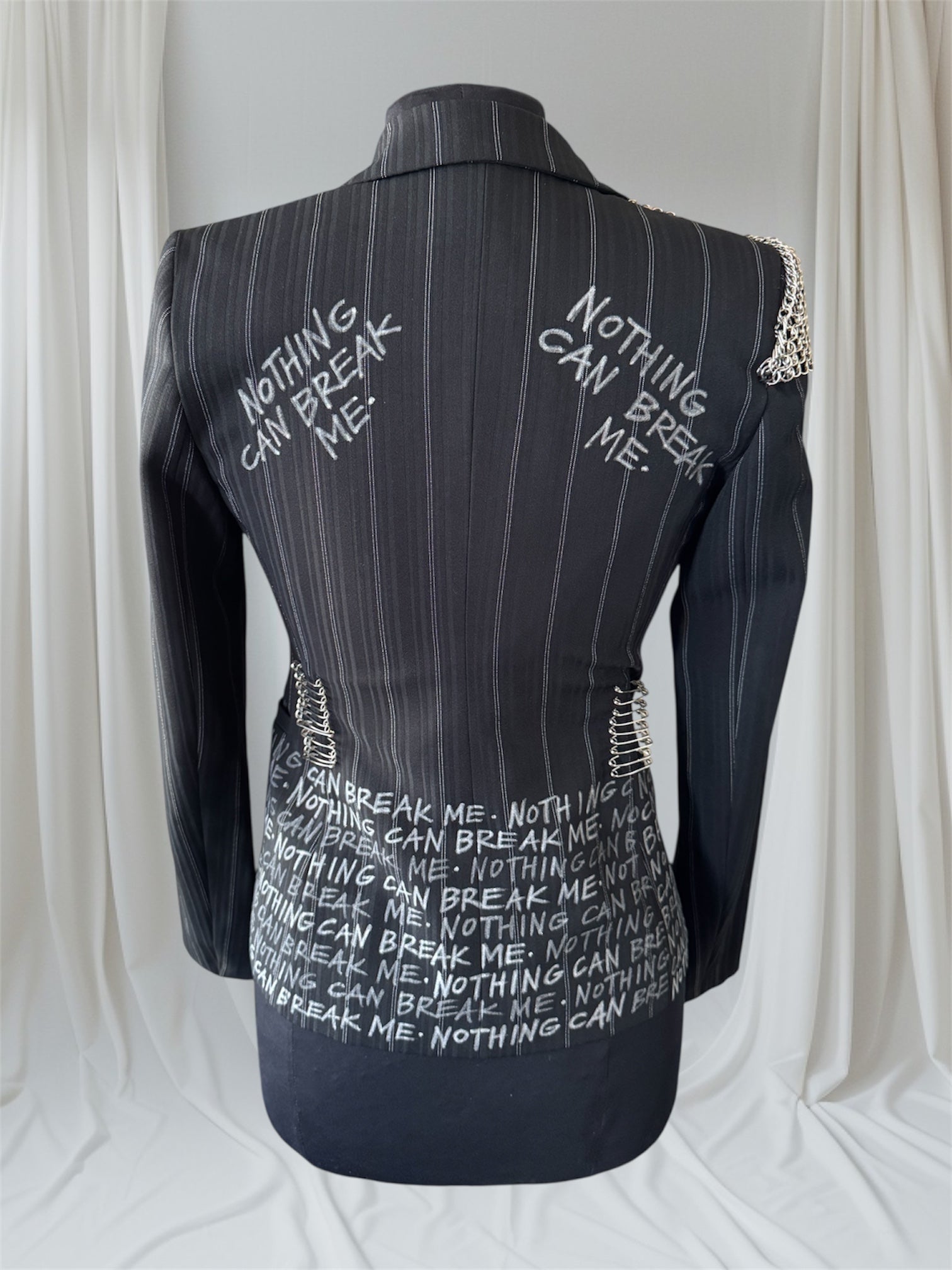 LIVE IN THE NOW Size US 4 Women's Suit Jacket with chain mail shoulder Hand-painted women’s punk-inspired suit jacket with spiked lapels. A classic tailored silhouette transformed into a one-of-a-kind fashion statement. Each jacket is individually upcycled and customized by hand — a refusal of fast fashion and mass production. Details• Hand-painted statement• Spiked lapels• Classic tailored suit jacket silhouette• Upcycled / sustainable• Dry clean safe Created in a single size as part of our upcycled collection. Custom commissions are available through our Custom Suit Jacket program:https://punkmajesty.com/pages/custom-suit-jackets Returns are accepted if you notify us directly via email within 7 days of delivery to receive instructions. Items must be returned unworn in original condition, insured with tracking number provided. Measurements 17 inch chest 14 3/4 inch waist 23 1/2 inch sleeve length 14 inch shoulders 24 inch back length