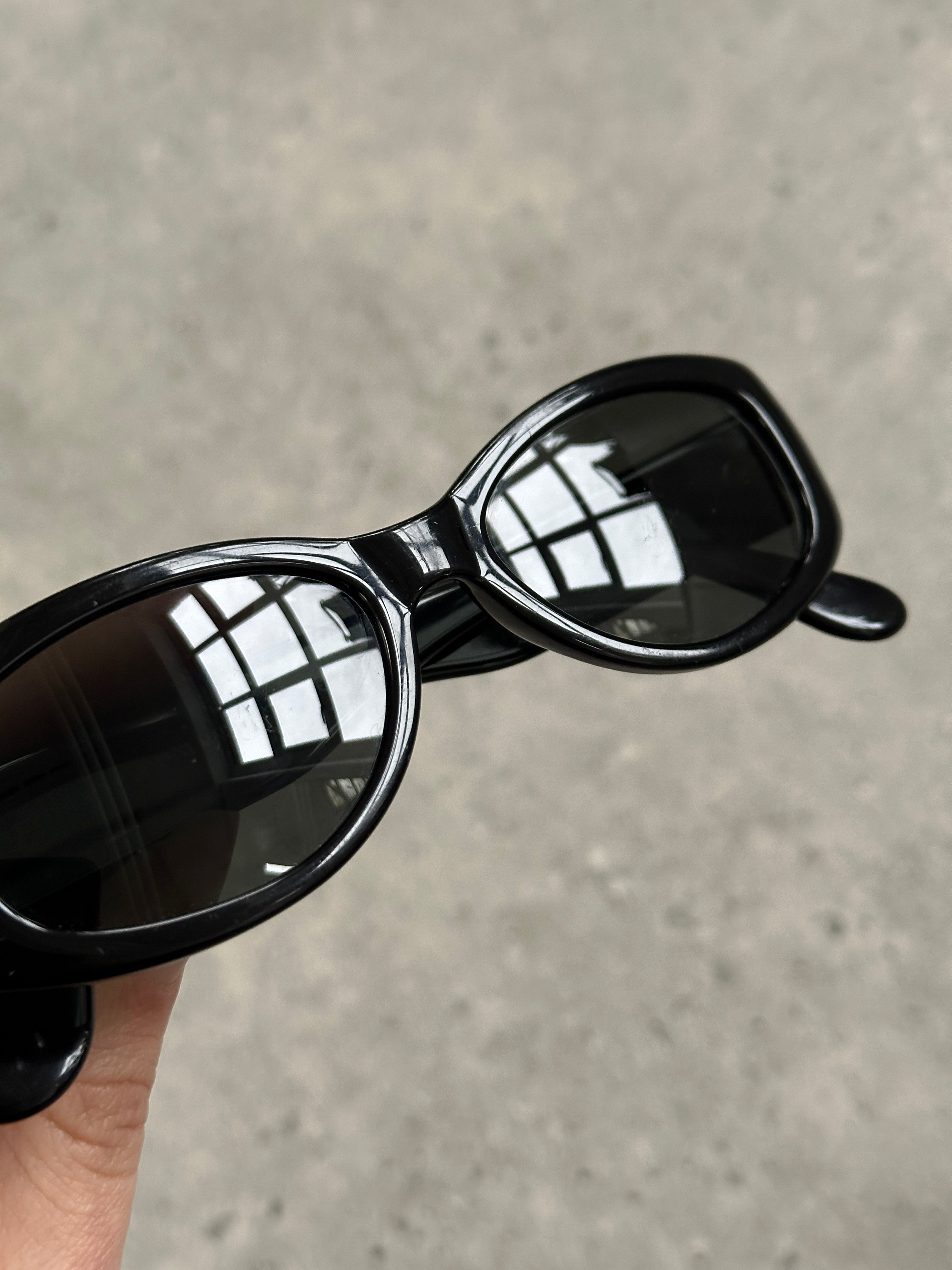 Vintage early 2000s black sunglasses by Emporio Armani, featuring a sleek oval rectangular silhouette with a softly curved frame profile. Crafted from polished black acetate with slim arms and subtle Emporio Armani logo detailing at the temple for a clean, minimalist finish.