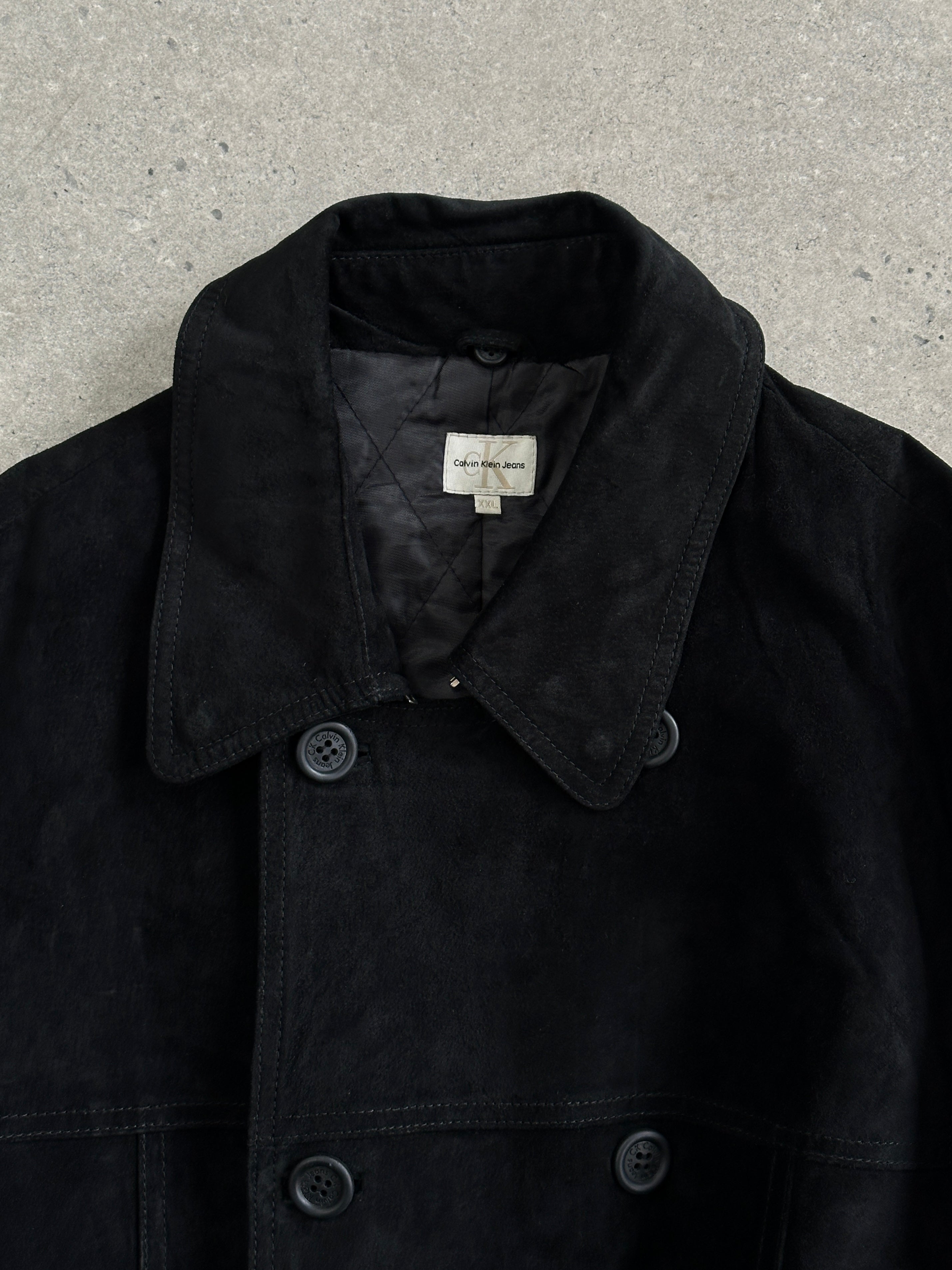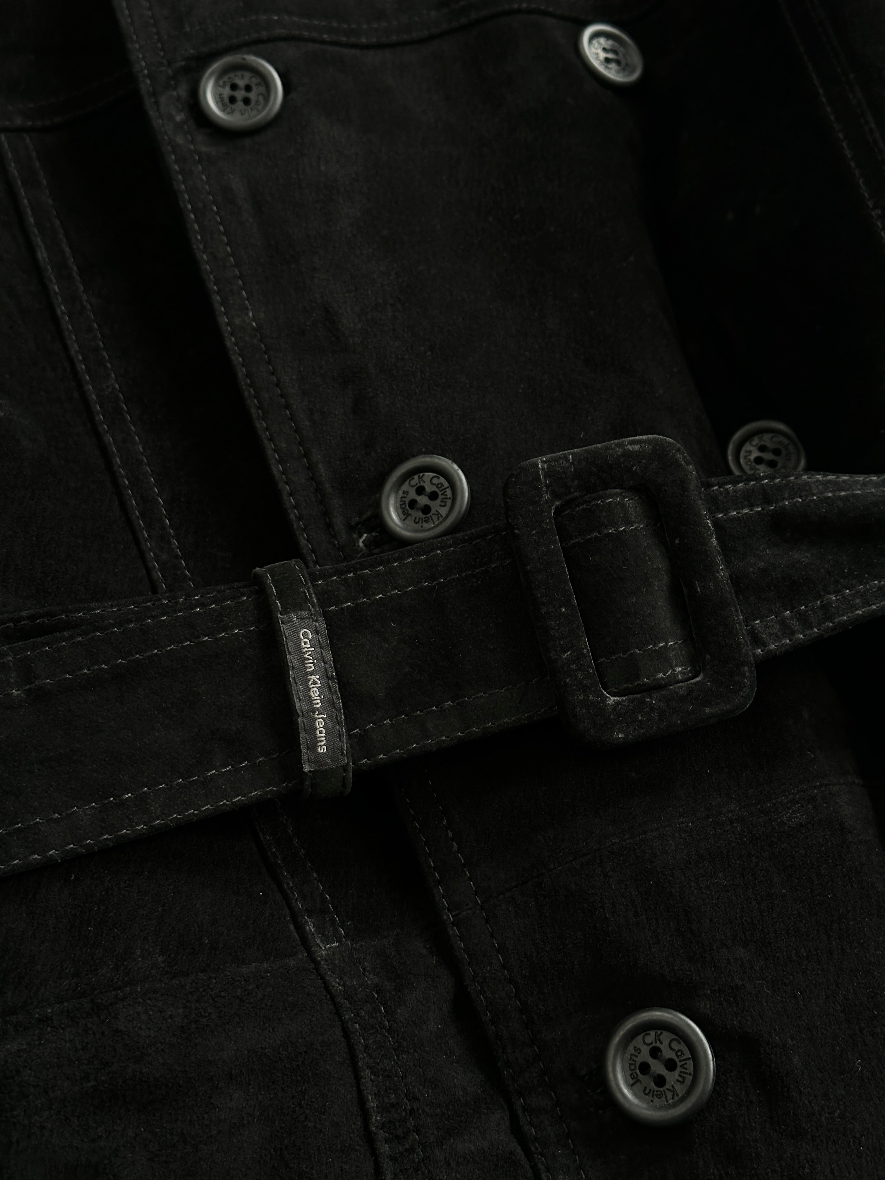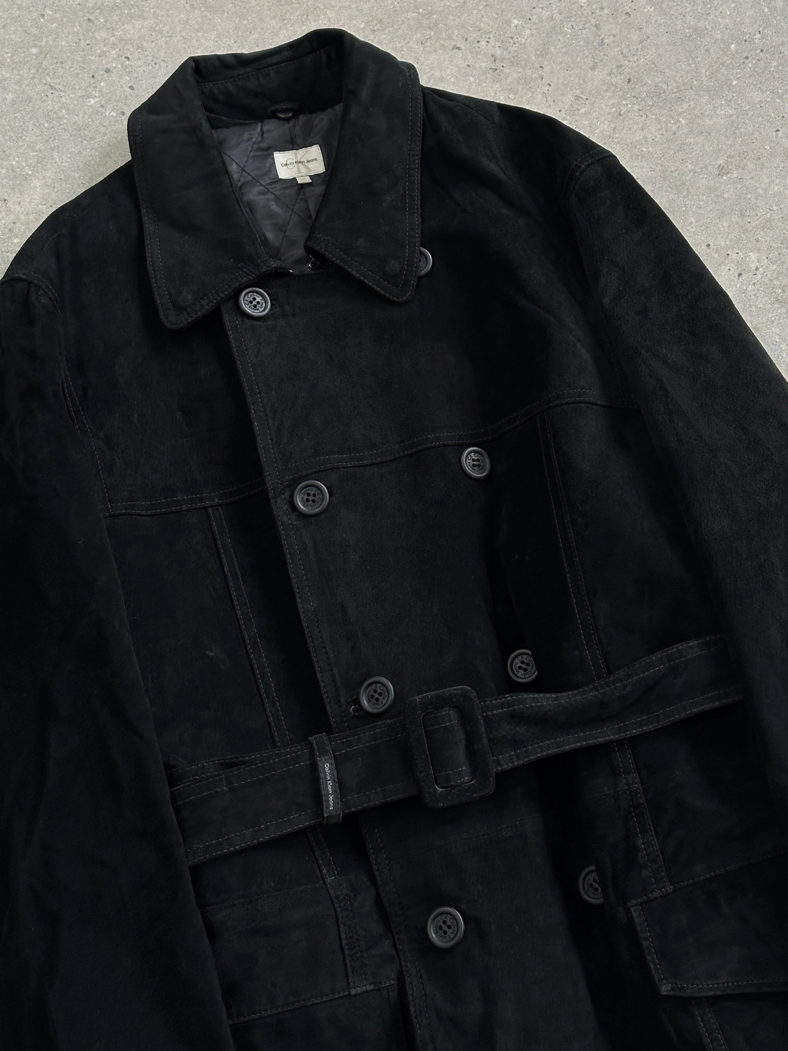 Vintage 1990s Calvin Klein Jeans trench coat in soft black suede with a belted waist, double-breasted front and quilted lining.