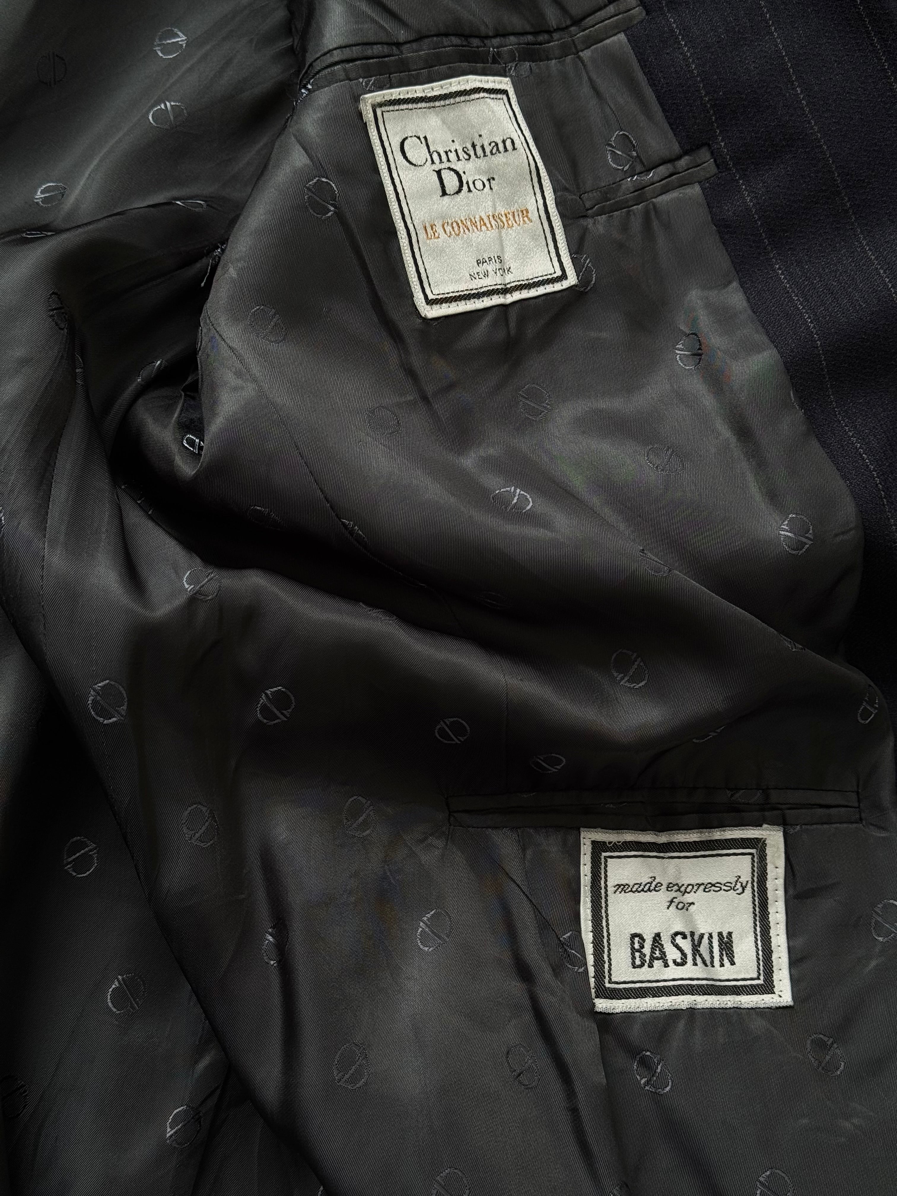 A navy vintage Christian Dior Le Connaisseur blazer in pure virgin wool with a refined pinstripe and tonal CD monogram lining. Cut with structured shoulders, notch lapels and a classic two button front, it reflects late 1980s tailoring with a relaxed straight silhouette.