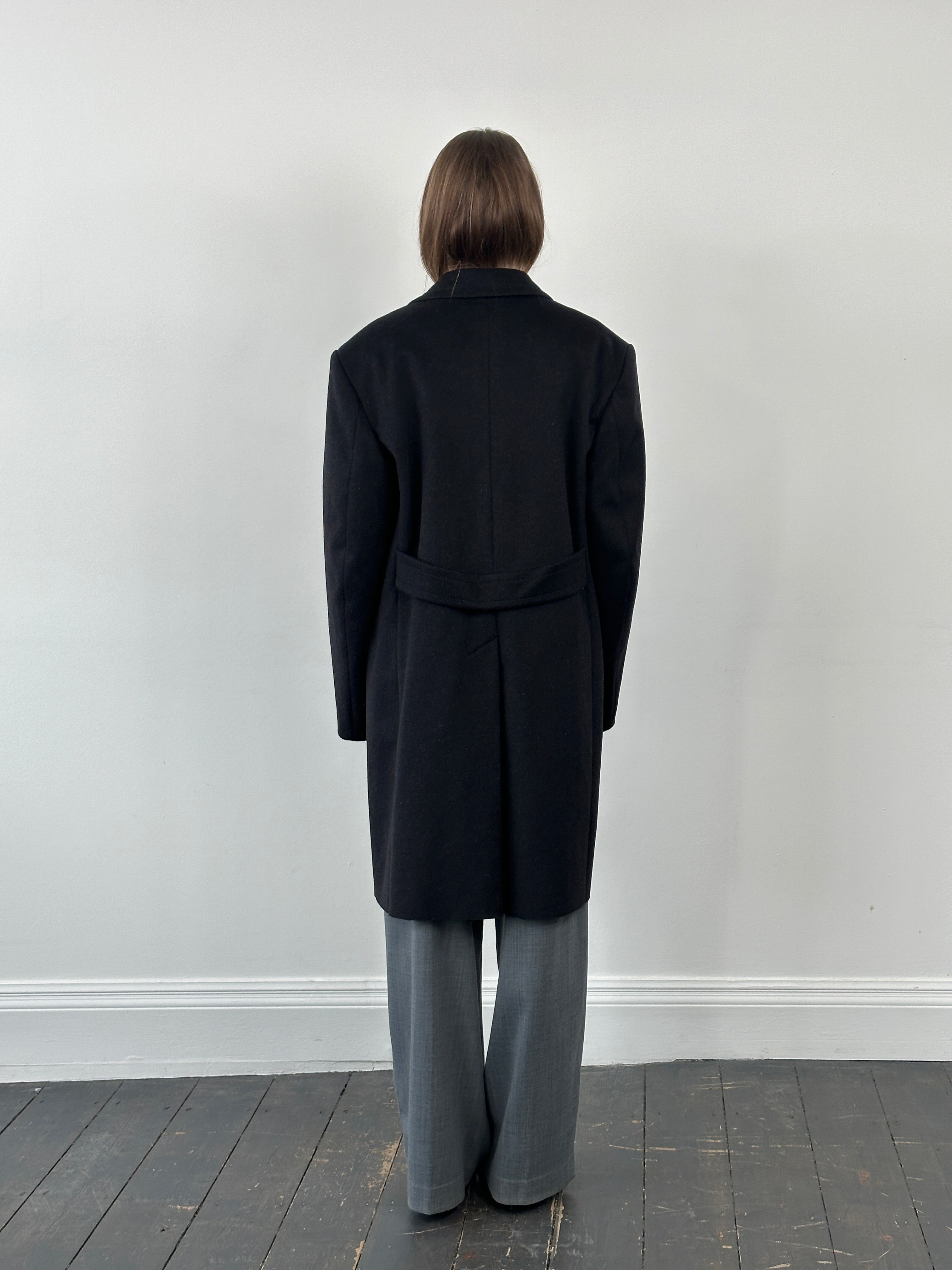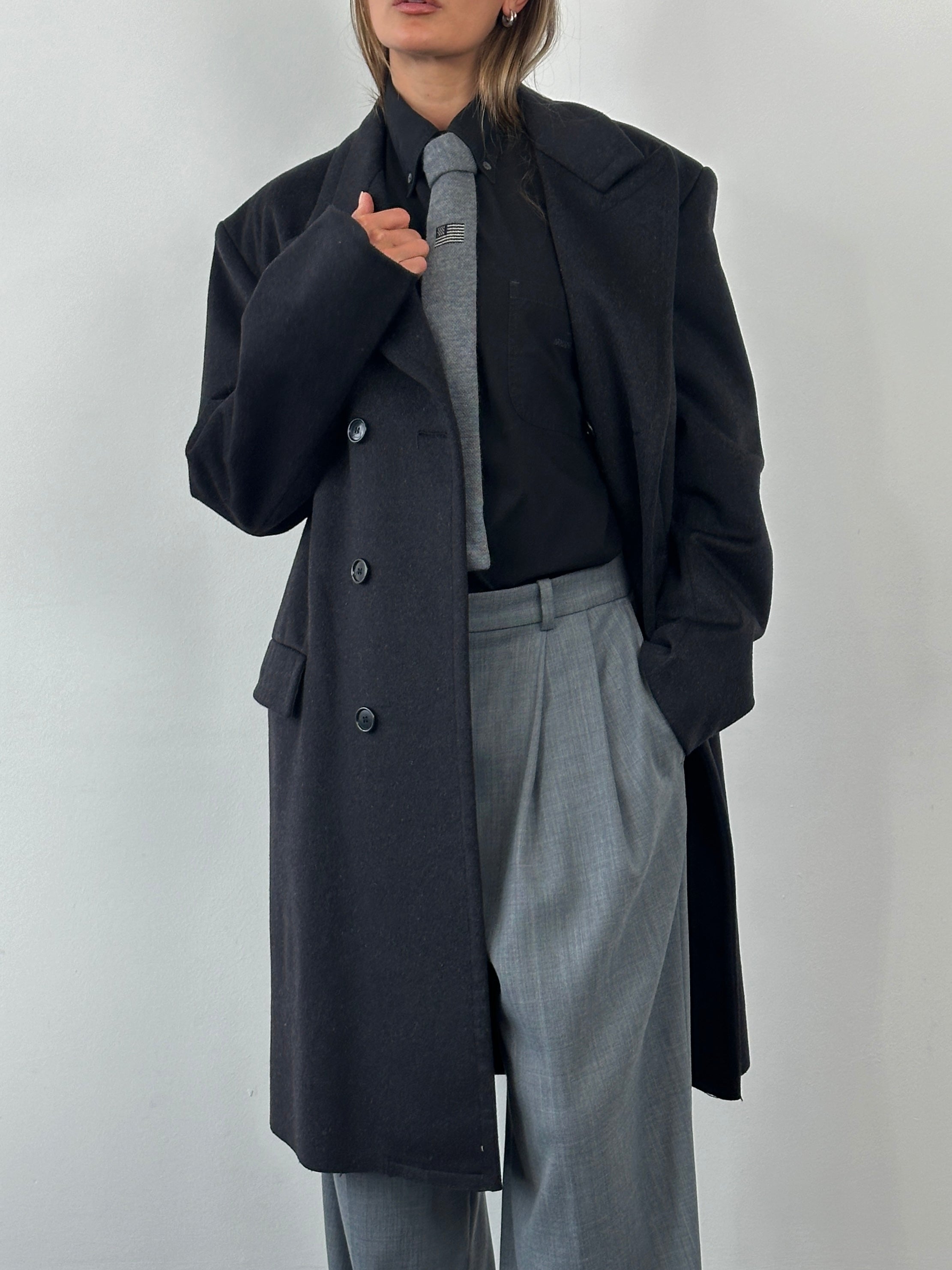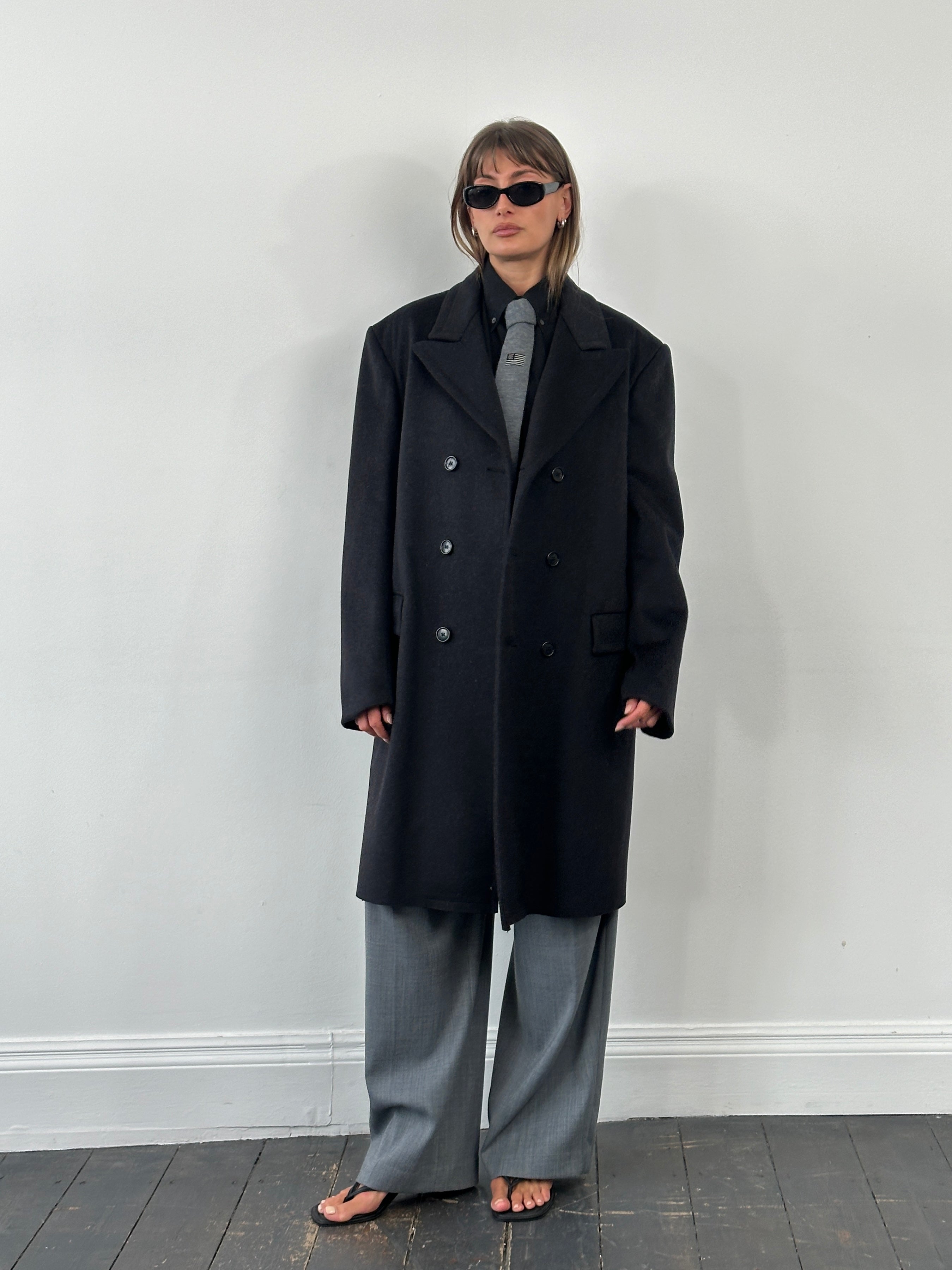 Vintage 1980s grey wool double breasted coat with a structured tailored silhouette and wide lapel design. Cut with a longline profile and strong shoulder shape, finished with a clean minimal front and classic tailoring details.