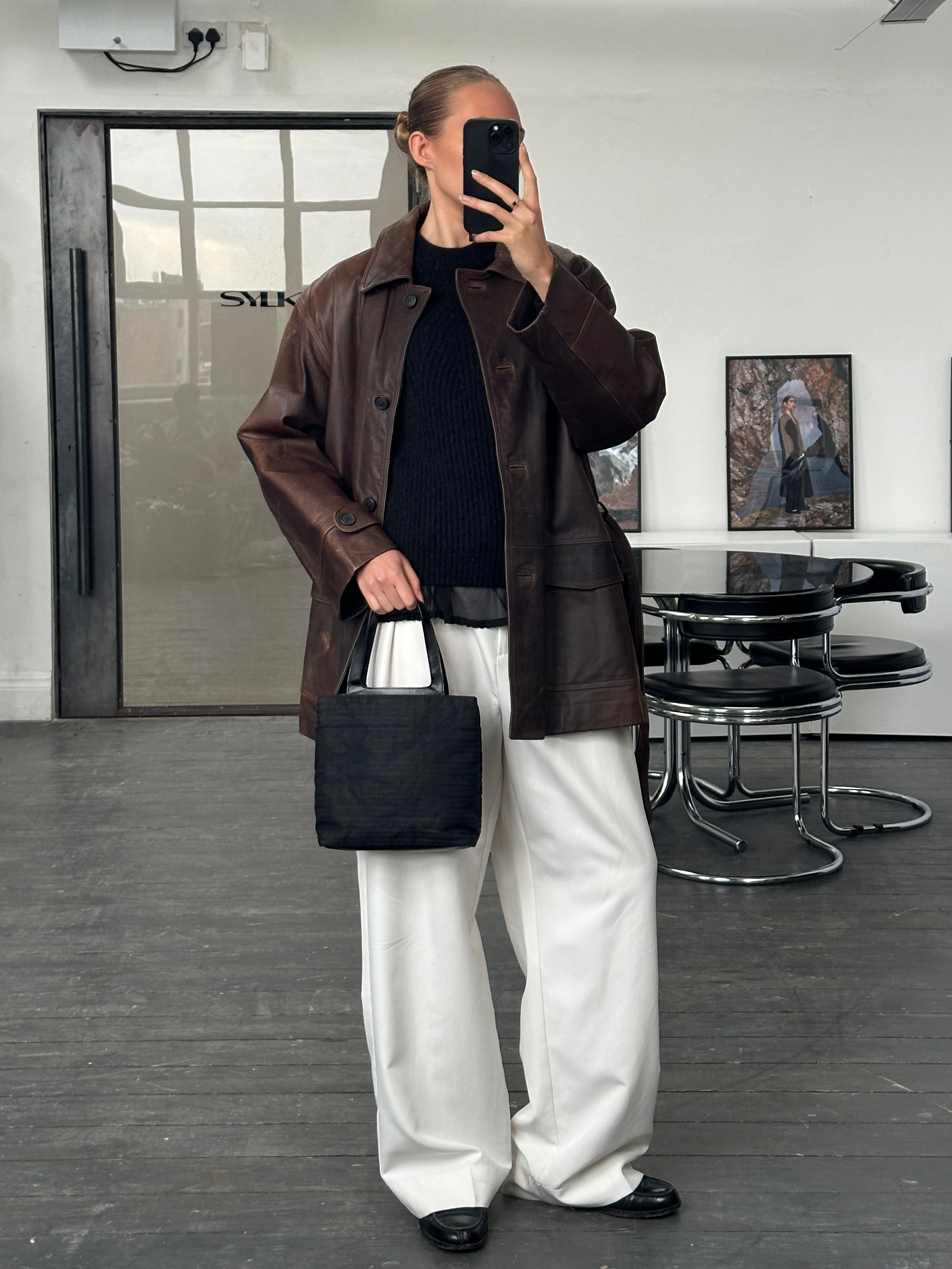 Vintage Italian made leather jacket crafted in supple real leather with a belted waist, matte finish and timeless aviator-inspired silhouette.