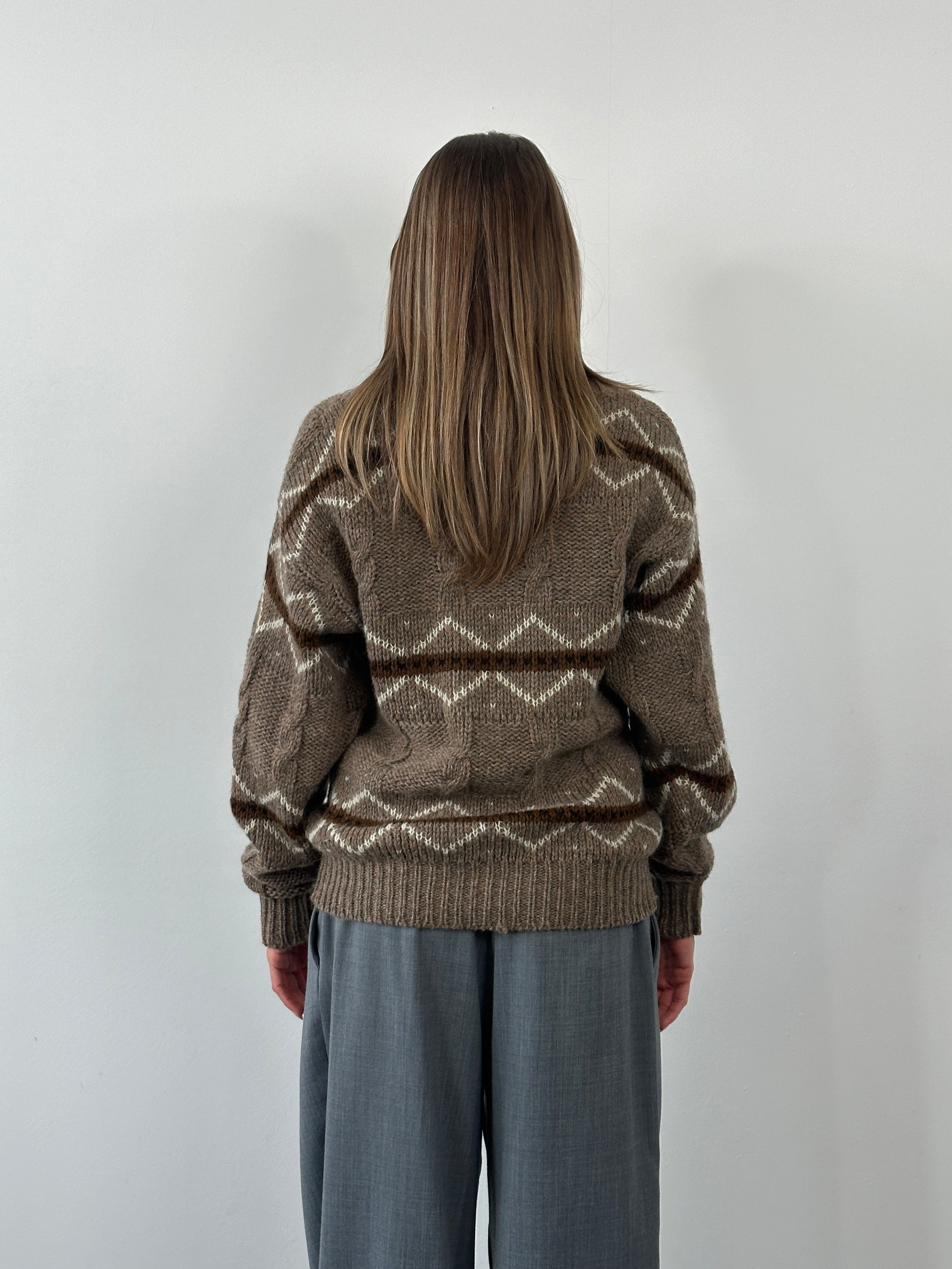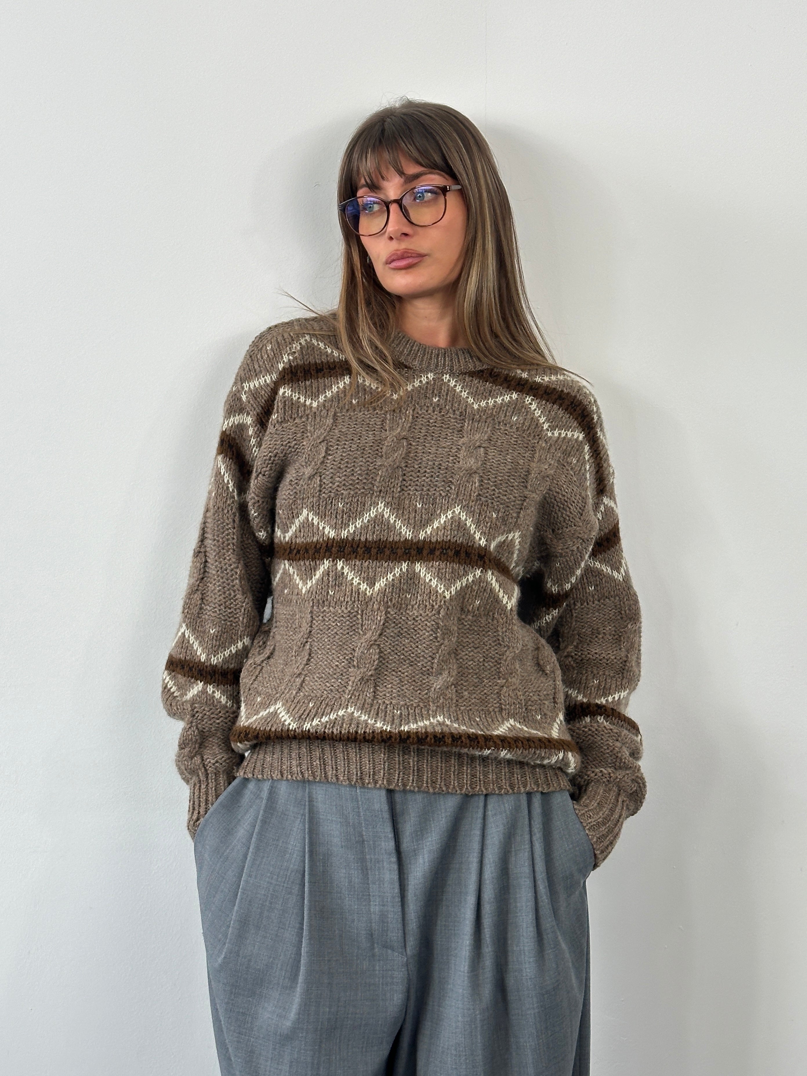 A brown 1990s vintage knitted jumper from Italian knitwear label Carrera Knitwear, featuring a chunky stripe pattern and a soft, heavyweight wool handle. Designed with a classic crew neckline and a relaxed fit.
