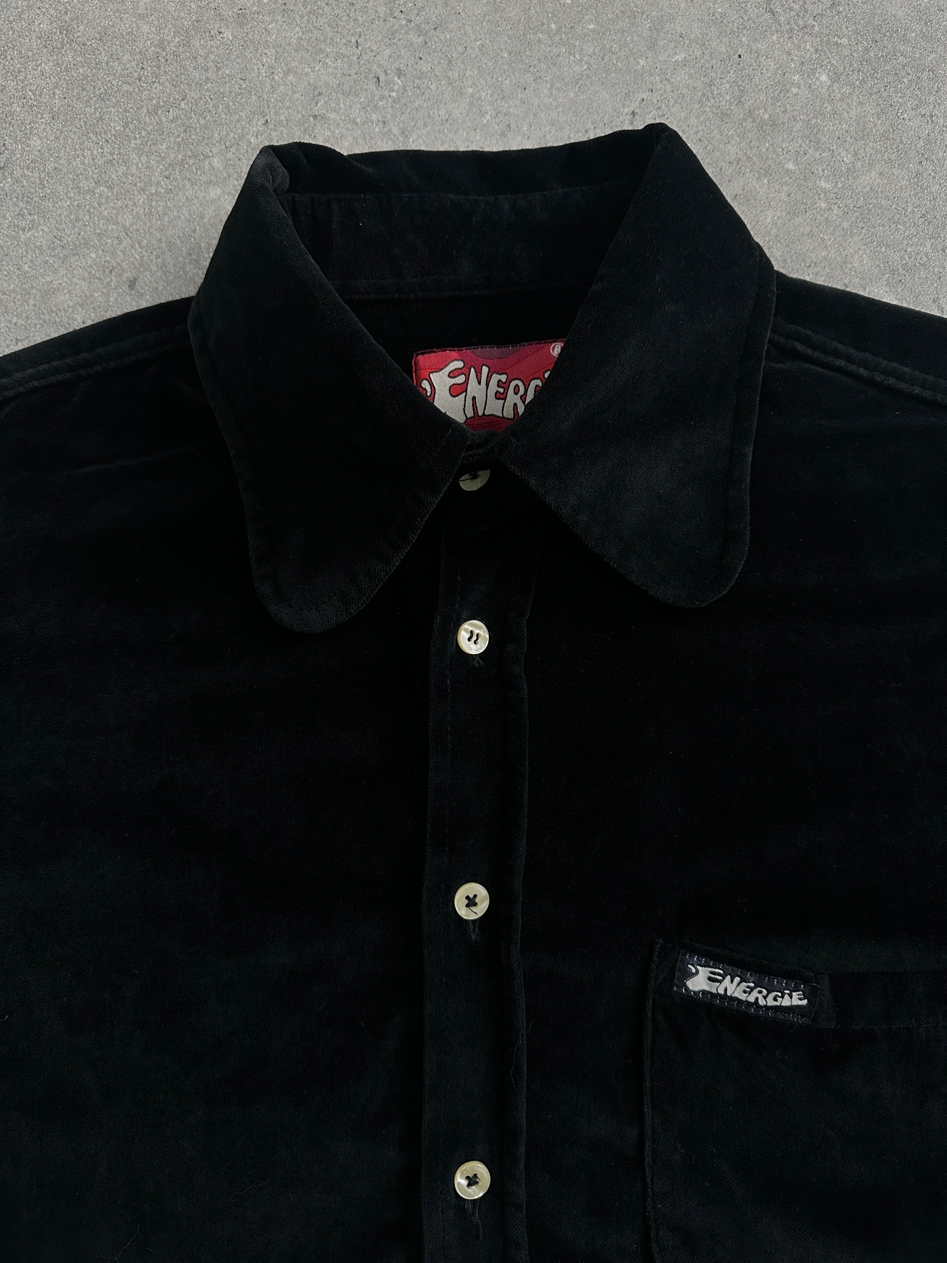 Italian vintage minimal black velvet shirt from Energie with a soft drape and rounded collar. A clean Italian 1990s piece that brings a refined, understated mood to contemporary styling.