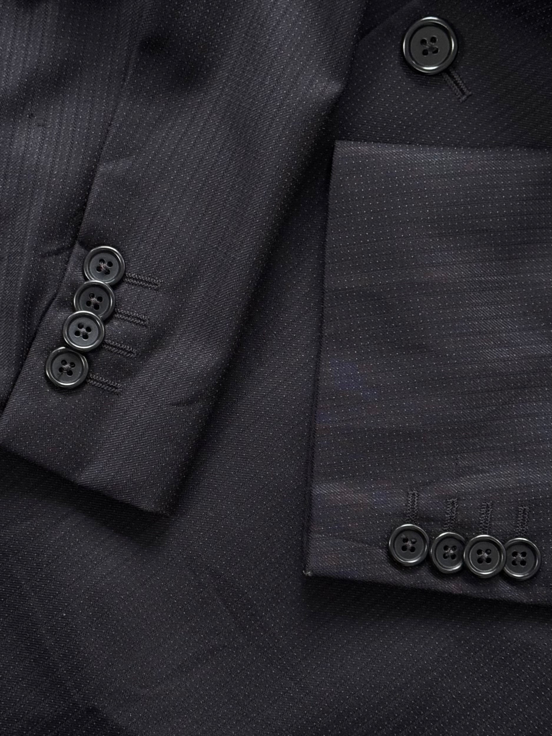 A navy vintage 1990s Loro Piana blazer crafted in fine Italian wool with a subtle micro dot weave that adds quiet texture and depth. Cut with structured shoulders, a classic notch lapel and a clean two button front, it holds a softly tailored silhouette with a smooth drape through the body.