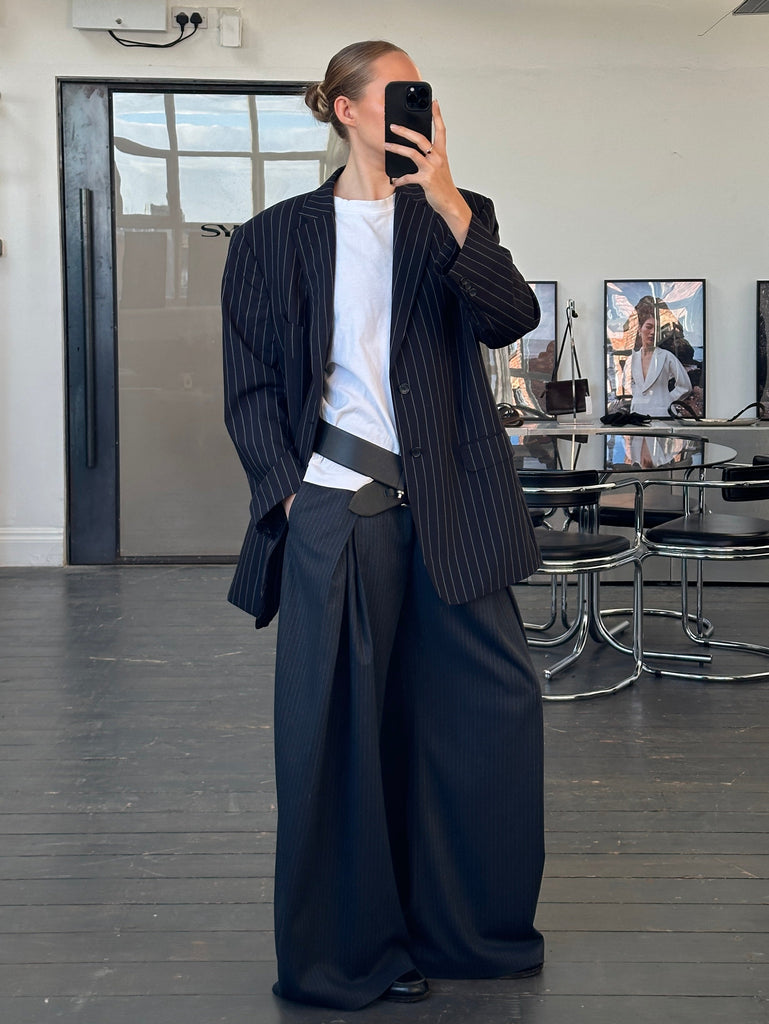 ~ Navy wool with fine vertical pinstripes for a lengthened silhouette