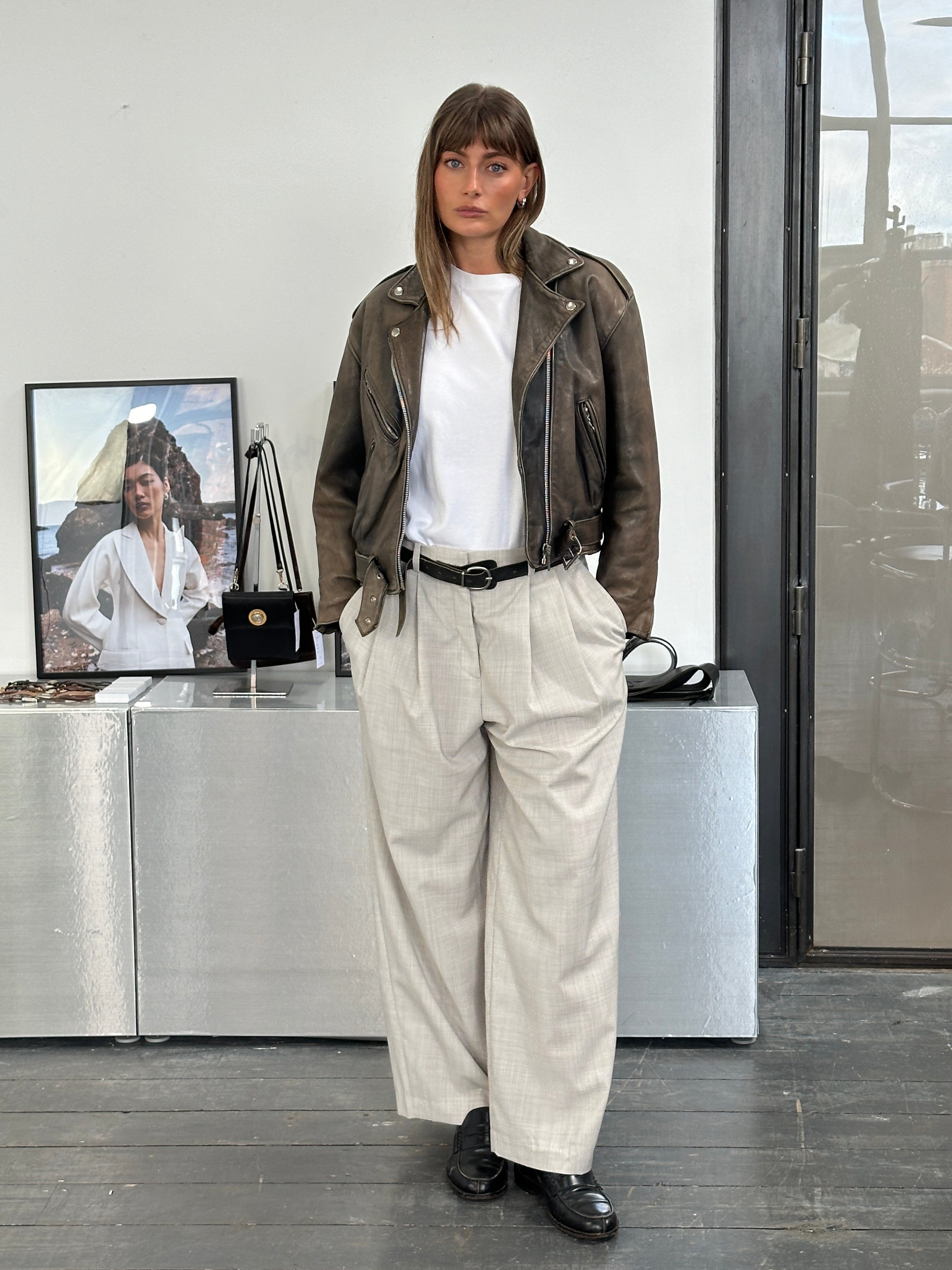 Vintage 1980s women’s leather biker jacket in a natural taupe tone black tone. A structured cropped silhouette with a classic biker shape and a lightly padded interior.