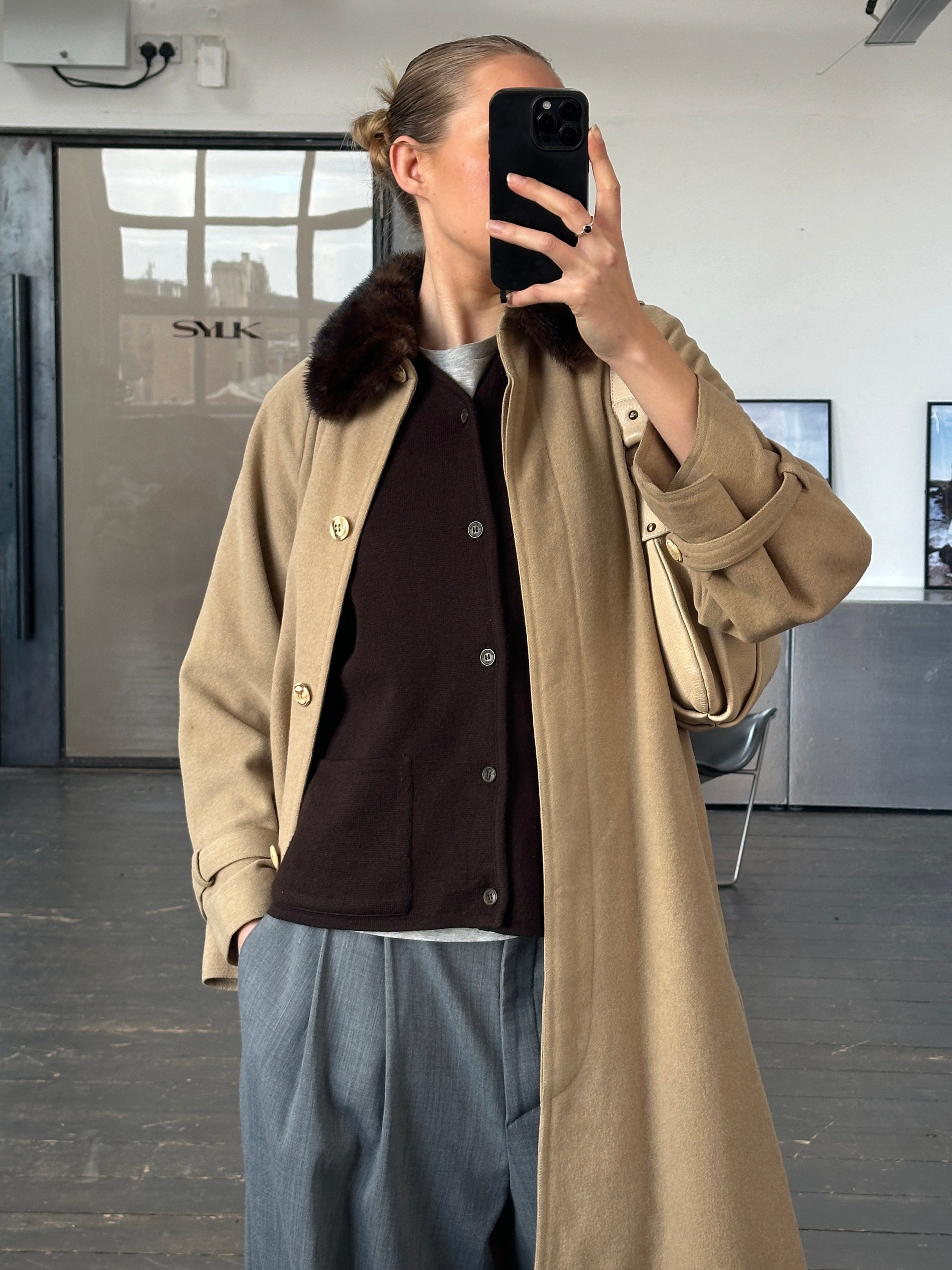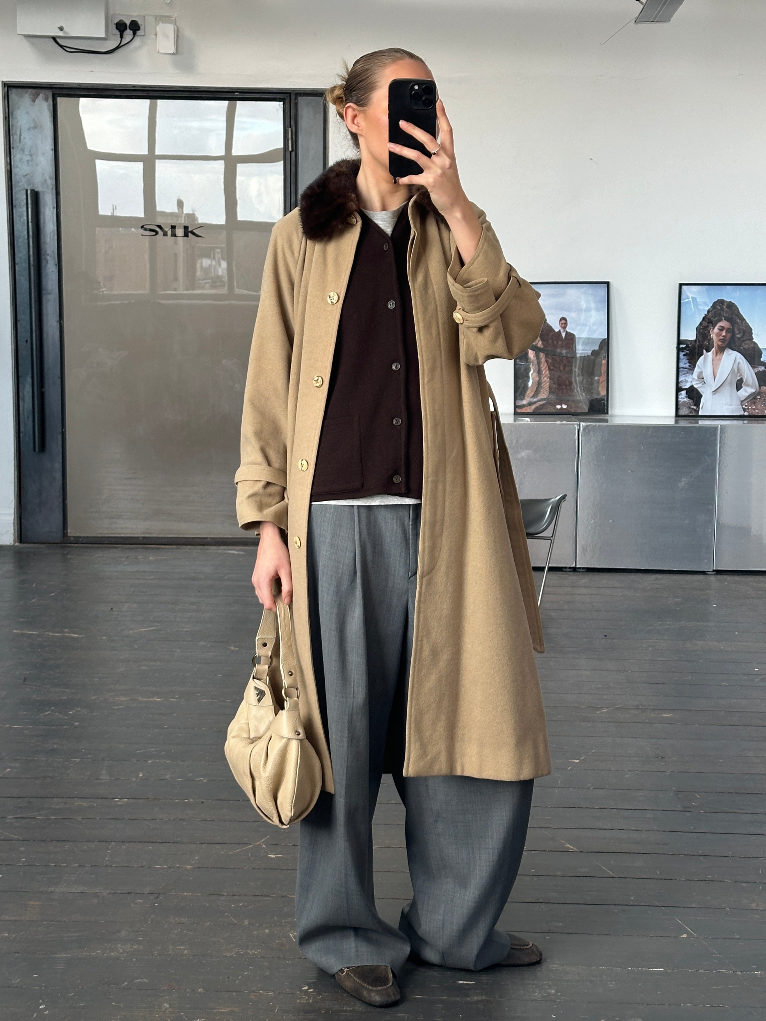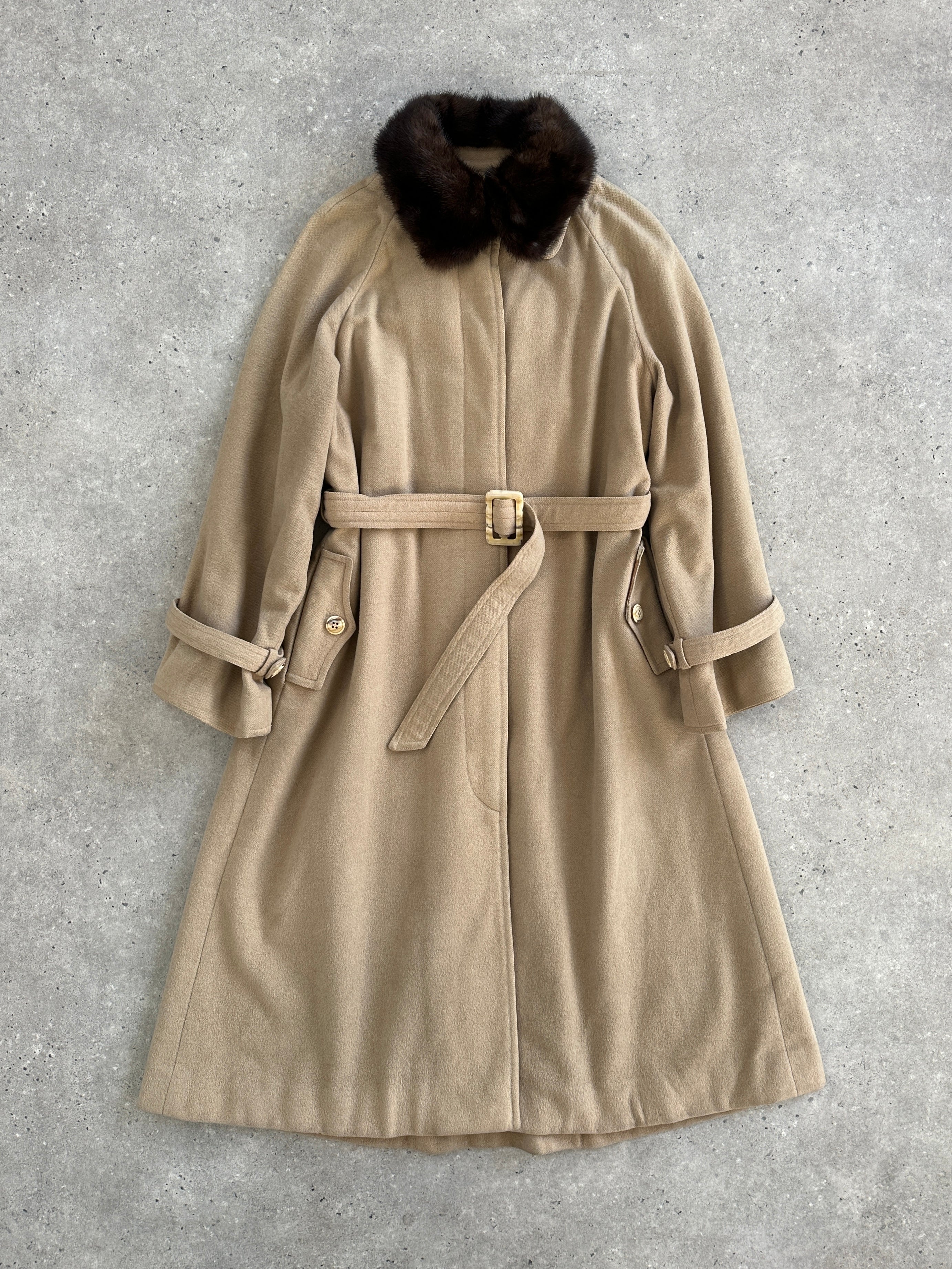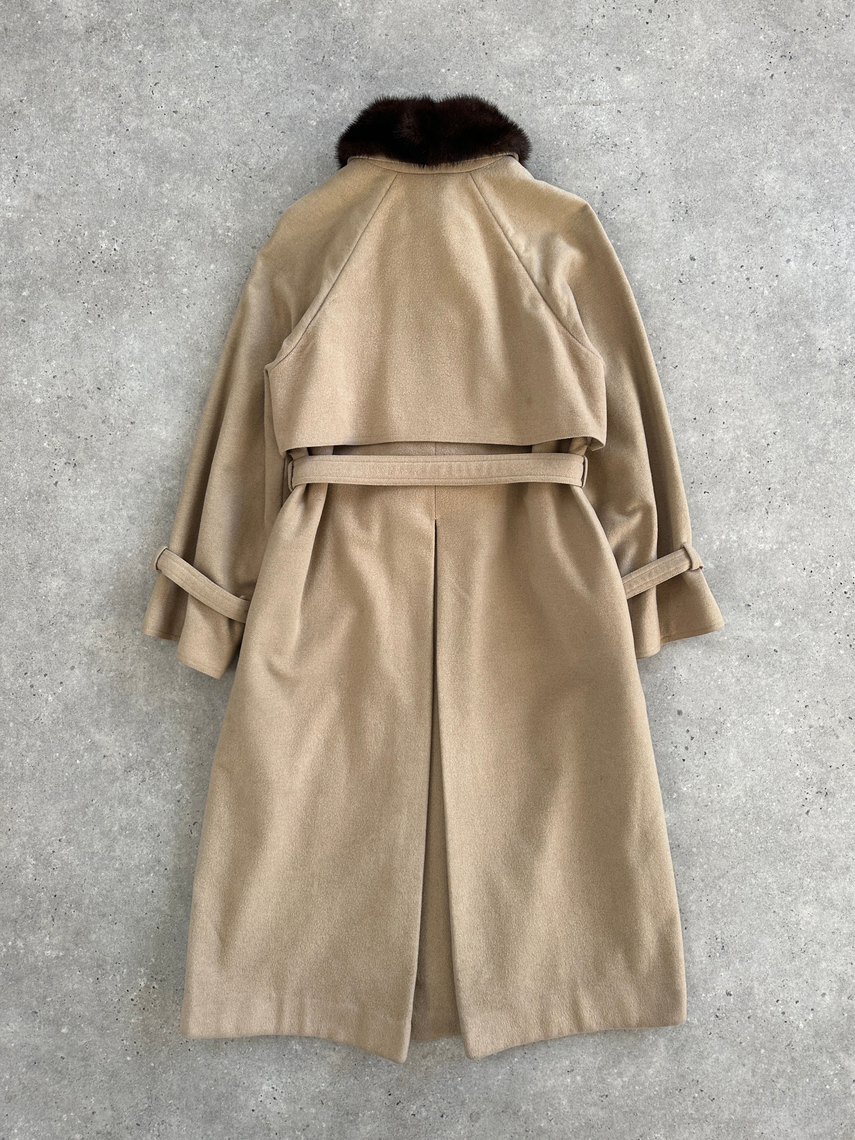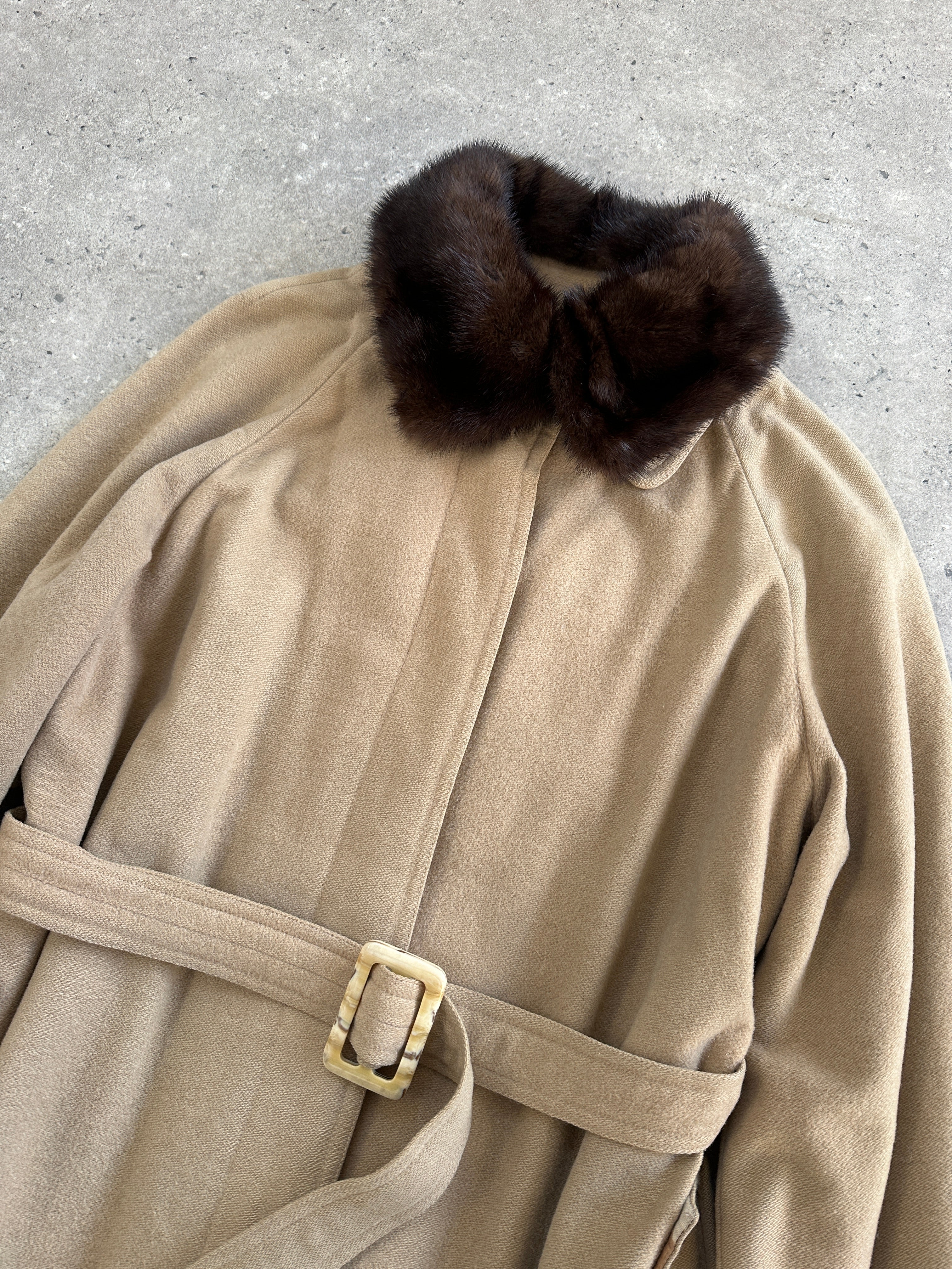 A refined vintage beige 1980s wool coat designed with a concealed placket and belted silhouette. Crafted in a double-faced construction with no lining. Finished with a hand-attached fur collar that can be removed for a more minimal look.