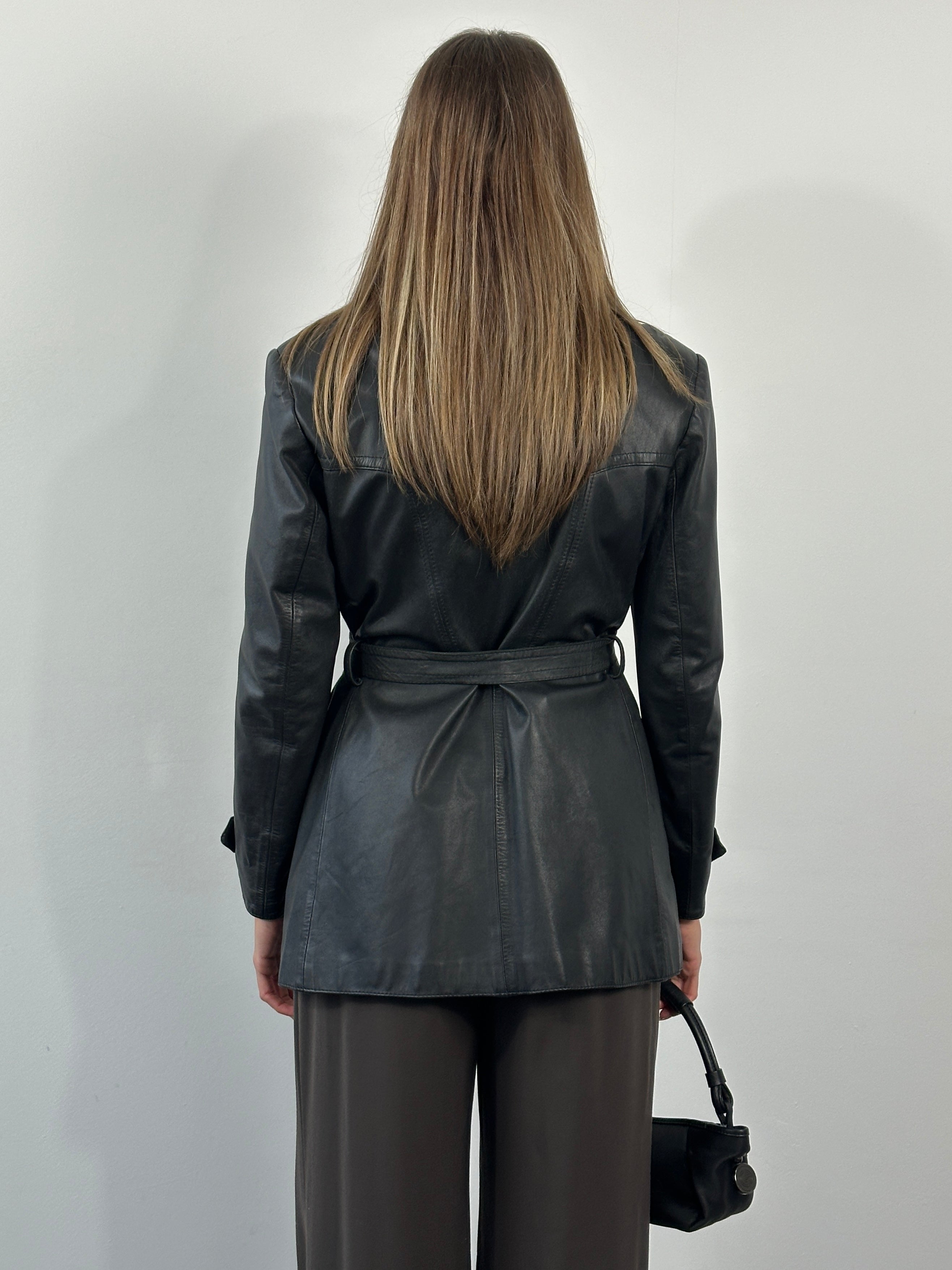 Vintage 1990s soft black leather jacket with a structured collar, tonal button fastening and matching tie belt. Designed with oversized flap pockets and subtle western style seam detailing, creating a relaxed mid length silhouette with gentle waist definition.