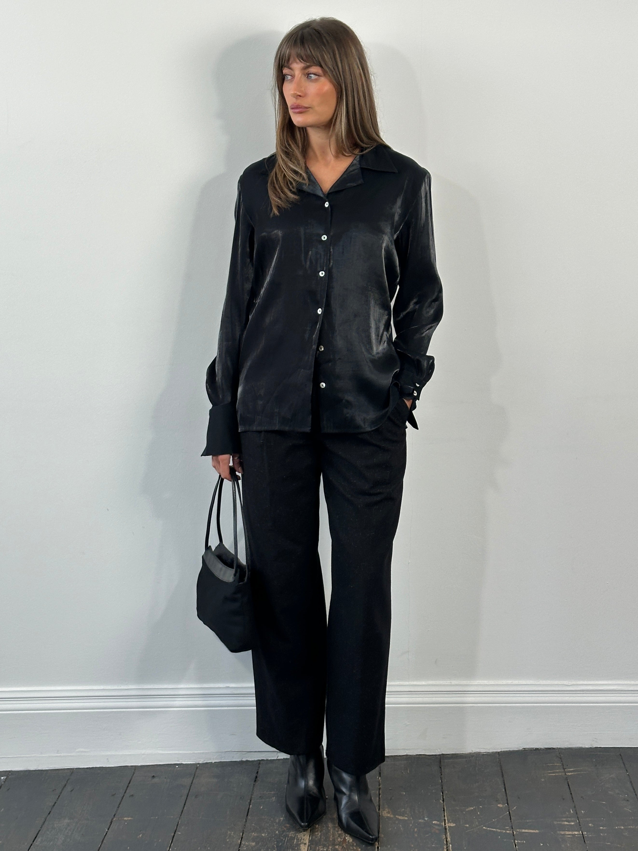 A vintage 1990s Biaggini black shirt with a subtle high sheen finish and fluid drape. Designed with an open collar, elongated silhouette and dress style cuffs, finished with mother of pearl buttons for a refined evening feel.