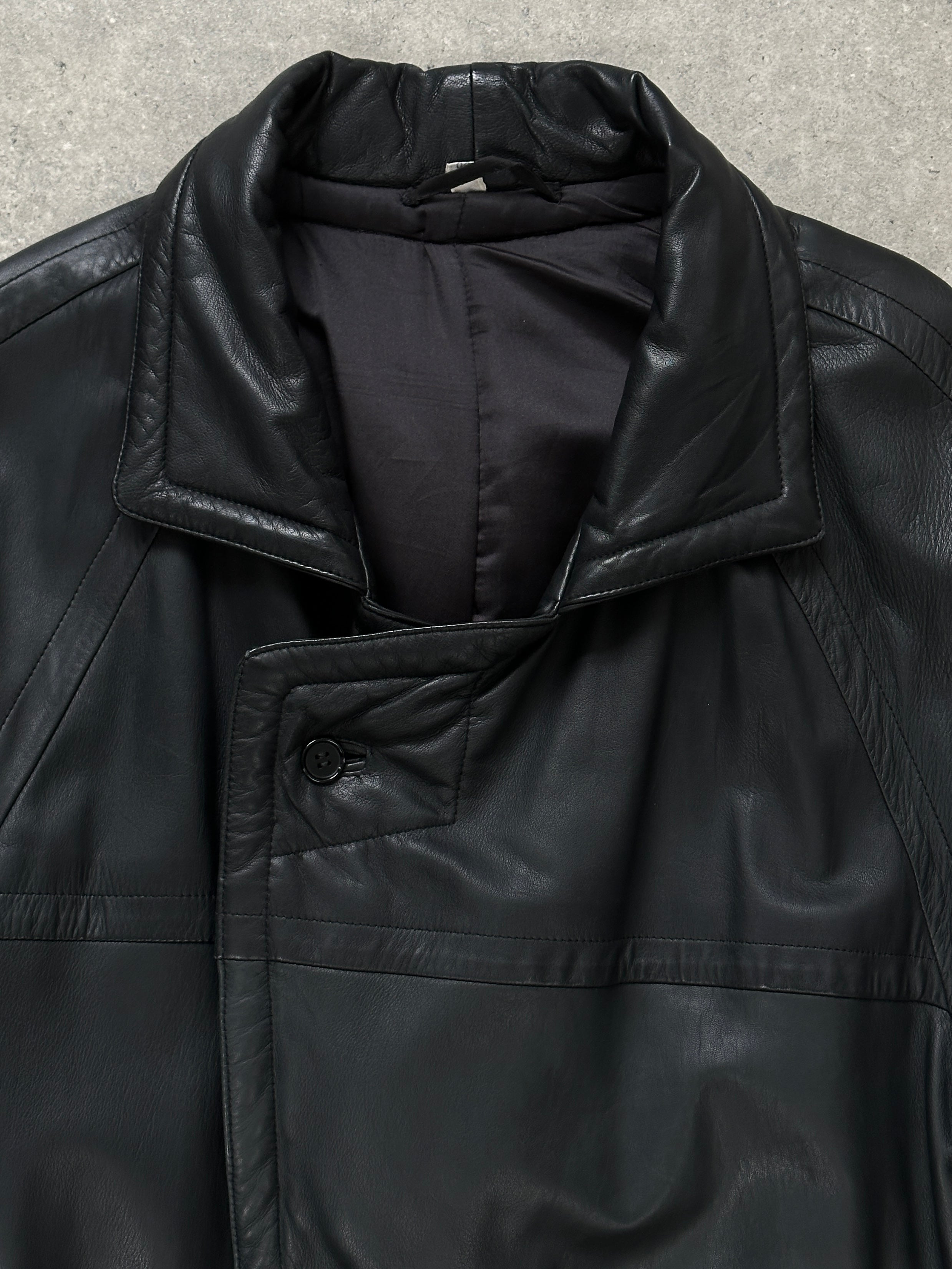 A vintage black 1990s leather trench coat with a structured belted silhouette and front button fastening. Designed with a softly padded lining for warmth, finished with clean panelled construction and a relaxed oversized drape typical of late 1990s leather outerwear.