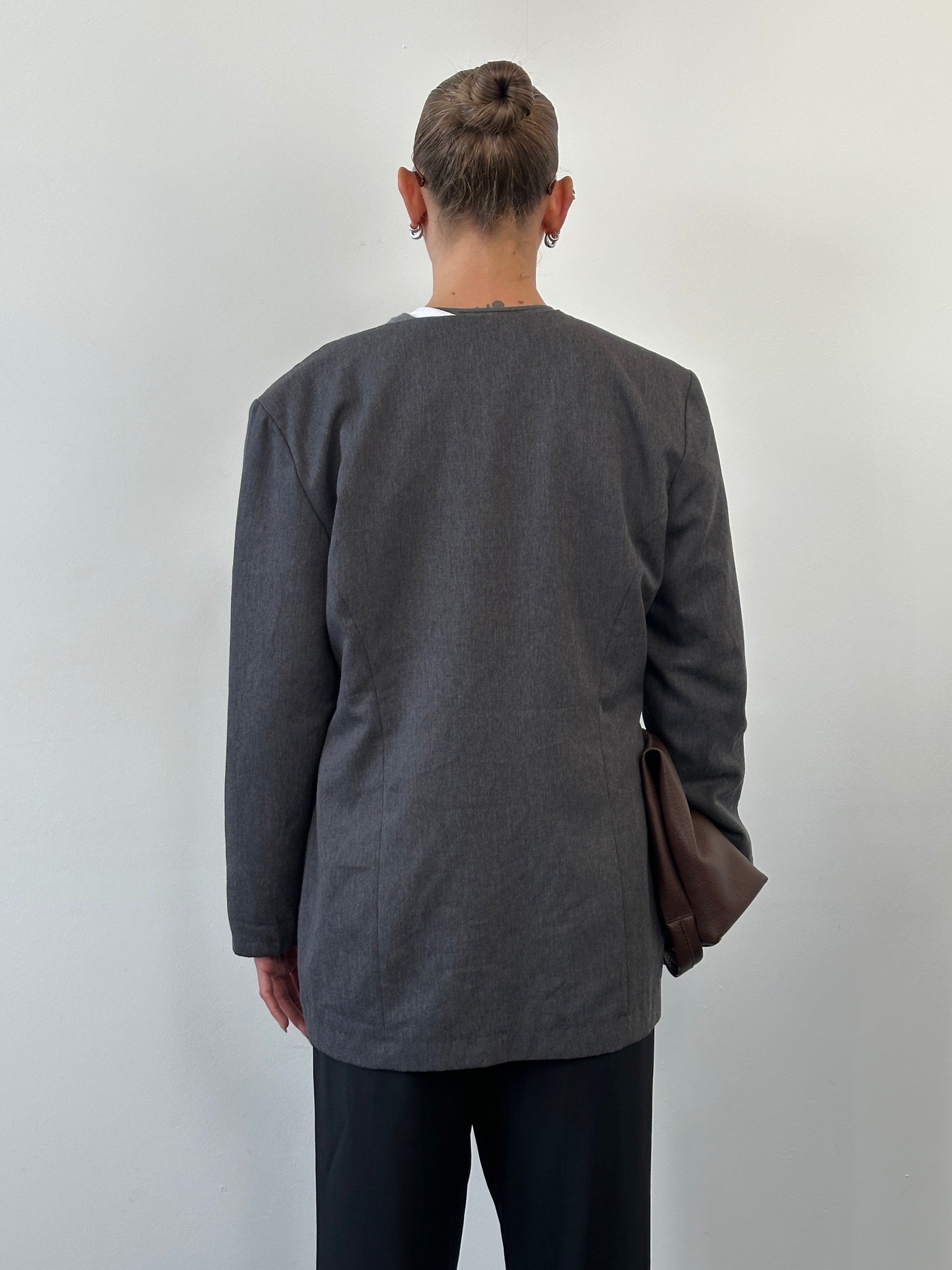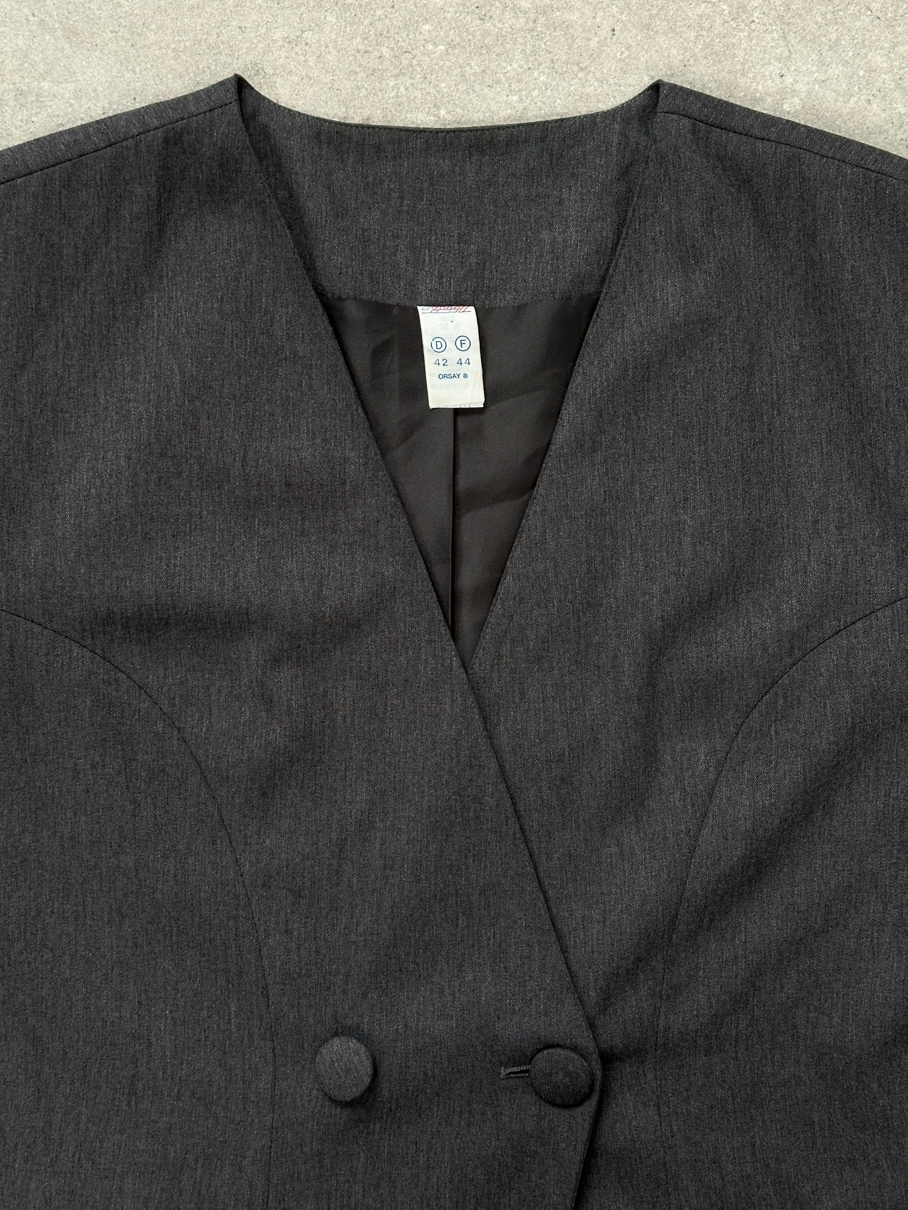 A vintage 1990s minimal blazer in a soft mid-grey tone by Orsay, designed with a clean collarless neckline and subtle wrap-style front. Tailored with gentle structure through the shoulders and body, offering a refined minimalist silhouette that layers effortlessly across seasons.