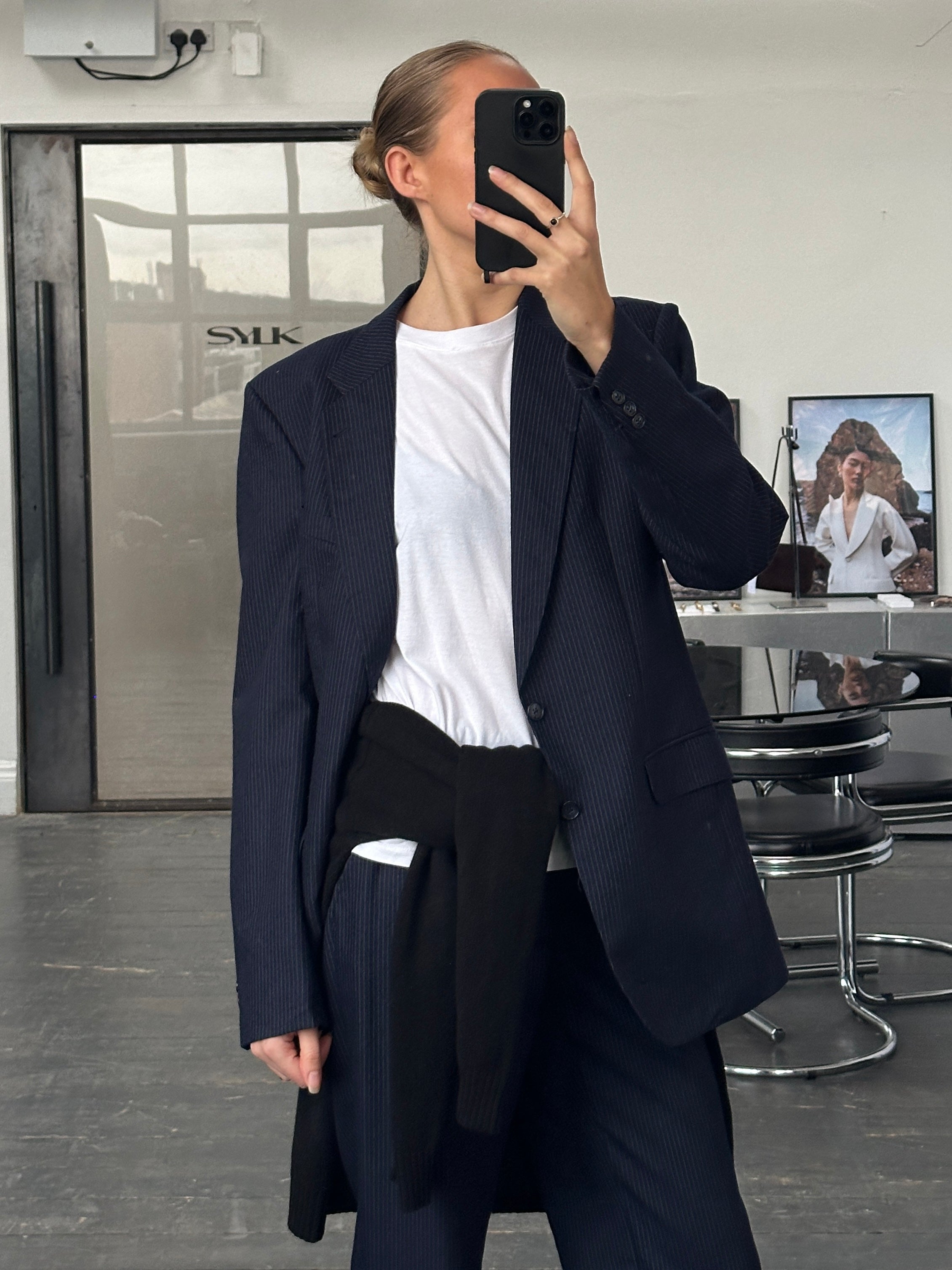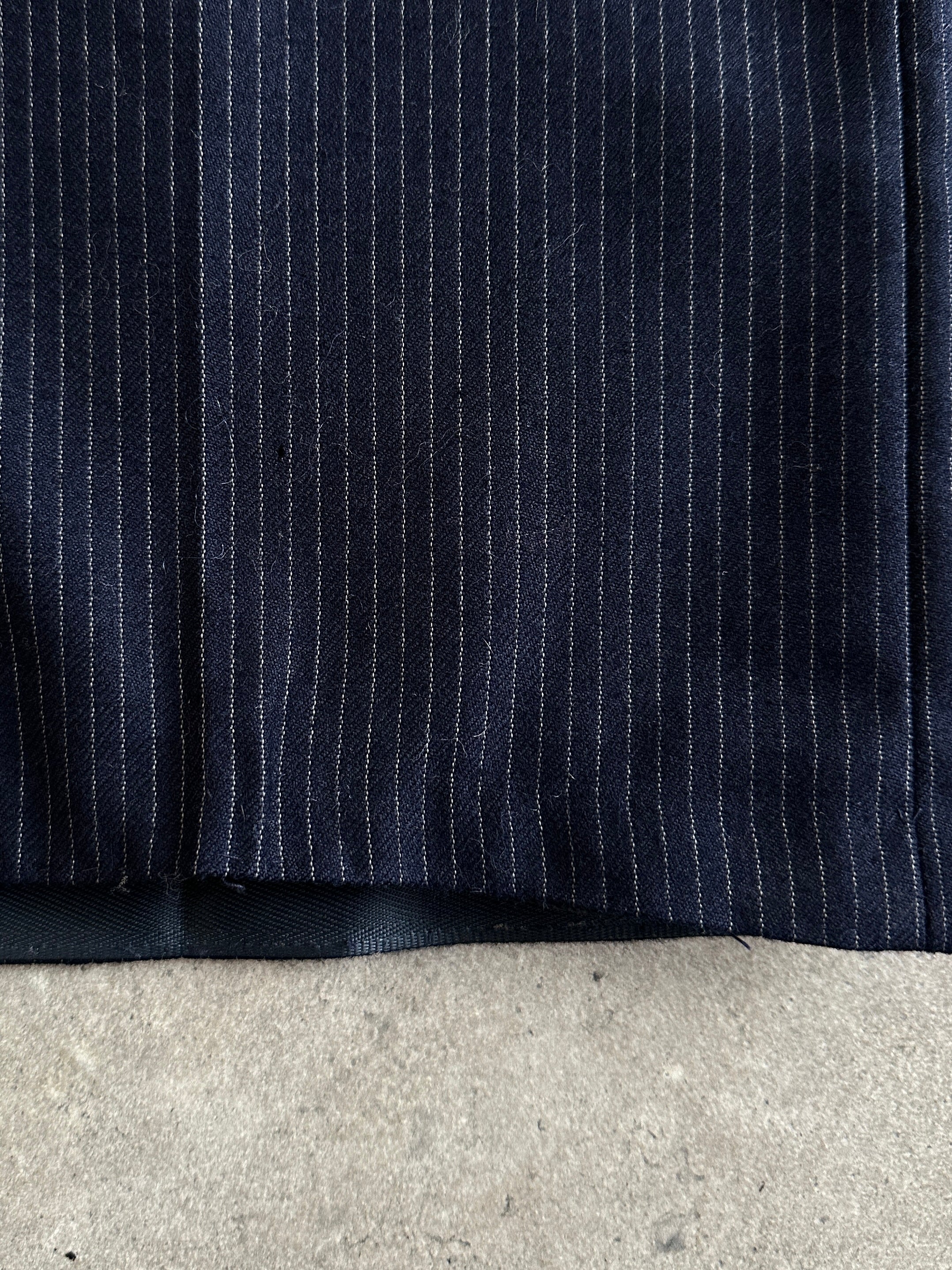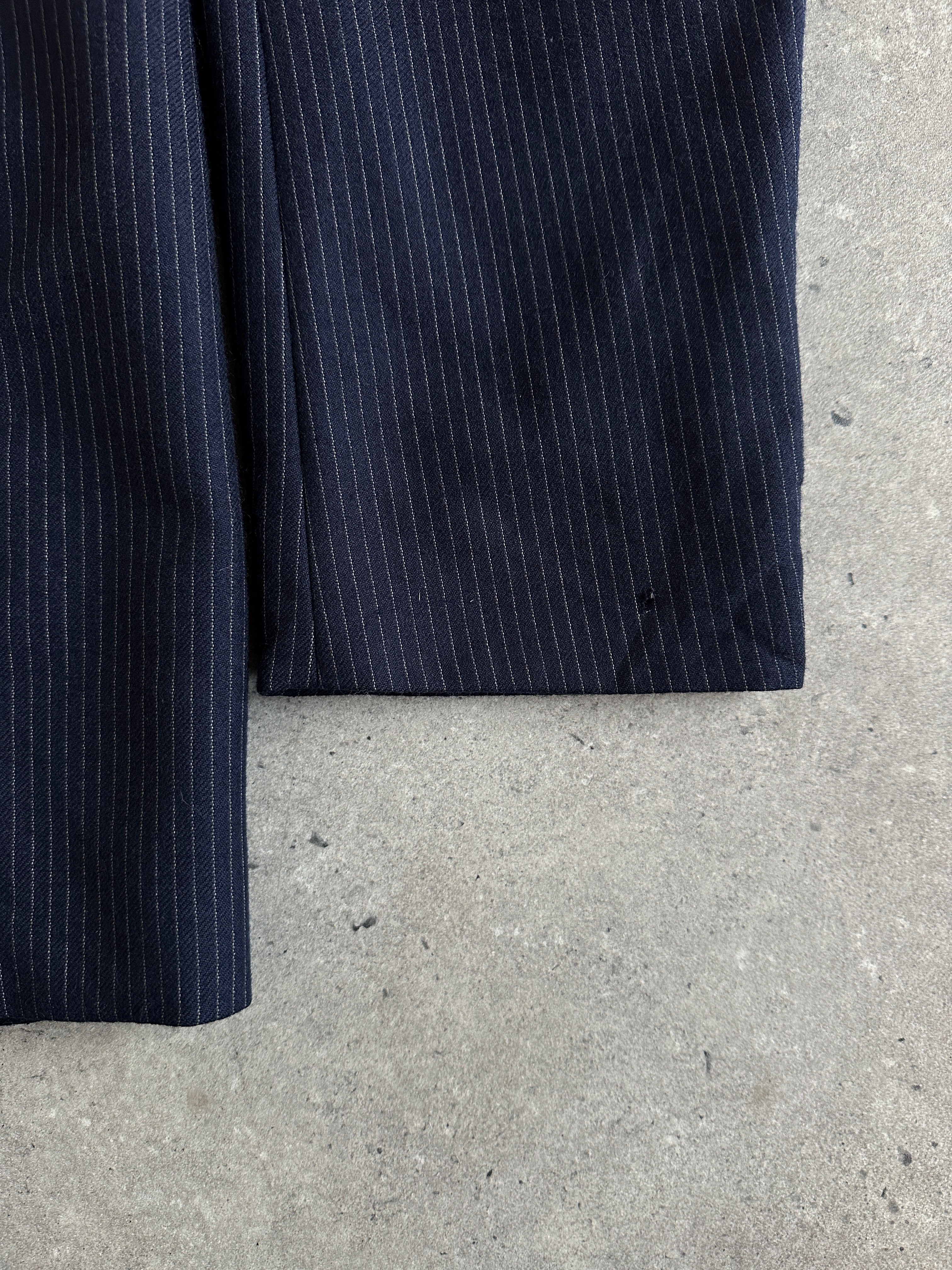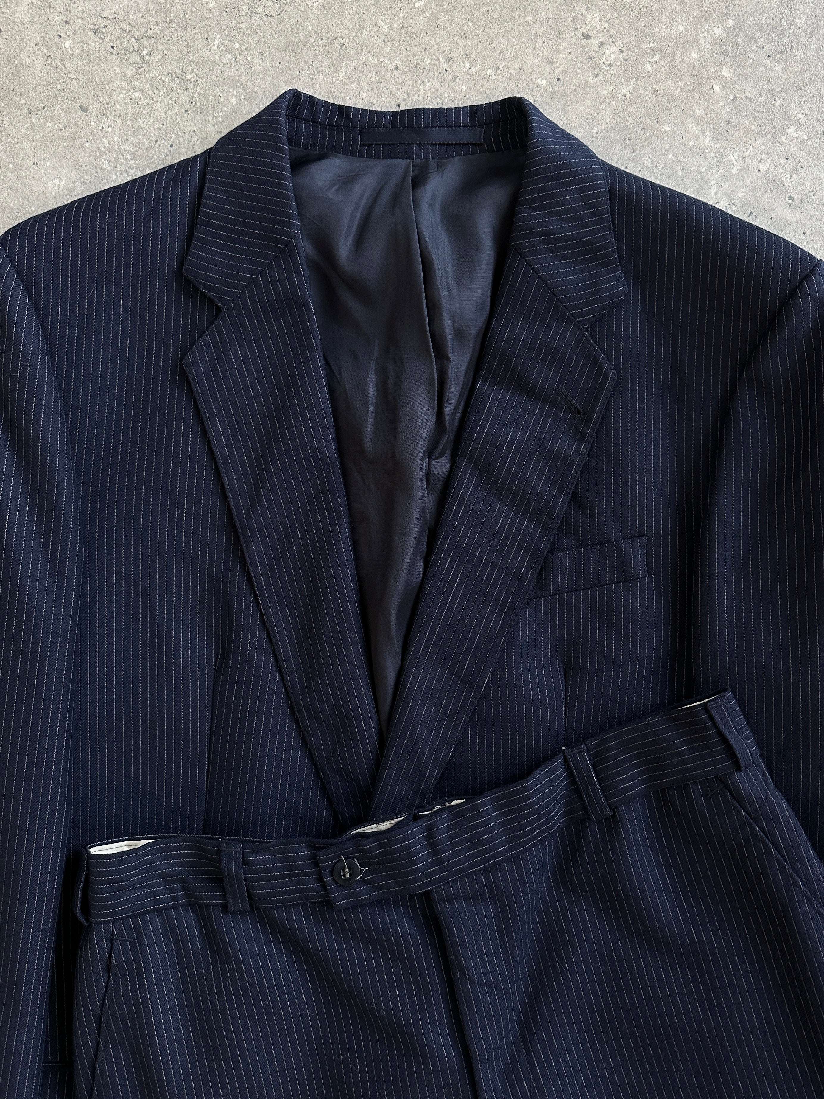 A vintage navy pinstripe two piece suit from the 1990s in a structured pure wool fabric with a clean tailored silhouette. The deep navy tone makes it an easy styling piece for both smart and casual wear.