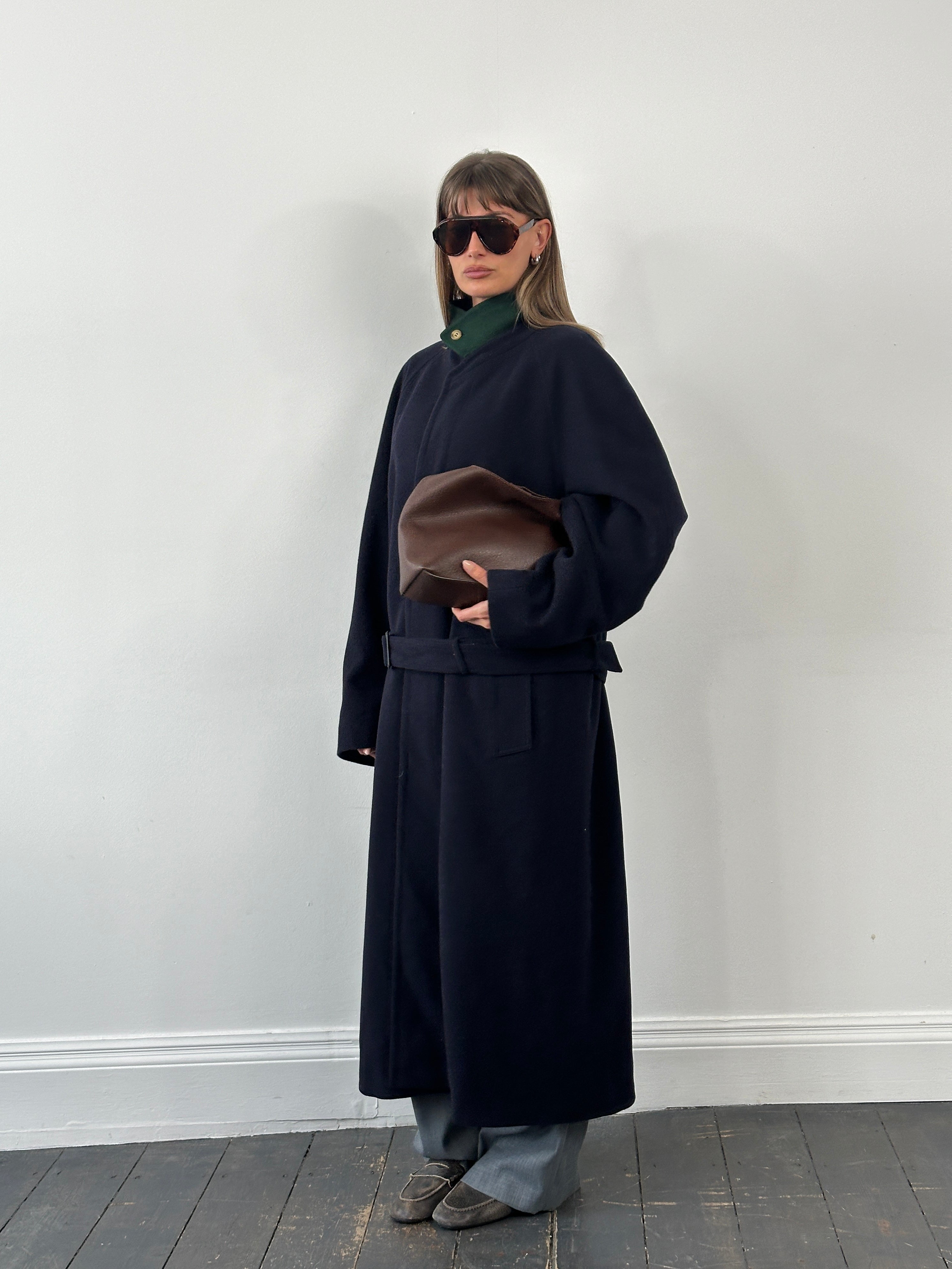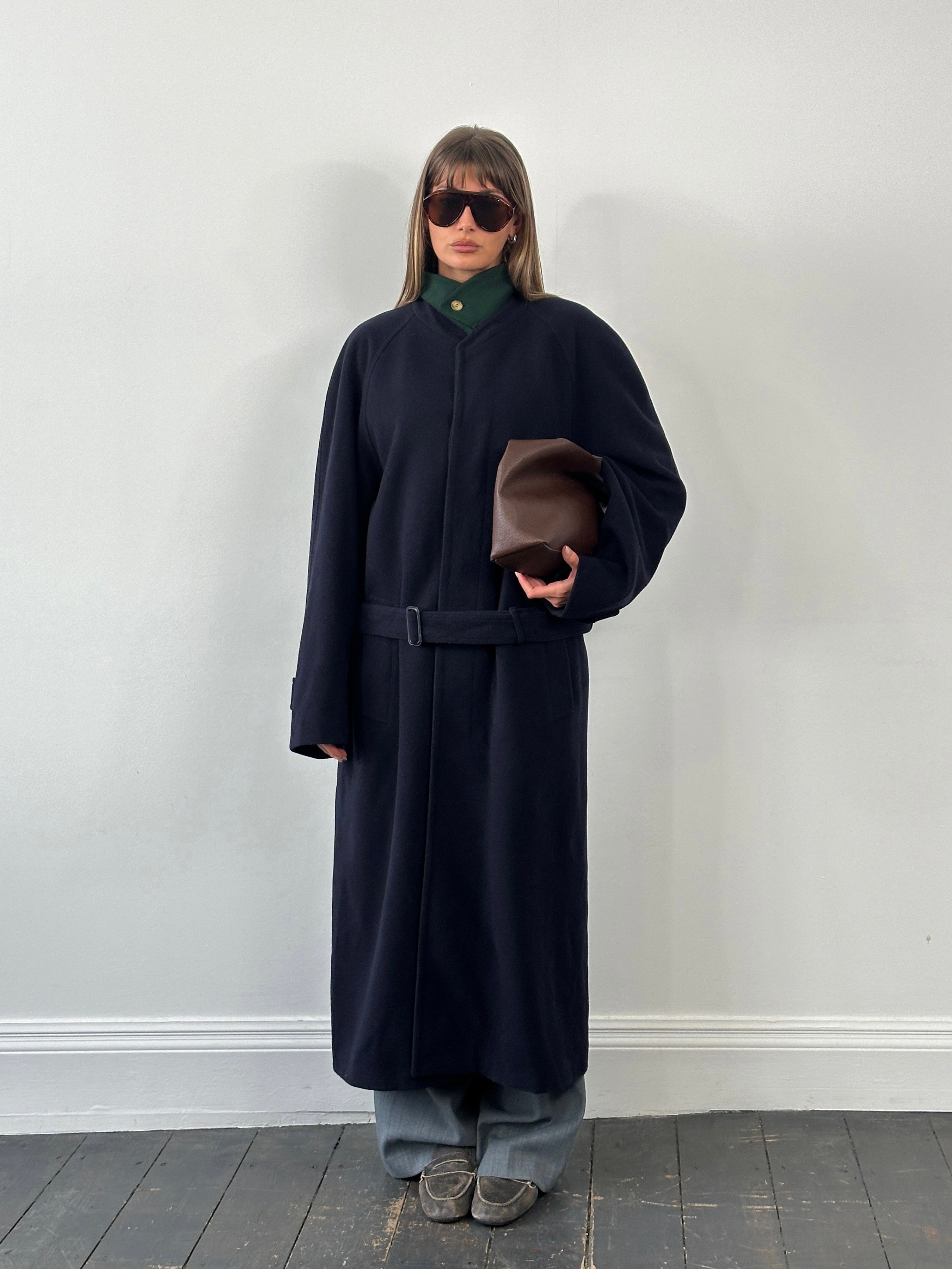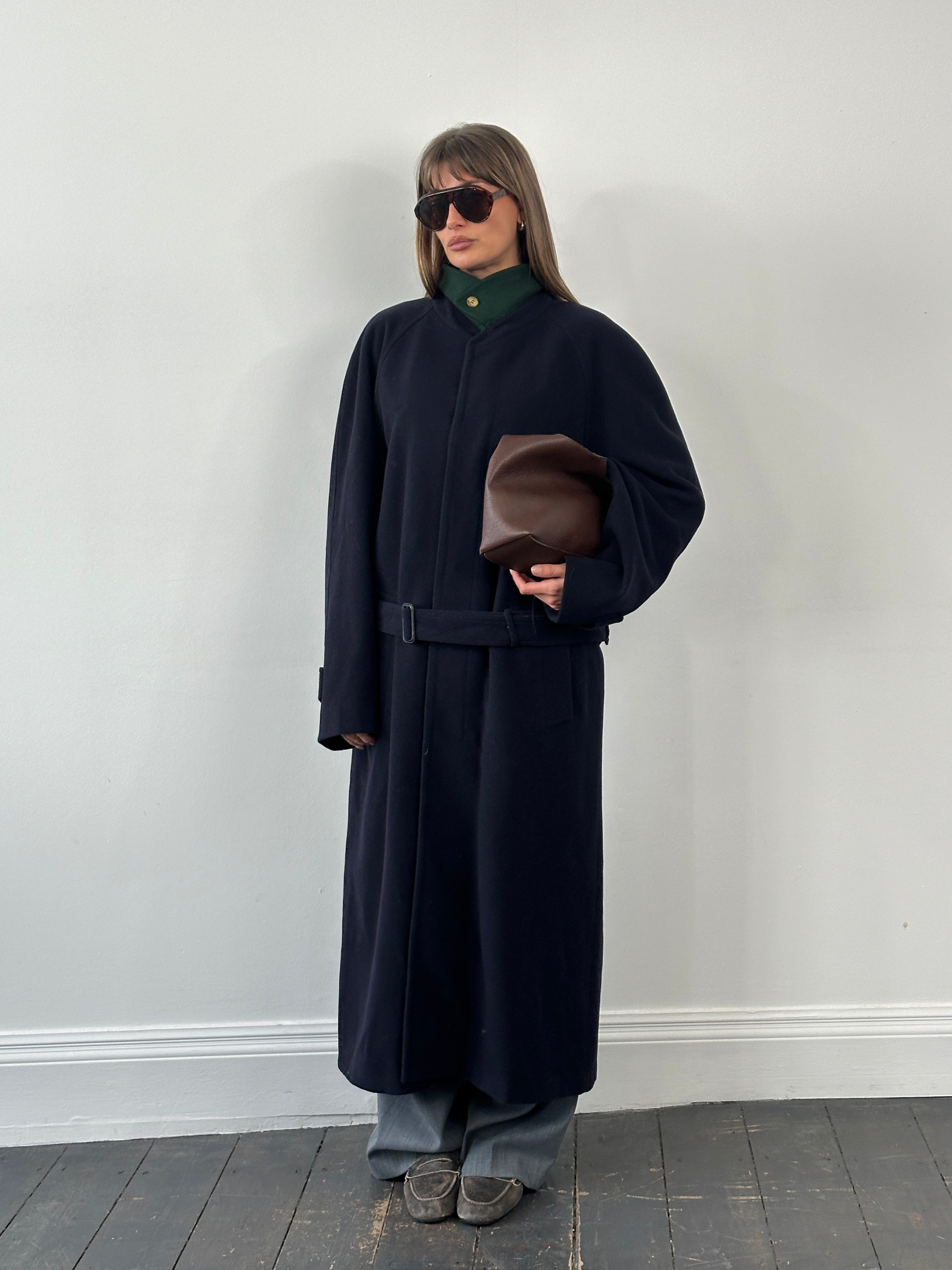 Vintage Bugatti 1990s navy longline coat with a concealed front placket and optional contrast green high neck fastening. Clean structured silhouette in a pure wool fabric with waist belt.