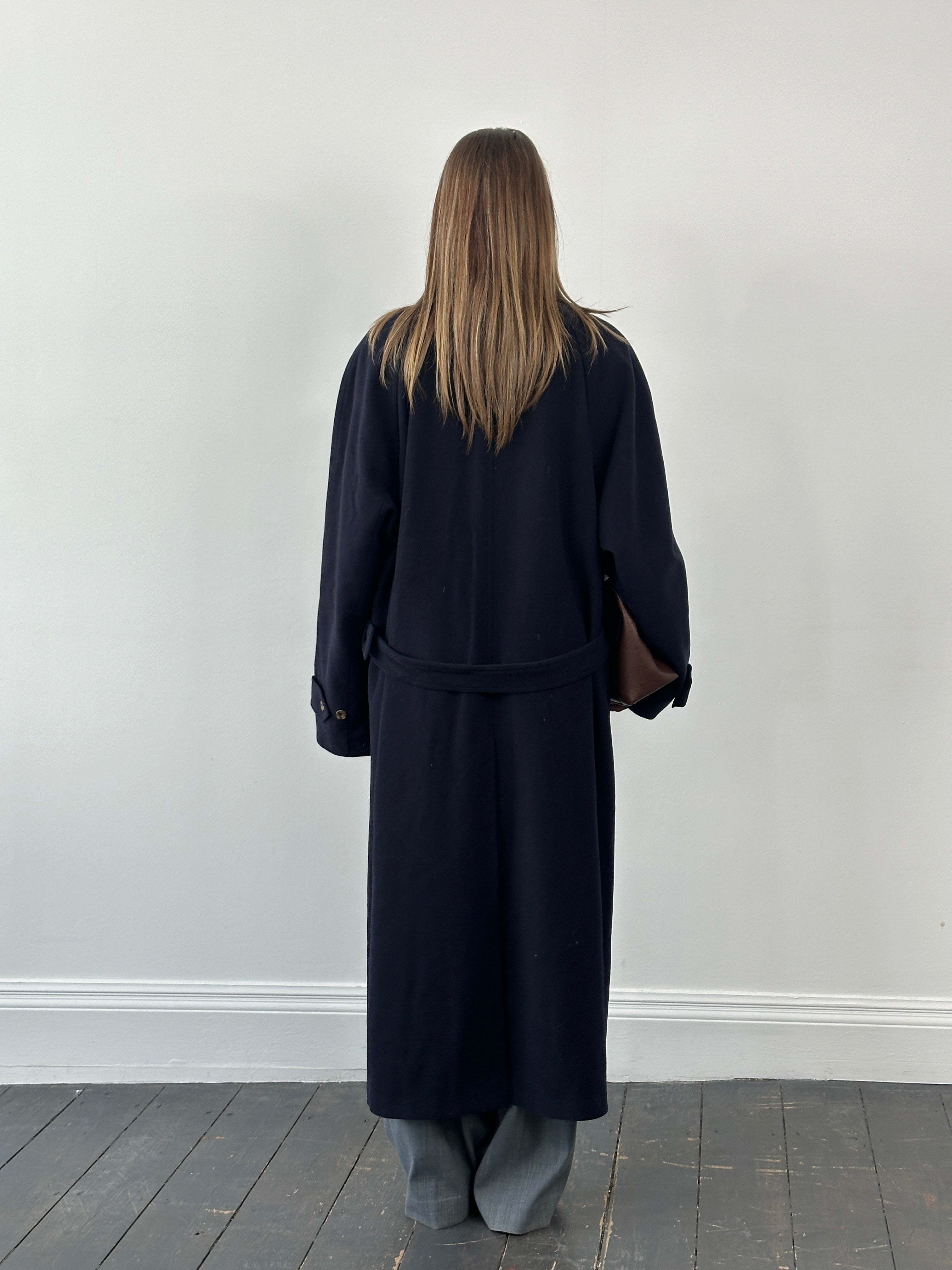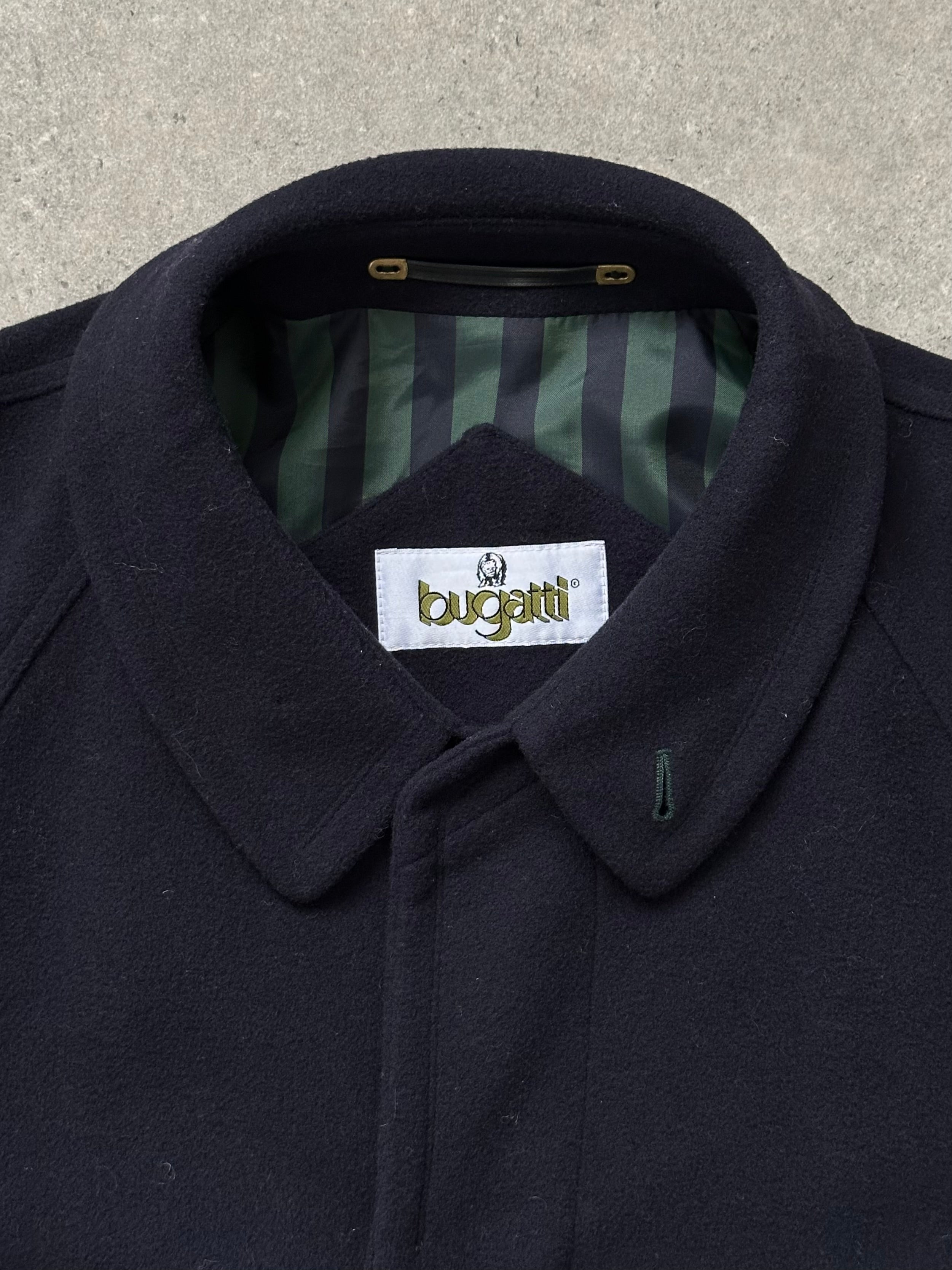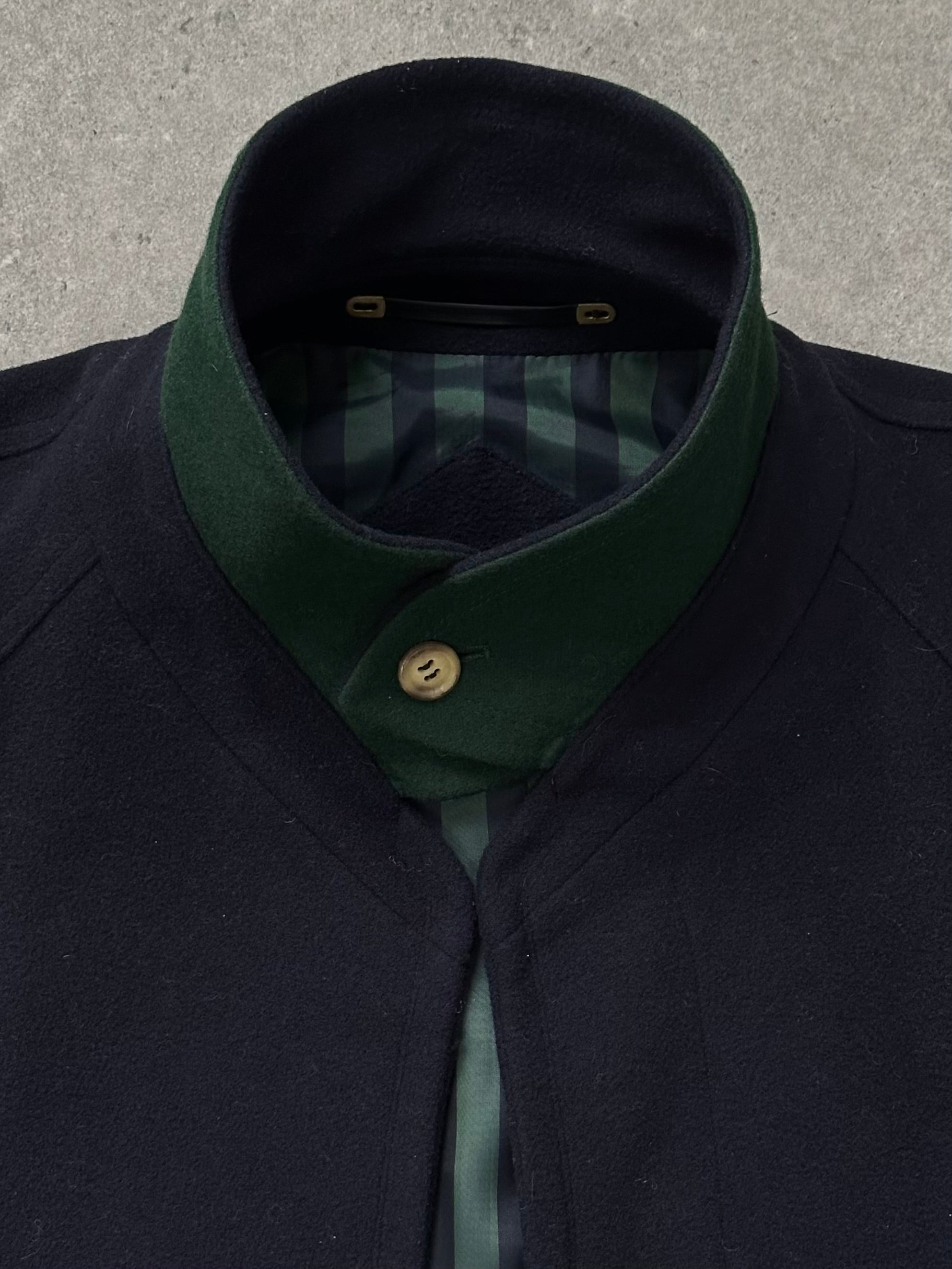 Vintage Bugatti 1990s navy longline coat with a concealed front placket and optional contrast green high neck fastening. Clean structured silhouette in a pure wool fabric with waist belt.