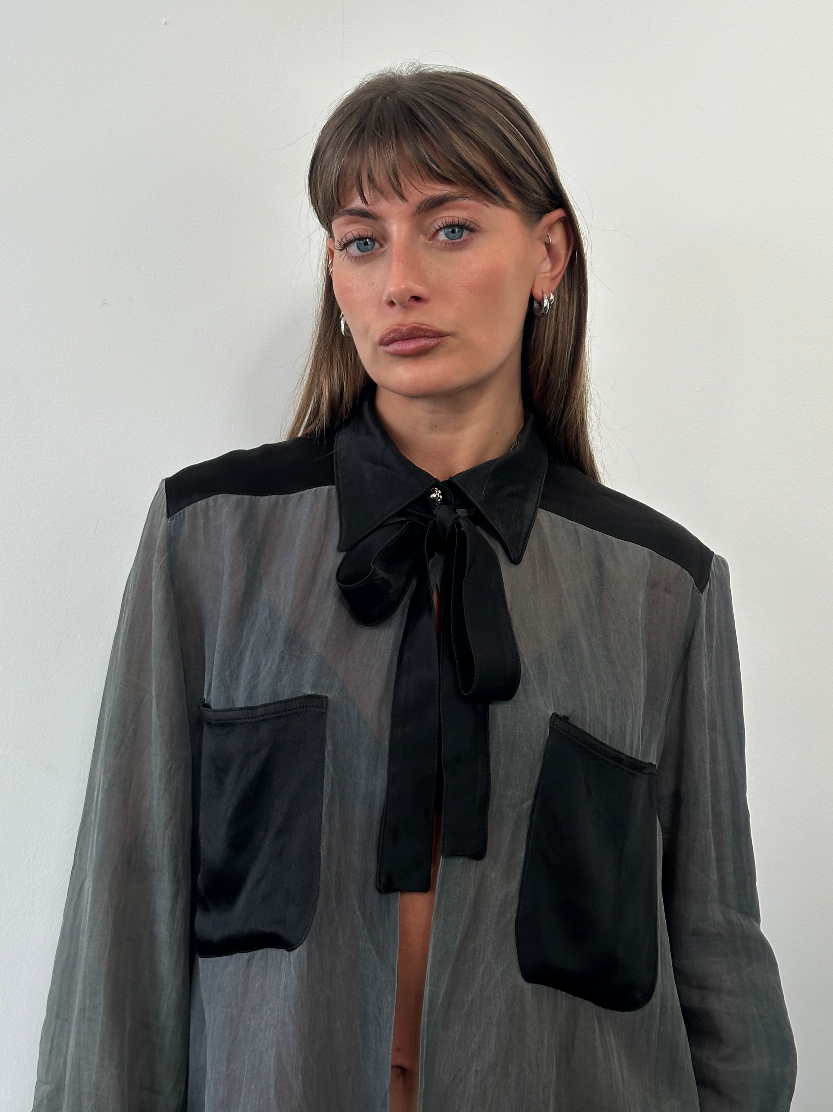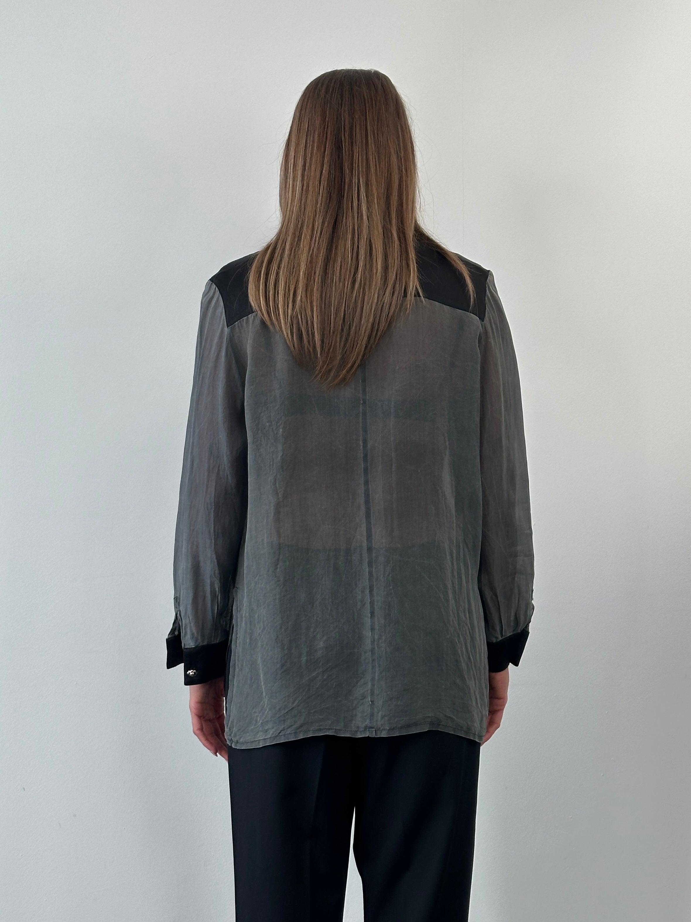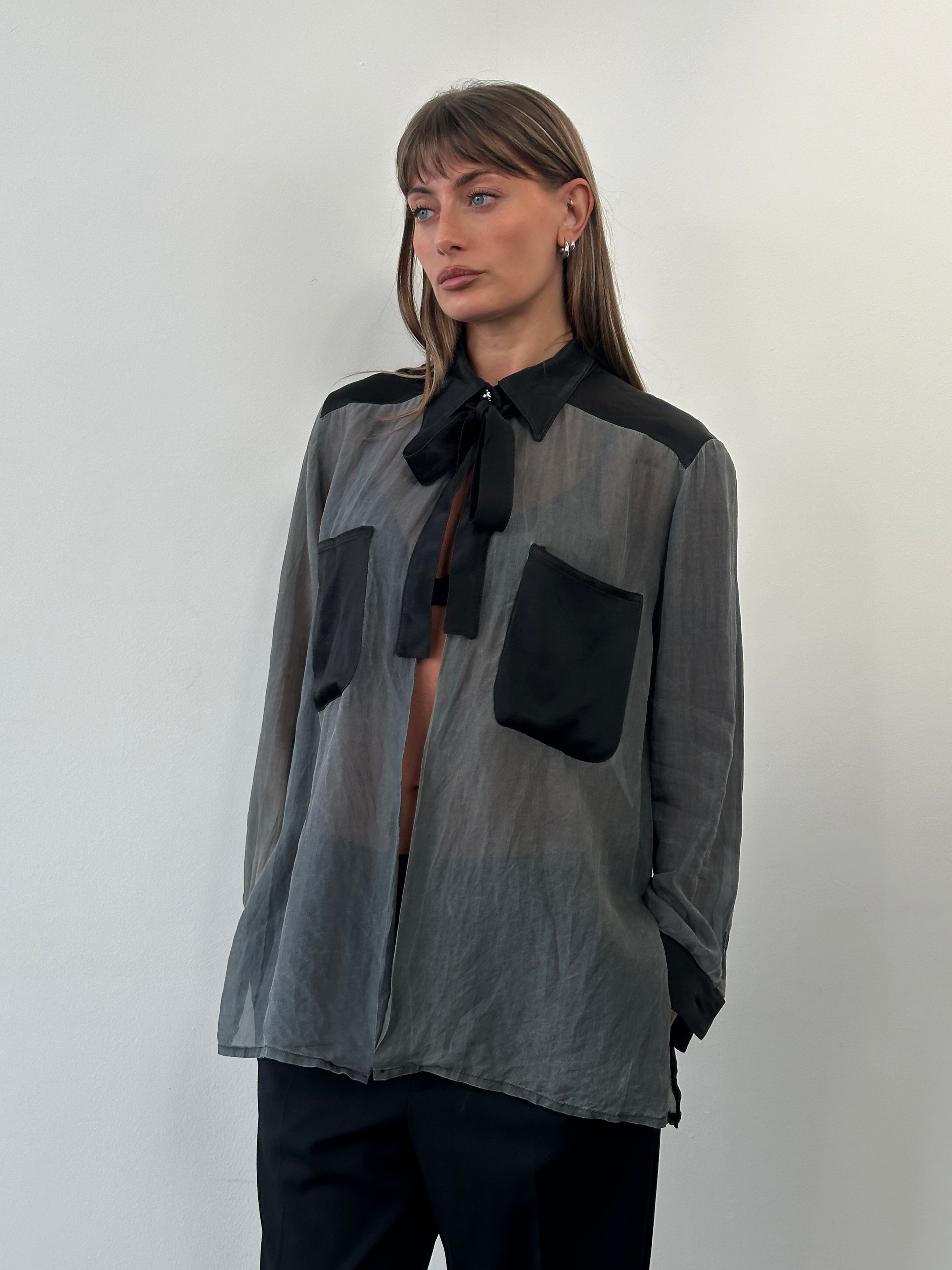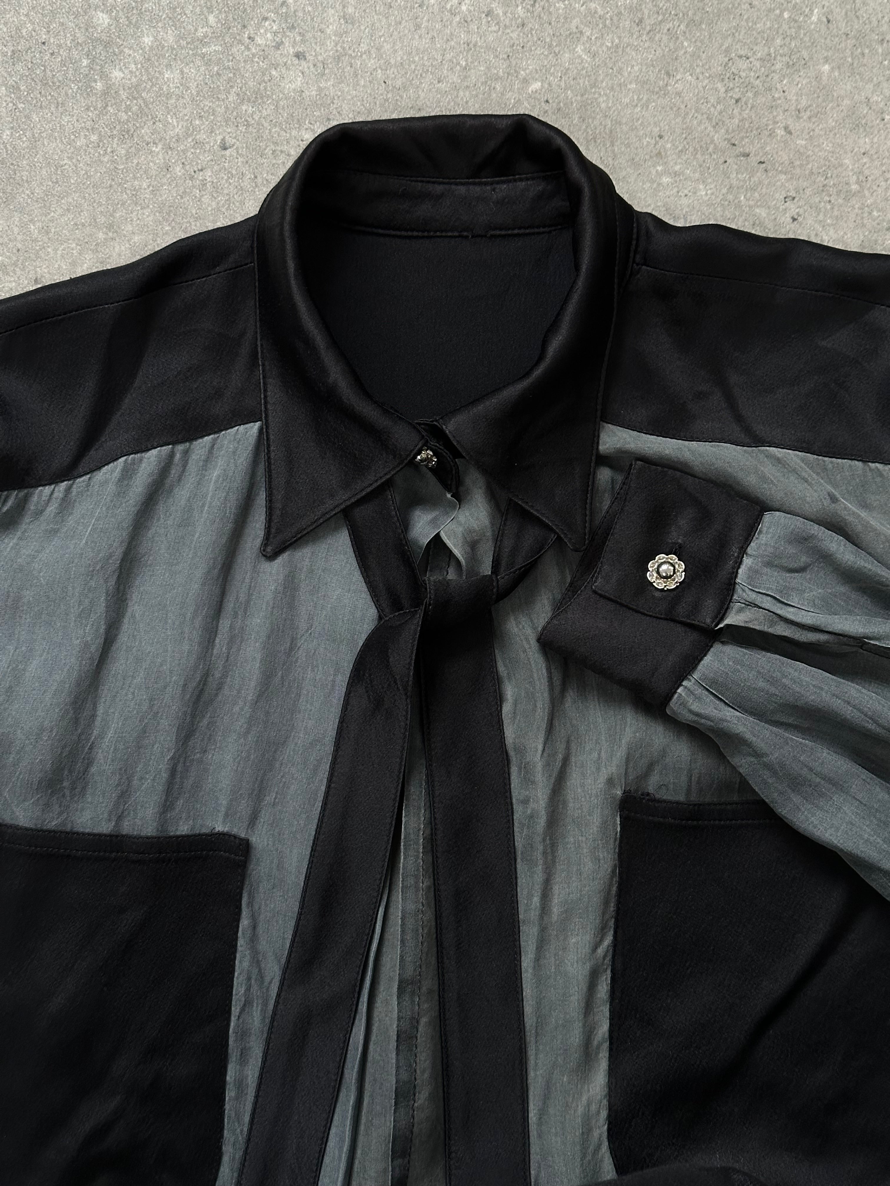 Vintage 1990s green and black satin shirt with sheer panel detailing and a soft fluid drape. Designed with an open front secured by a single silver button, finished with an integrated neck tie, pointed collar, and long sleeves.