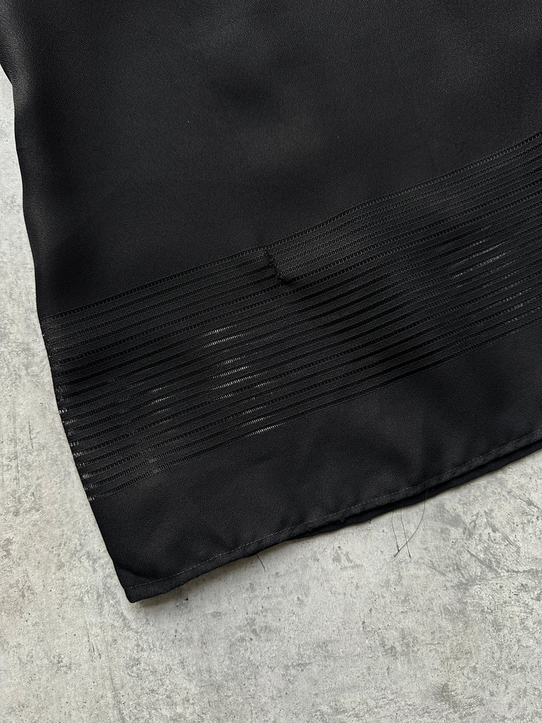 Vintage black sheer long sleeve top featuring a rolled collar, subtle stripe panels at the hem and sleeves and a minimal zip-back fastening. A clean lightweight 1990s piece with a contemporary feel.