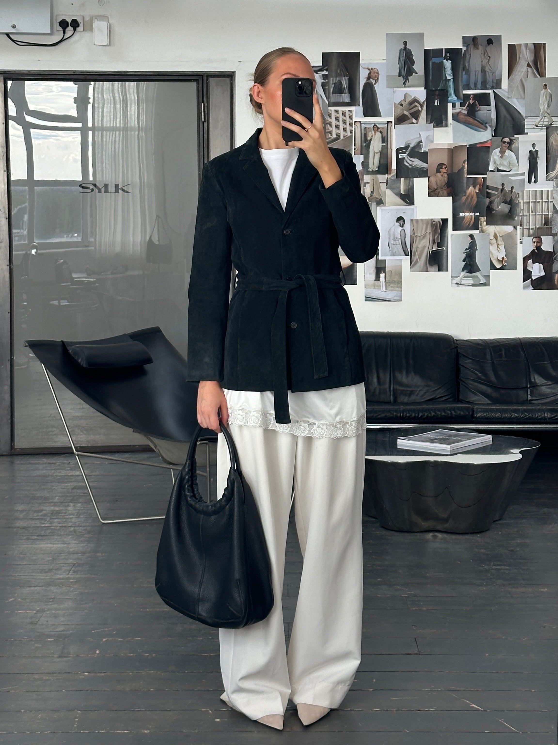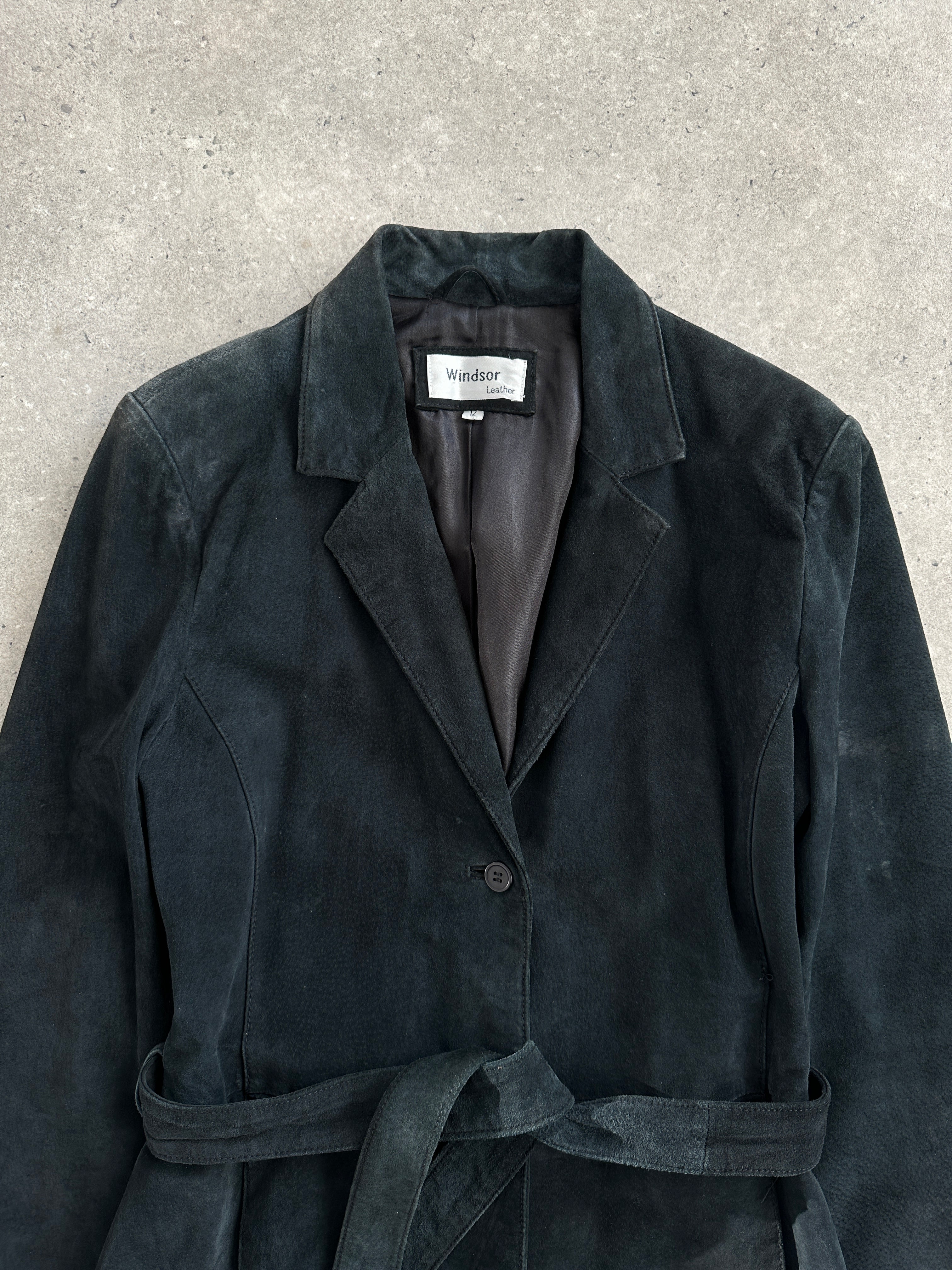 A refined Windsor suede jacket in deep navy, tailored with a belted waist for effortless structure and timeless sophistication.