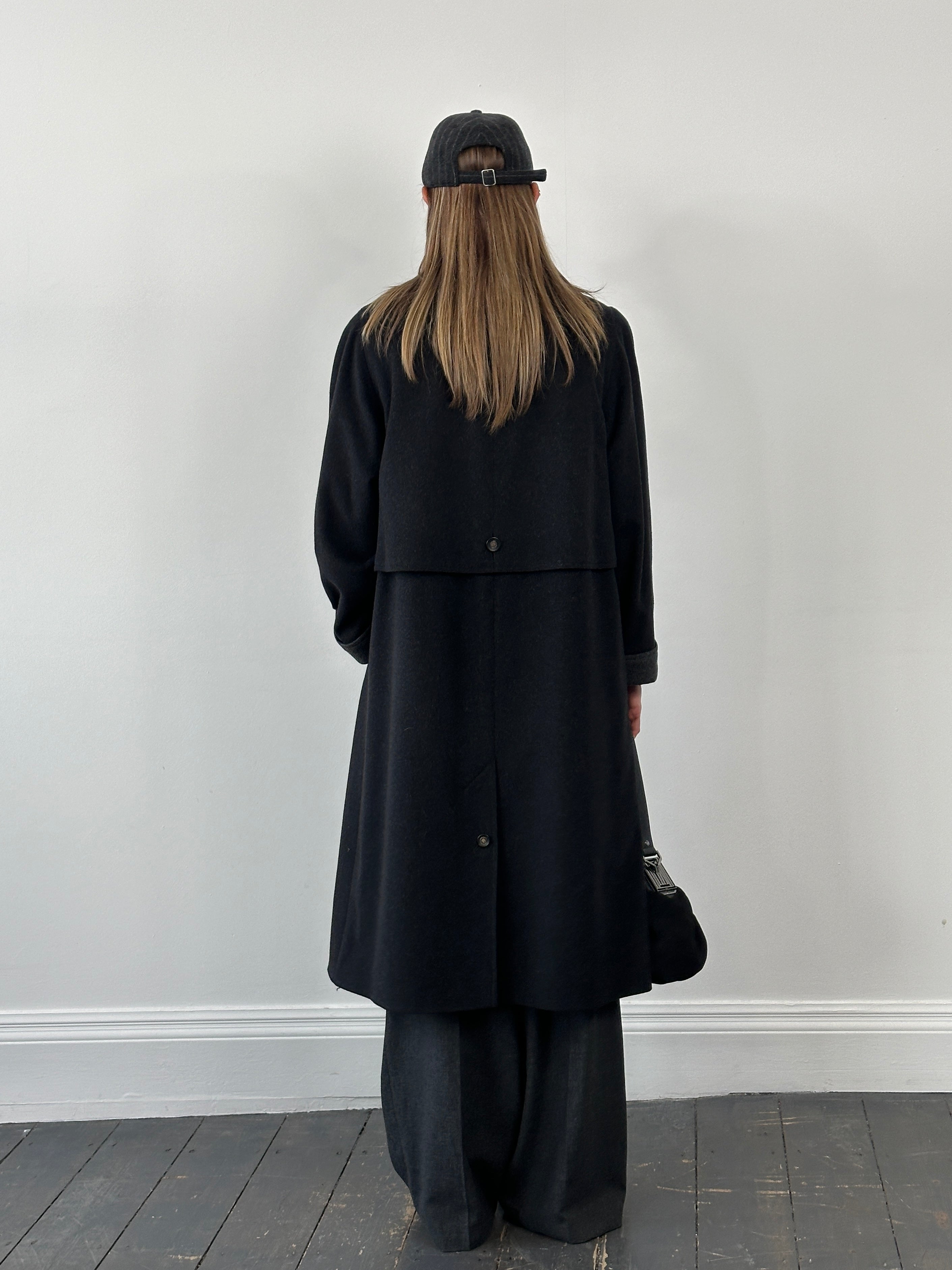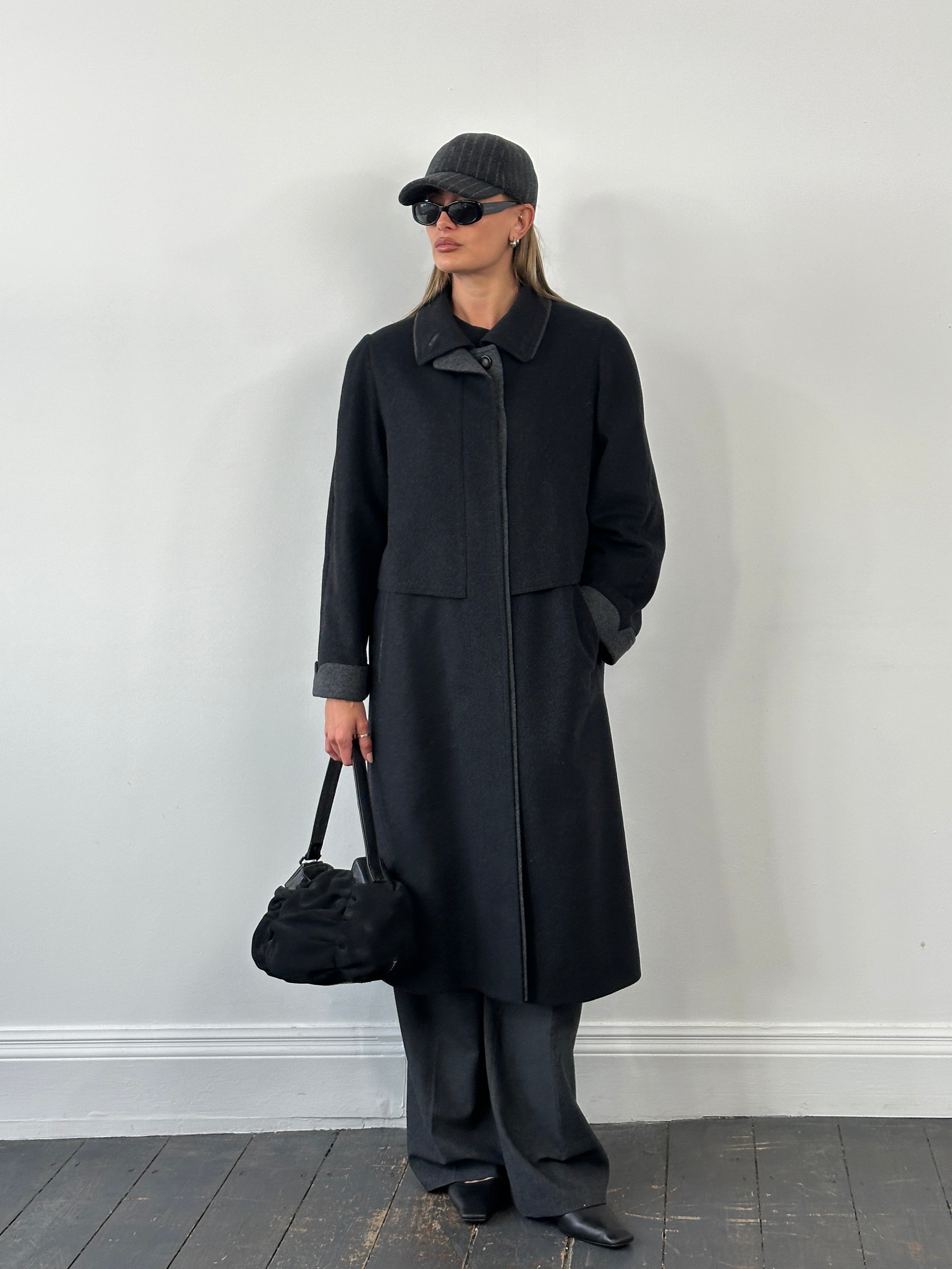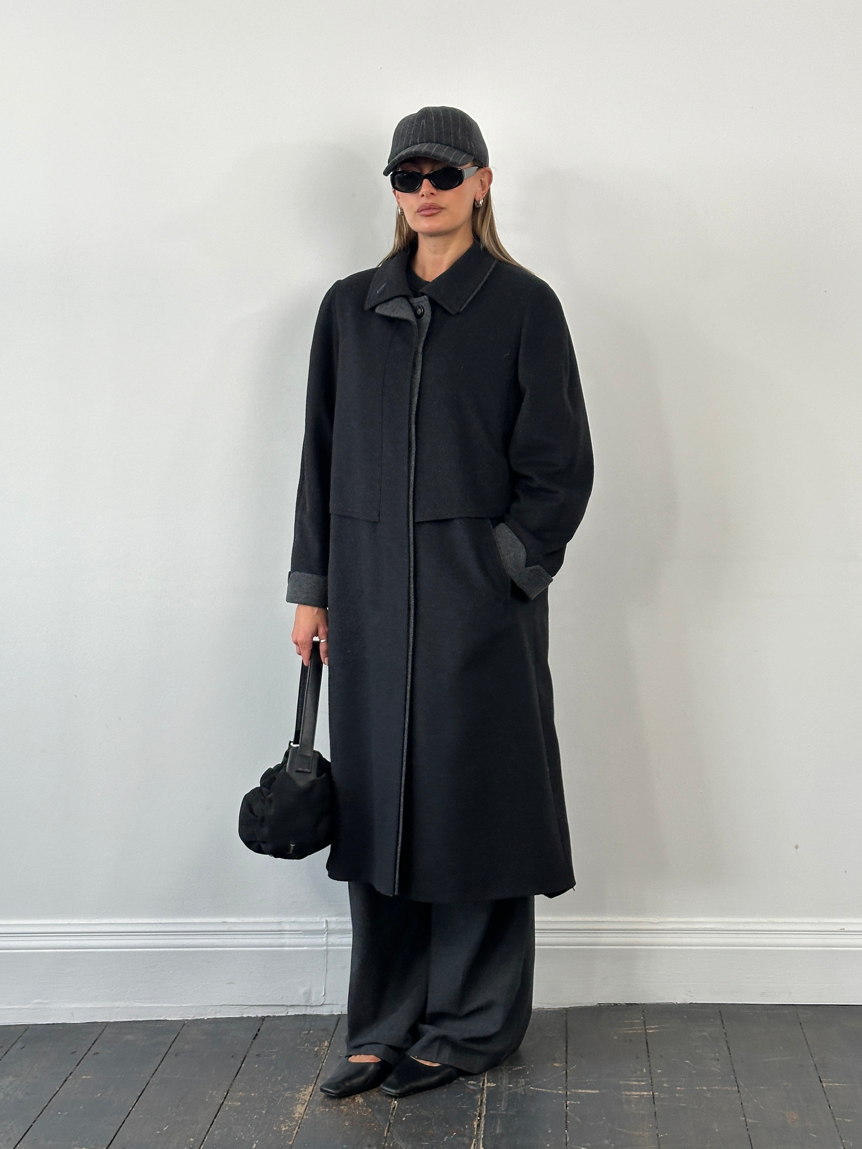 Vintage 1990s concealed placket coat with a longline silhouette and subtle contrast detailing through the double placket and cuffs. Partially lined with a wool check interior.