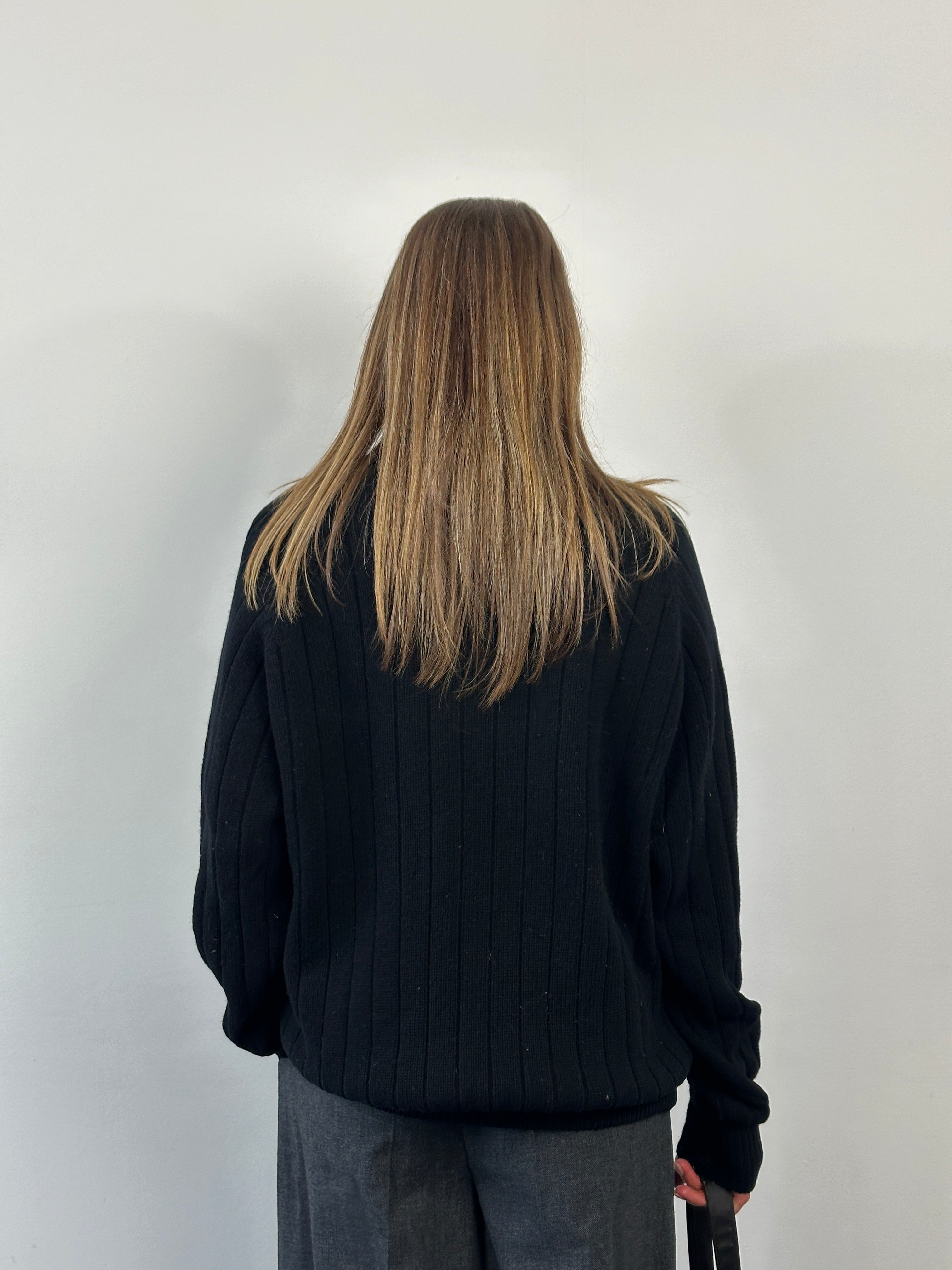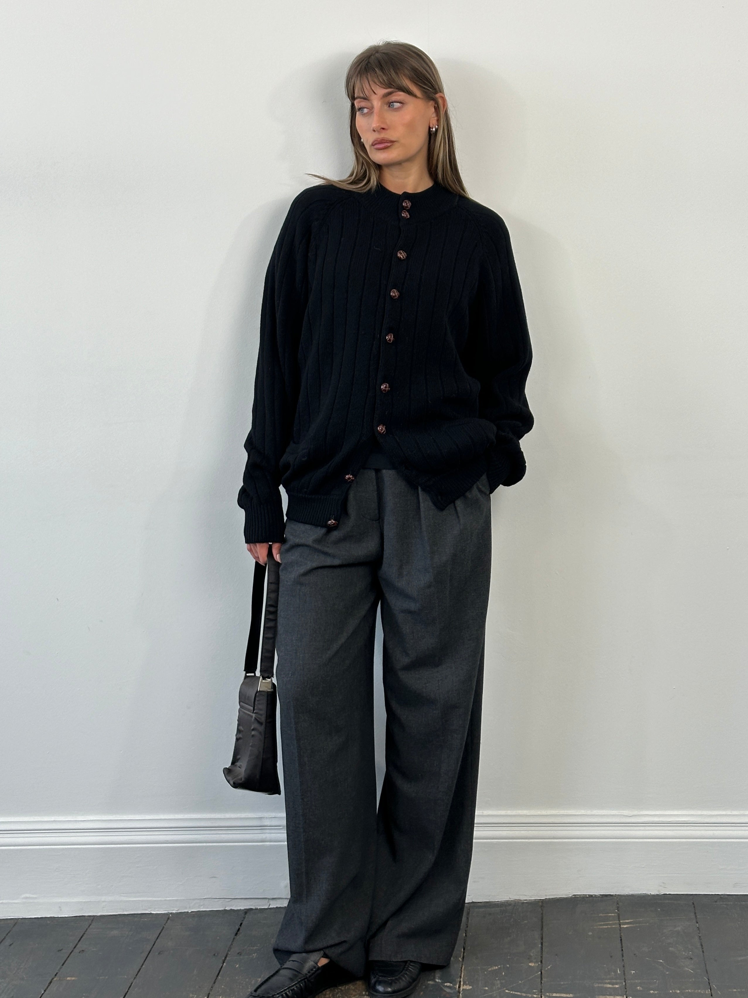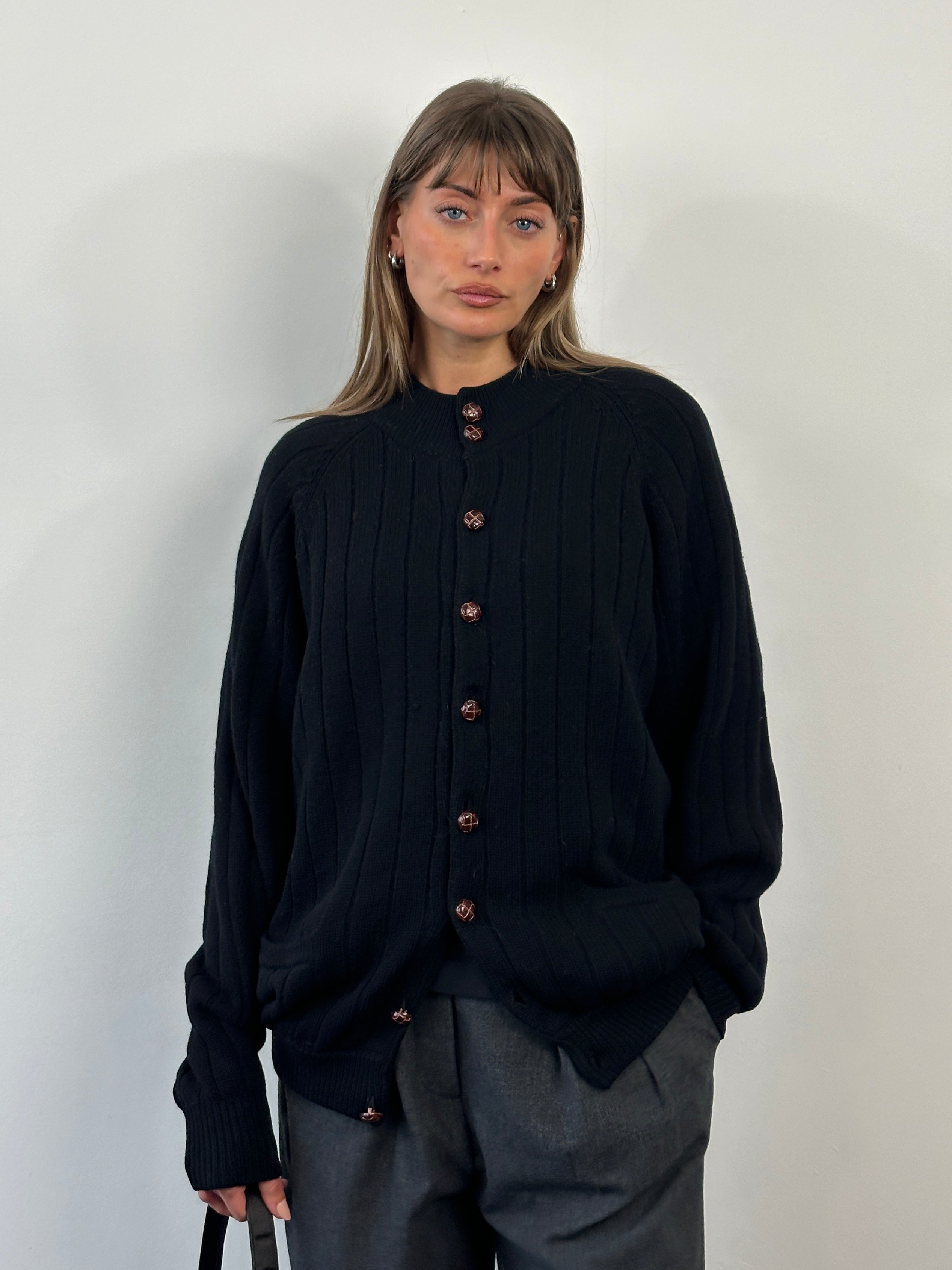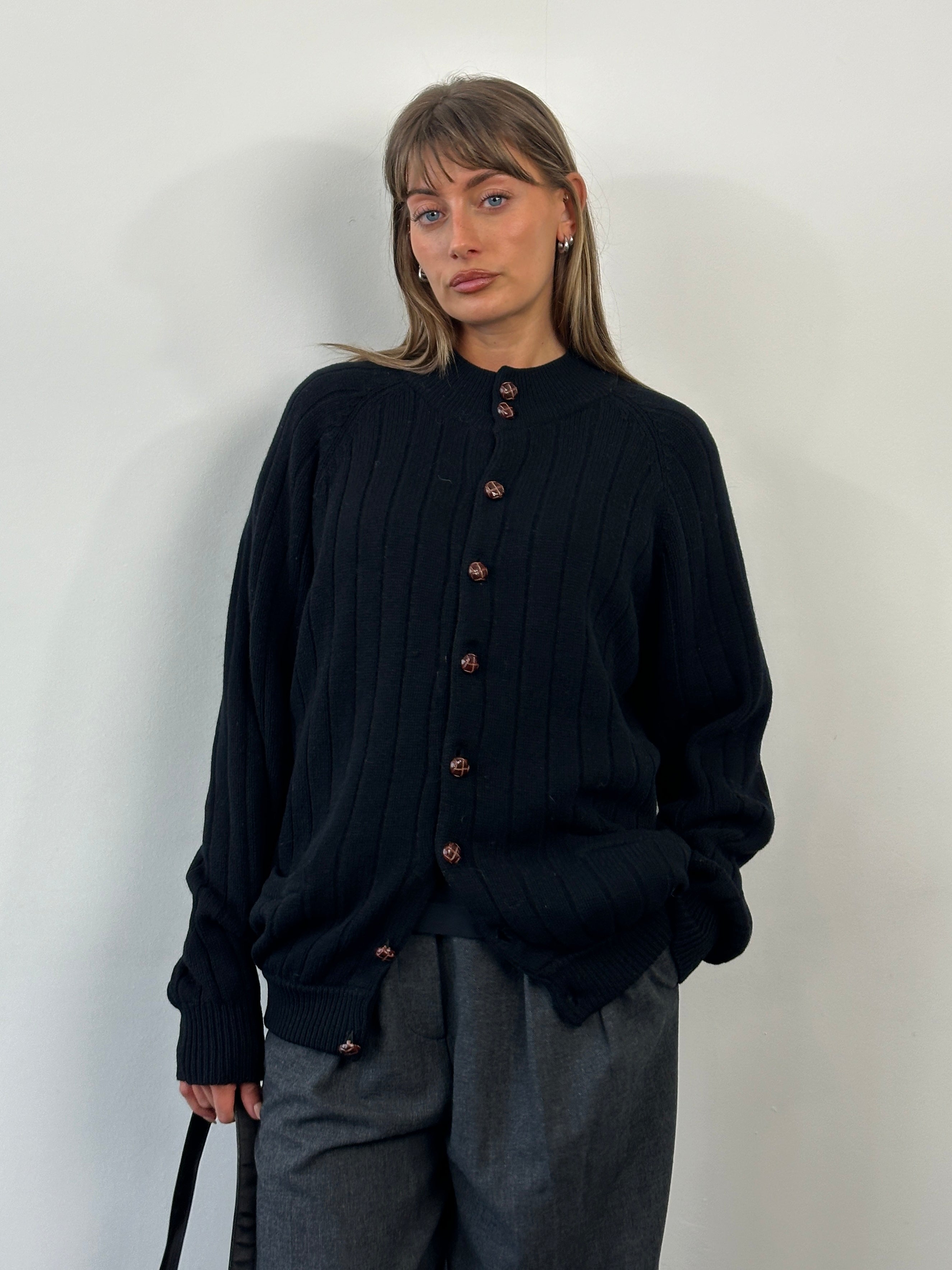 A black 2000s vintage knitted cardigan by Ten Yards, made from pure lambswool and finished with brown leather buttons and two front patch pockets. Designed with a classic crew neckline, ribbed trims, and a substantial midweight handle.