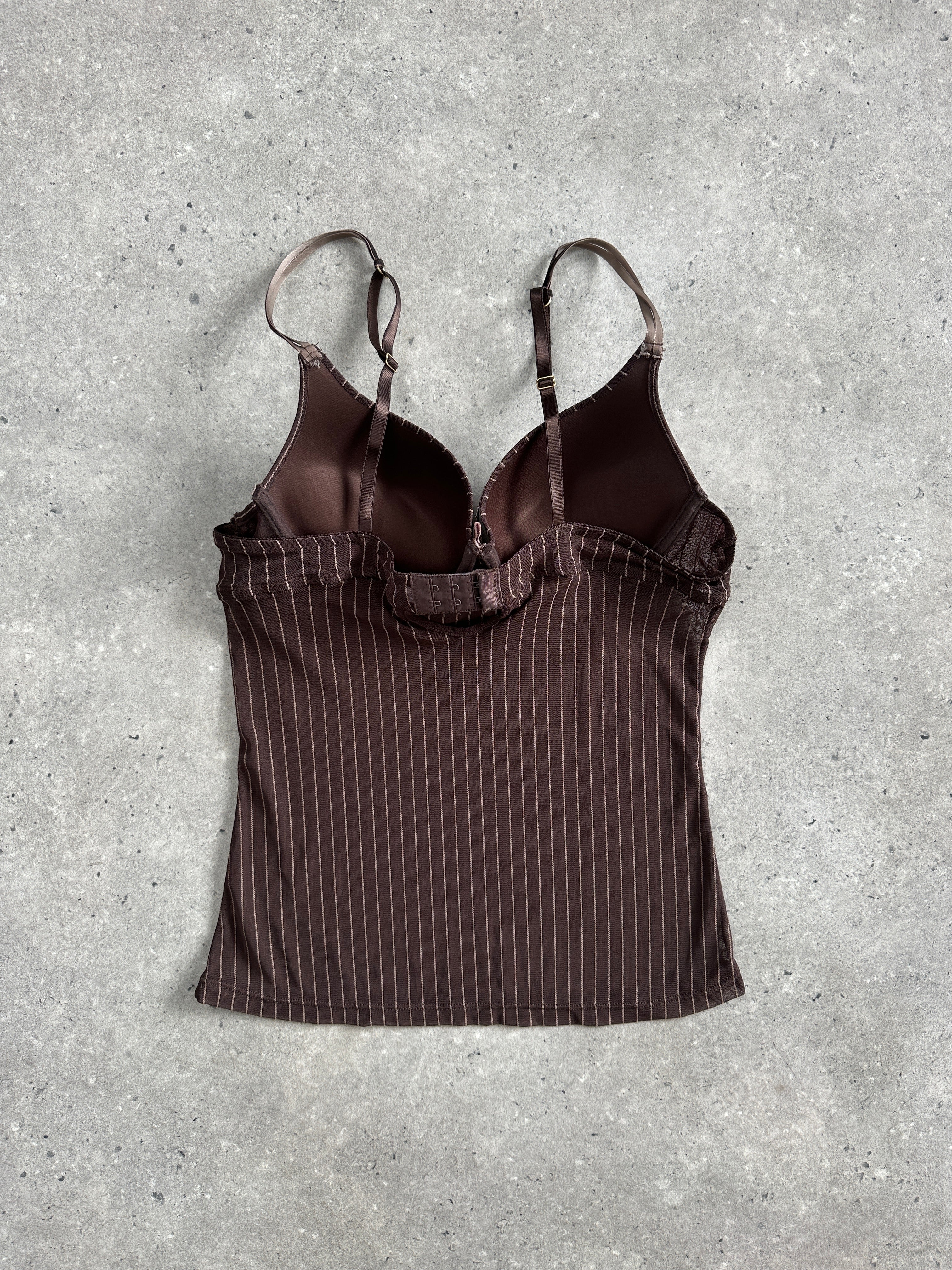 A lingerie-inspired pinstripe cami, cut from sheer mesh with structured underwire cups and a fitted silhouette. The blend of tailoring references and delicate transparency creates a bold yet refined Y2K aesthetic.
