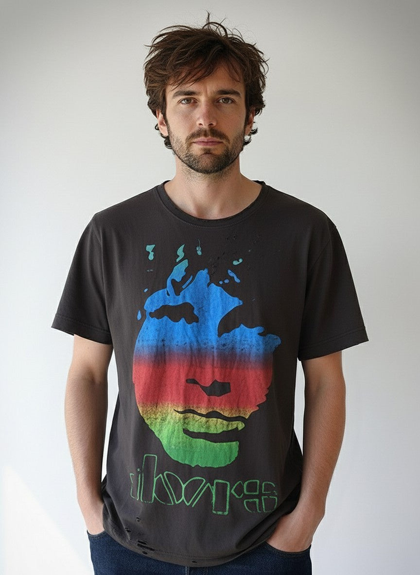 This original black vintage "The Doors" t-shirt captures the iconic rock band's timeless style with authentic retro appeal. Designed for a UK size small fit, it features classic band artwork printed on comfortable, high-quality fabric. Perfect for collectors and music enthusiasts, this tee blends vintage authenticity with everyday wearability.