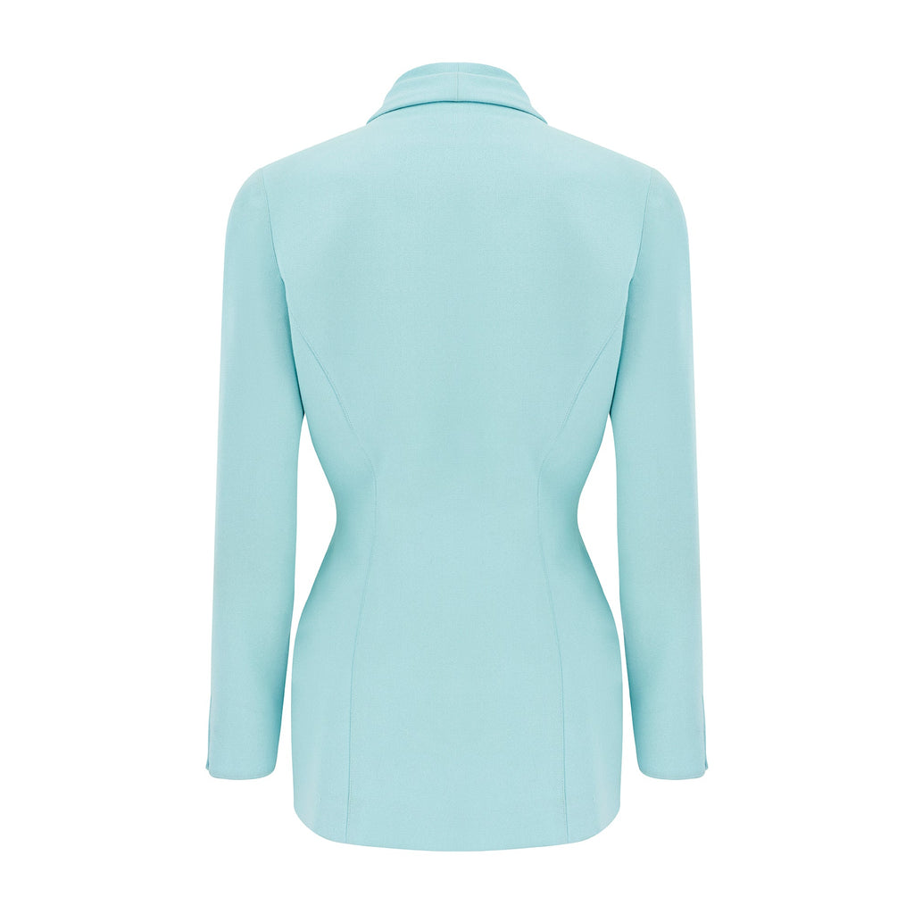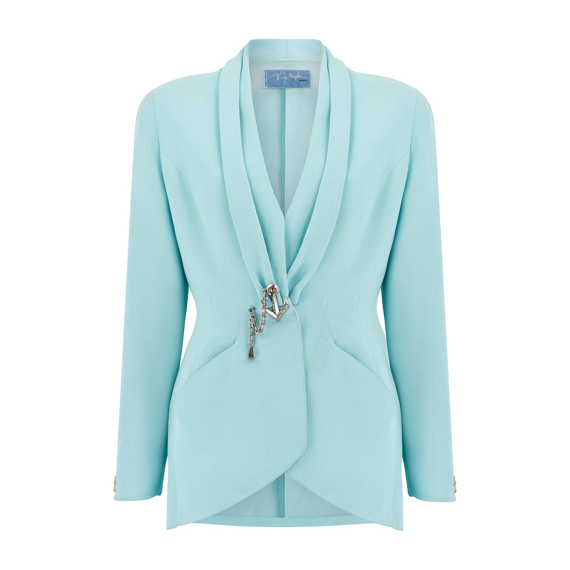 This 1990s Thierry Mugler turquoise blazer jacket draws in the waist and adds volume around the hips, emphasising and highlighting the feminine figure - a silhouette instantly recognisable as Mugler to those in the know. The shawl collar is generously draped and falls to the waist where it meets an elaborate buckle. The waist closes with two hidden metal snap closures and is embellished with a chunky silver-tone metal brooch in the shape of an anchor; a silver-tone anchor rode falls from it complete with weight. The sleeves are split, fastened by a hidden stud closure and each decorated with a silver-tone metal anchor. The jacket has a panelled construction, with the front seams following the curves of the body. Two front slip pockets are hidden within the lines of the seams. Lined with tonal turquoise satin, the pale blue label reads “Thierry Mugler Paris”.