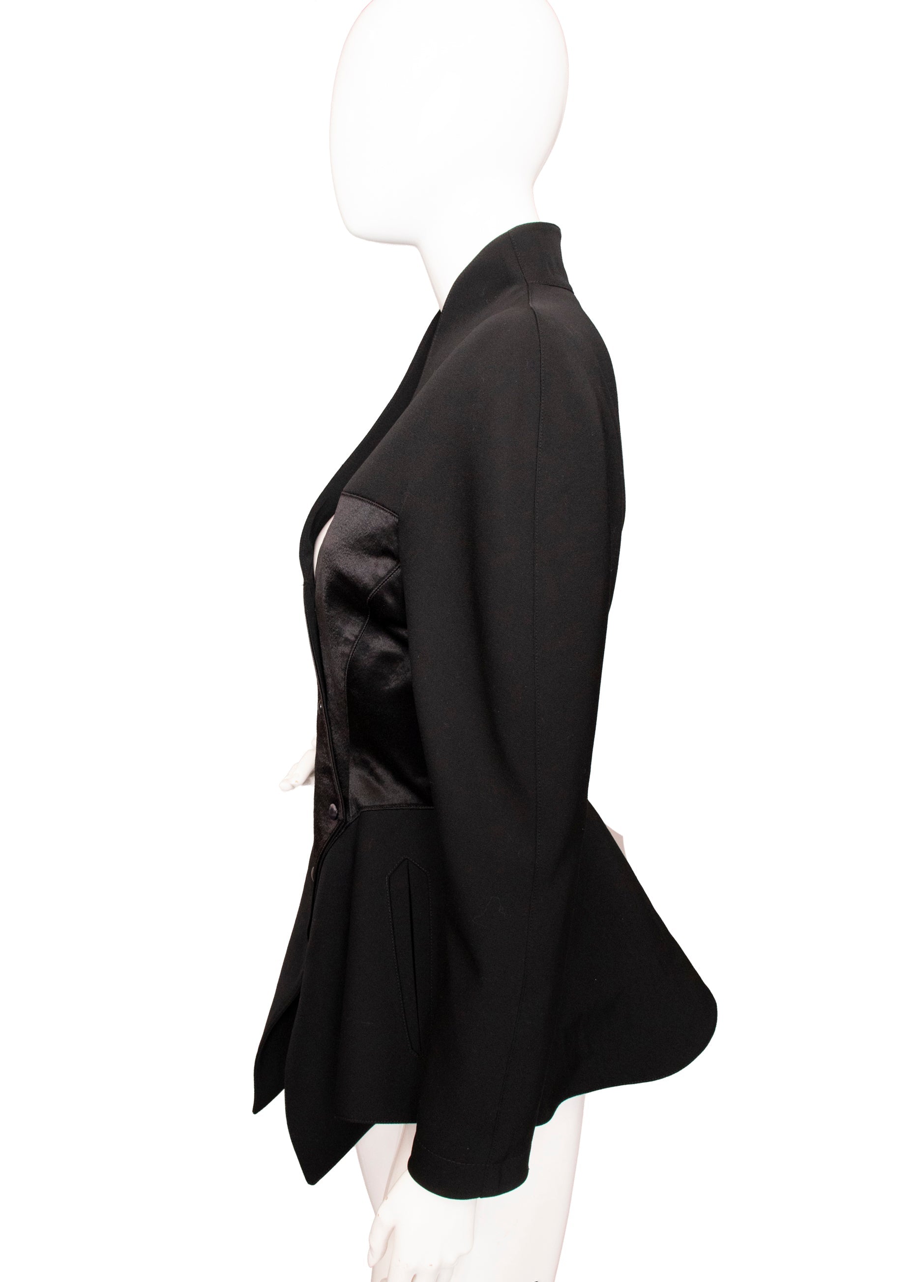 This striking Thierry Mugler jacket showcases the designer's iconic architectural approach to tailoring. Crafted from luxurious worsted wool and viscose satin, it commands attention with dramatically sculpted shoulders and an unexpected asymmetric peplum detail. The innovative construction includes an asymmetric snap closure, a high standing collar with a daring plunge neckline, and signature padded-free shoulders that create a powerful silhouette. Practical touches like lined hip pockets and five front metal snaps add functionality to this statement piece.