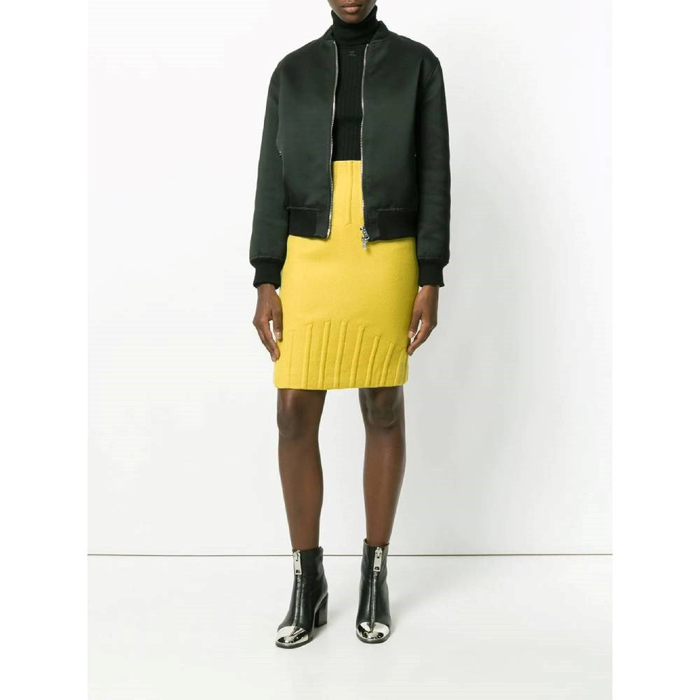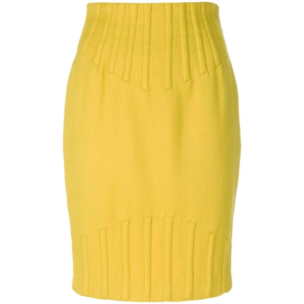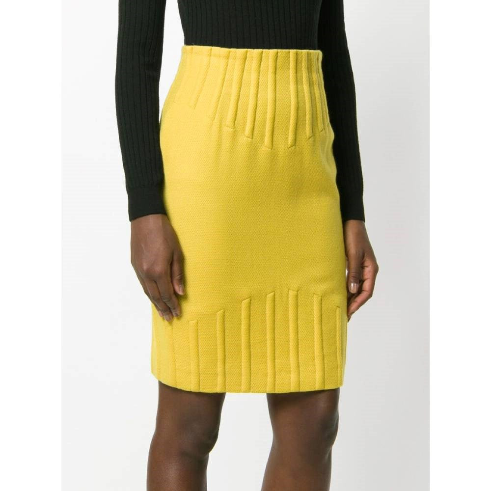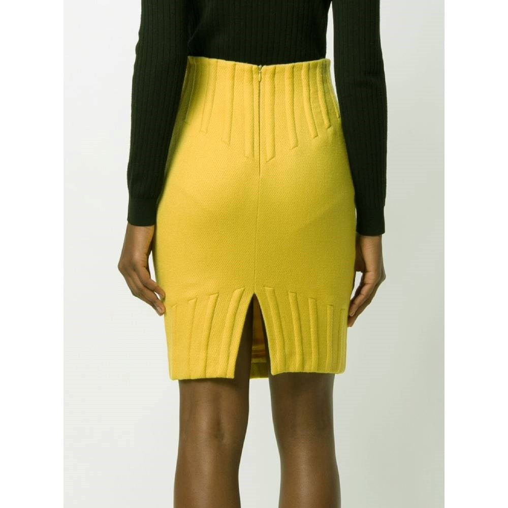 Thierry Mugler yellow wool tube 80s skirt with high waist and embossed details on the waist and on the hem. Back zip fastening and slit.