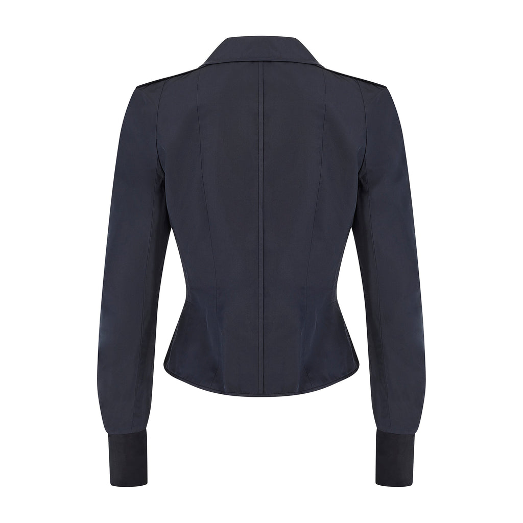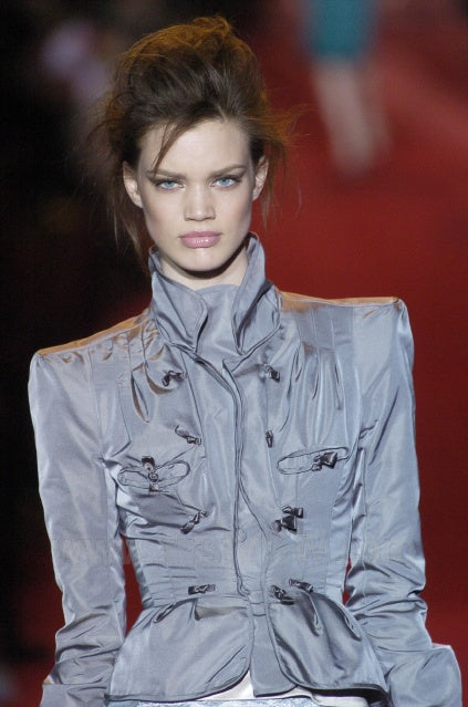 The jacket has panelled construction and a flared, peplum waist which creates an hourglass shape on the wearer. Tailored from pure silk in a deep charcoal black, it is a shorter style jacket which holds its impeccably tailored shape and is finished with elaborate details. The front fastens with knotted black velvet ribbons and fabric loops which add a decadence typical of Ford’s designs for the house. It has curved, layered lapels and an extra hidden lapel which can be buttoned up to the collar to create a higher, closed neckline at the front - this lapel fastens with hidden pearlescent grey buttons. This collection brought back Saint Laurent’s dramatic, pointed shoulder that curves upwards like the roof of a pagoda and which was made famous by his Chinese collection in 1977. The sleeve is finished with an elongated, soft black cuff which falls elegantly over the hand. At the bust, there are two embroidered details which look like faux-slit pockets. These are also adorned with knotted black velvet fastenings and fabric loops. This jacket is fully lined in black silk.