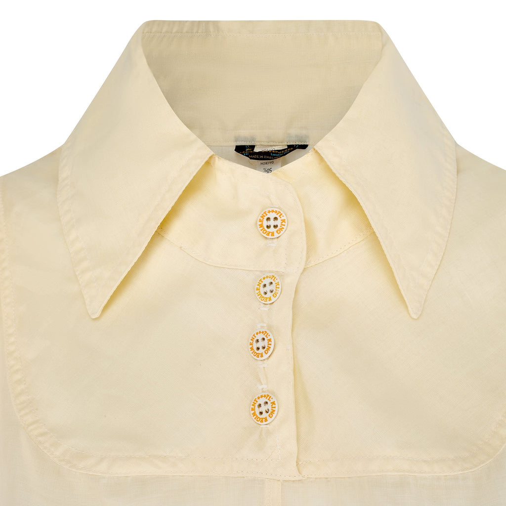 This 1970s voluminous shirt is by celebrated British designer Jeff Banks and is loosely tailored from breezy semi-sheer cotton-dacron in a pale yellow hue. This sporty top has a bibbed, polo-shirt neckline; the wide collar and open neckline secured with four white buttons printed with the words “king regiment 7L” in orange font. The sleeves play to the era’s penchant for bohemian tailoring and are wide and billowing bell-sleeves with an elasticated cuff. The top is cut to a laid-back, slouchy fit and falls to a cropped length that has a panelled bottom hem containing a drawstring in tonal cotton. The top is unlined.